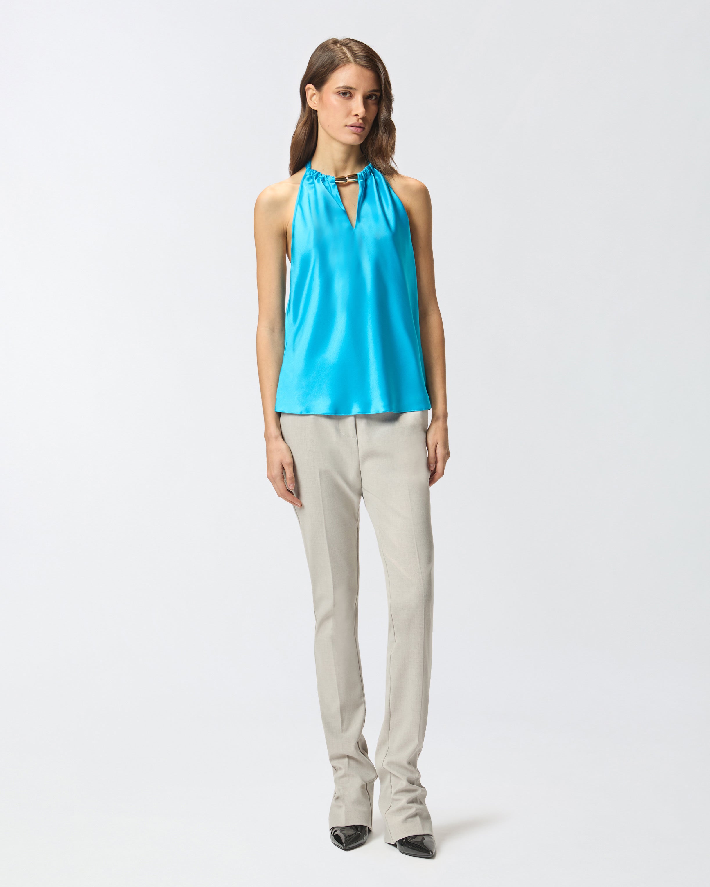 Top morbido senza maniche con scollo all'americana impreziosito da boule di metallo. Un tocco di sensualità è dato dalla schiena scoperta accarezzata dala fusciacca legata al collo che cade libera regalando movimento. Il raso lucido conferisce una lucentezza unica e una mano particolarmente morbida al capo. Indossa questo top per un effetto fluido e scivolato che esalta con eleganza e raffinatezza le linee e la silhouette femminile.
