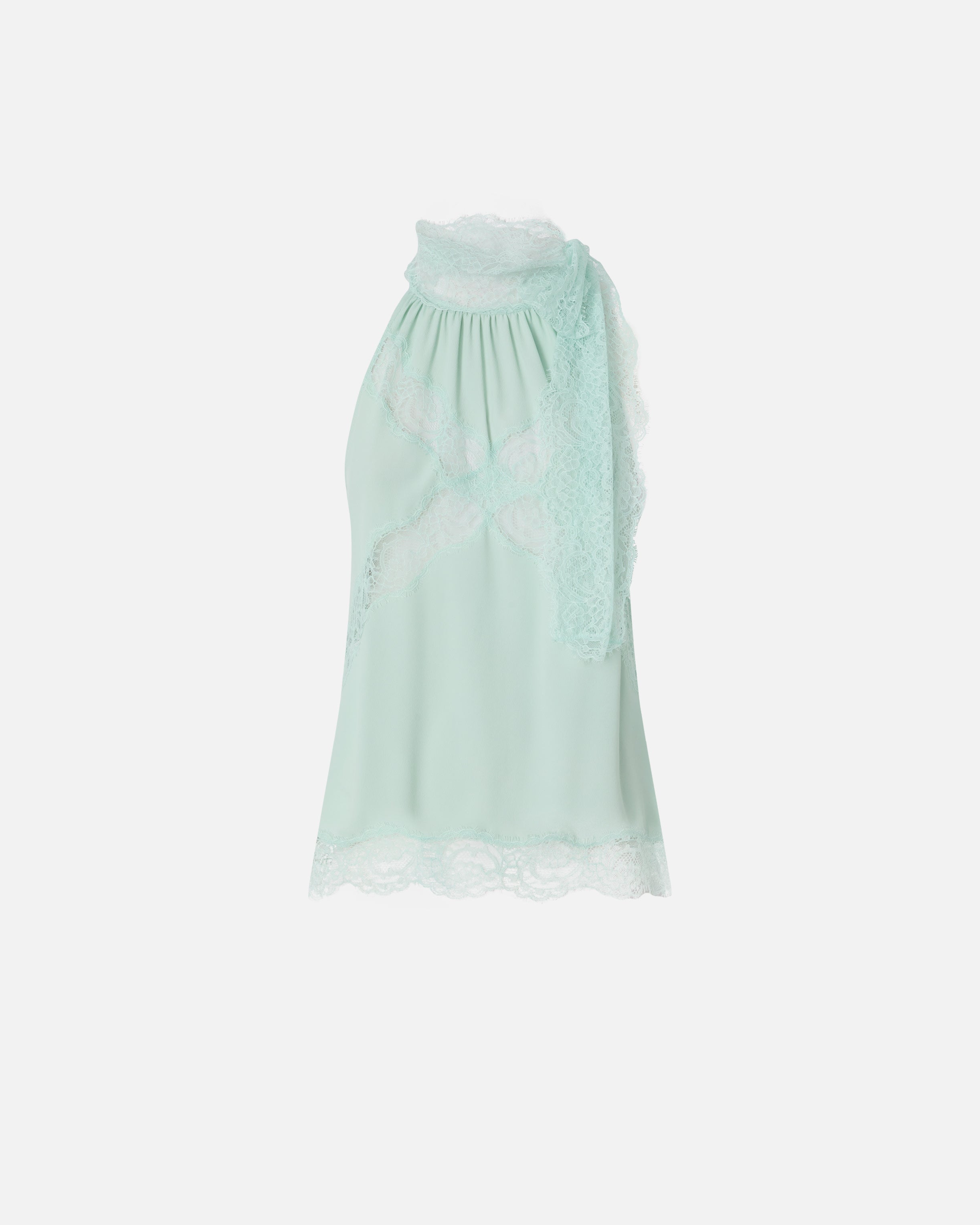 Top senza maniche dalla linea fluida, realizzato in un morbido e raffinato crêpe de Chine di misto seta. Perfetto per completare look da cerimonia e per le occasioni più speciali, questo modello è reso ancora più elegante dallo scollo all'americana e dal pizzo che si avvolge intorno al collo per ricadere in lunghe code da annodare in base al tuo gusto. I dettagli in pizzo, seducenti grazie al gioco di trasparenze, sono ripresi anche sul davanti e sul retro del capo, sotto forma di bande incrociate, e sull'orlo inferiore, sotto forma di delicata bordatura con taglio a vivo che crea un effetto leggermente sfrangiato.