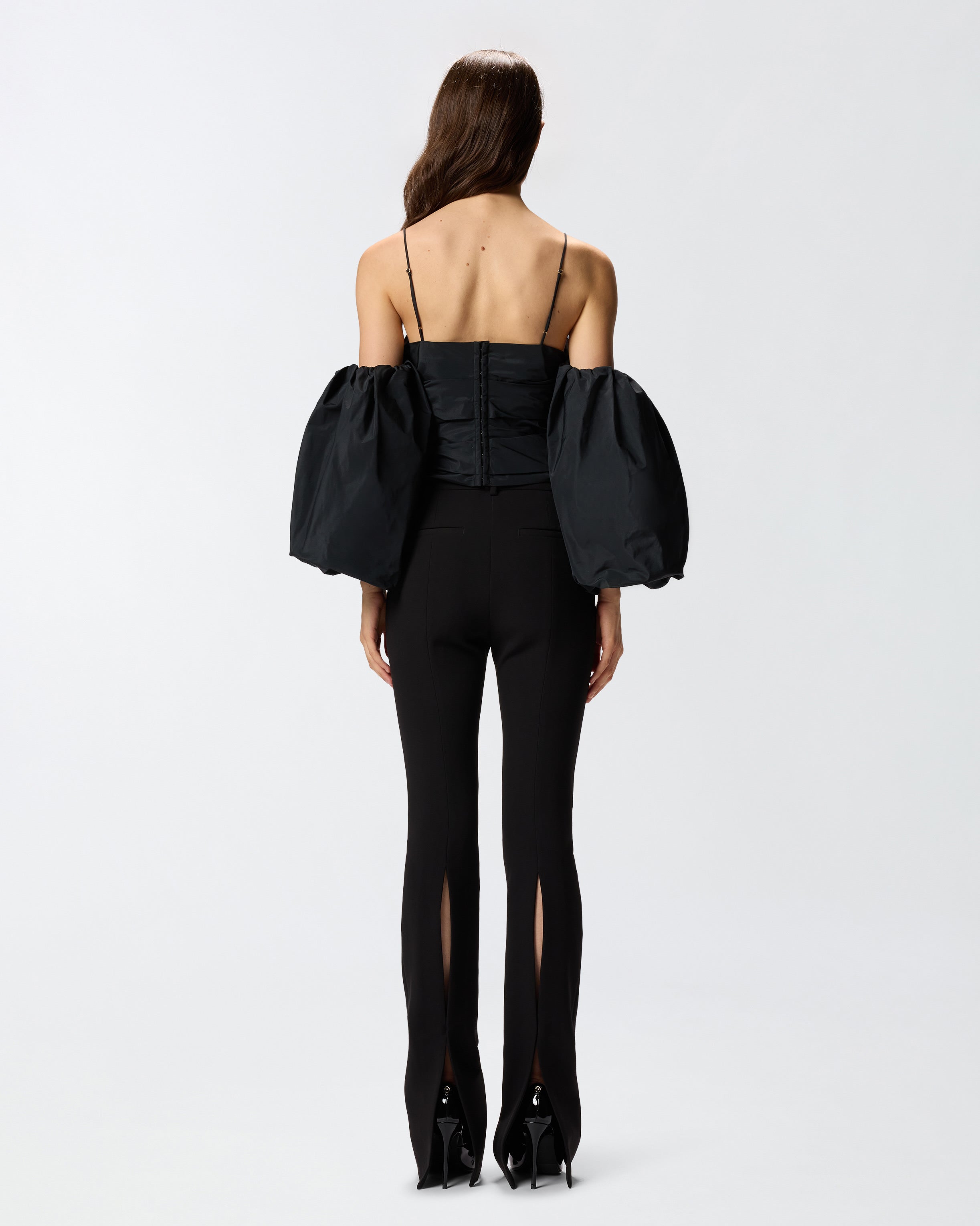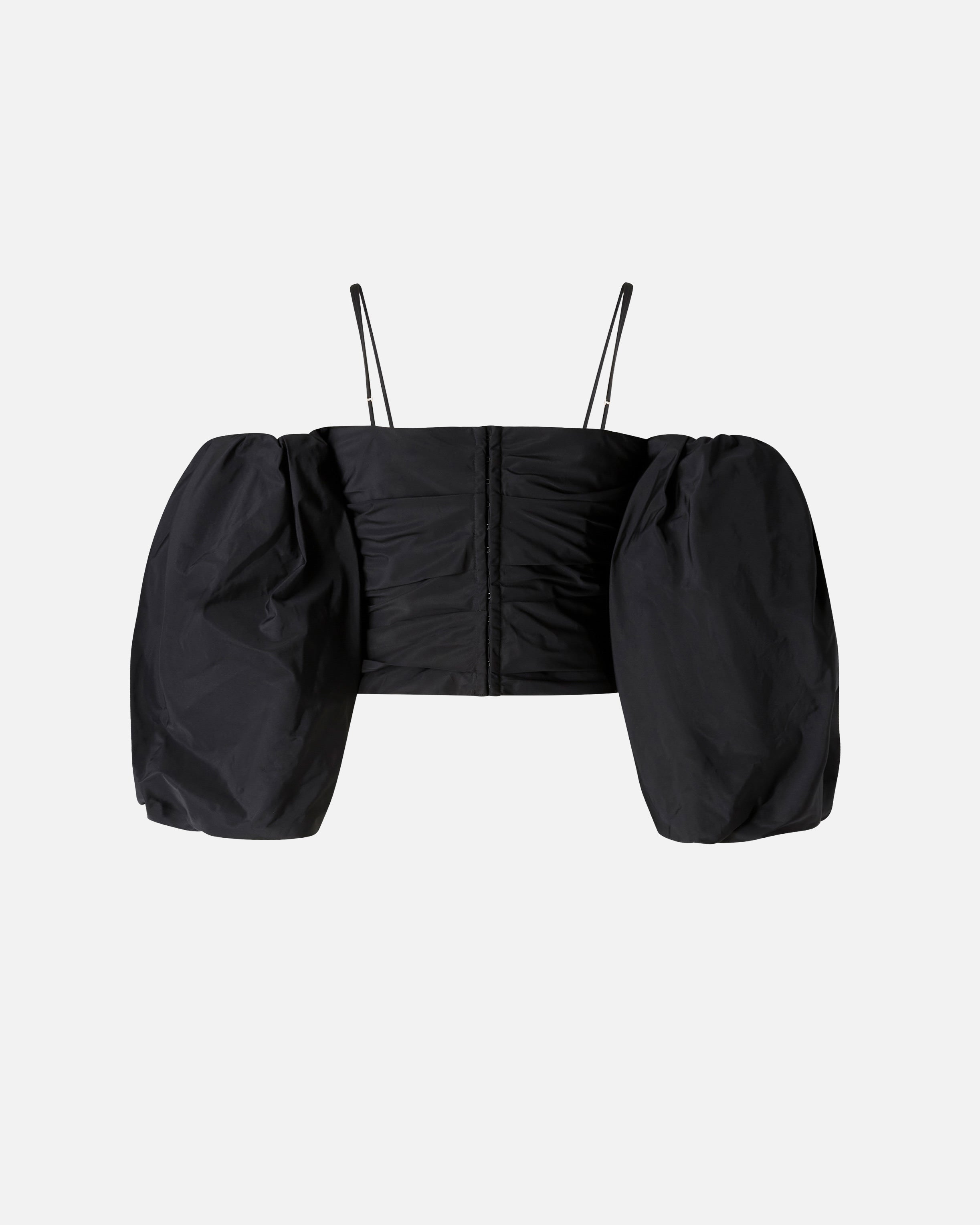 Top corto in taffetà con spalline sottili e maniche staccabili, che offre diverse opzioni di styling. Il materiale risulta leggero e lucente e si sposa alla perfezione con il design dal volume dinamico che contraddistingue il capo. I tagli studiati e le linee moderne del design sono arricchiti da elementi distintivi, come i seducenti dettagli bustier sul retro e le maniche a palloncino. Crea un outfit dall'effetto scenografico e d'impatto, accentuato anche dal tessuto leggermente increspato di questo particolare top.