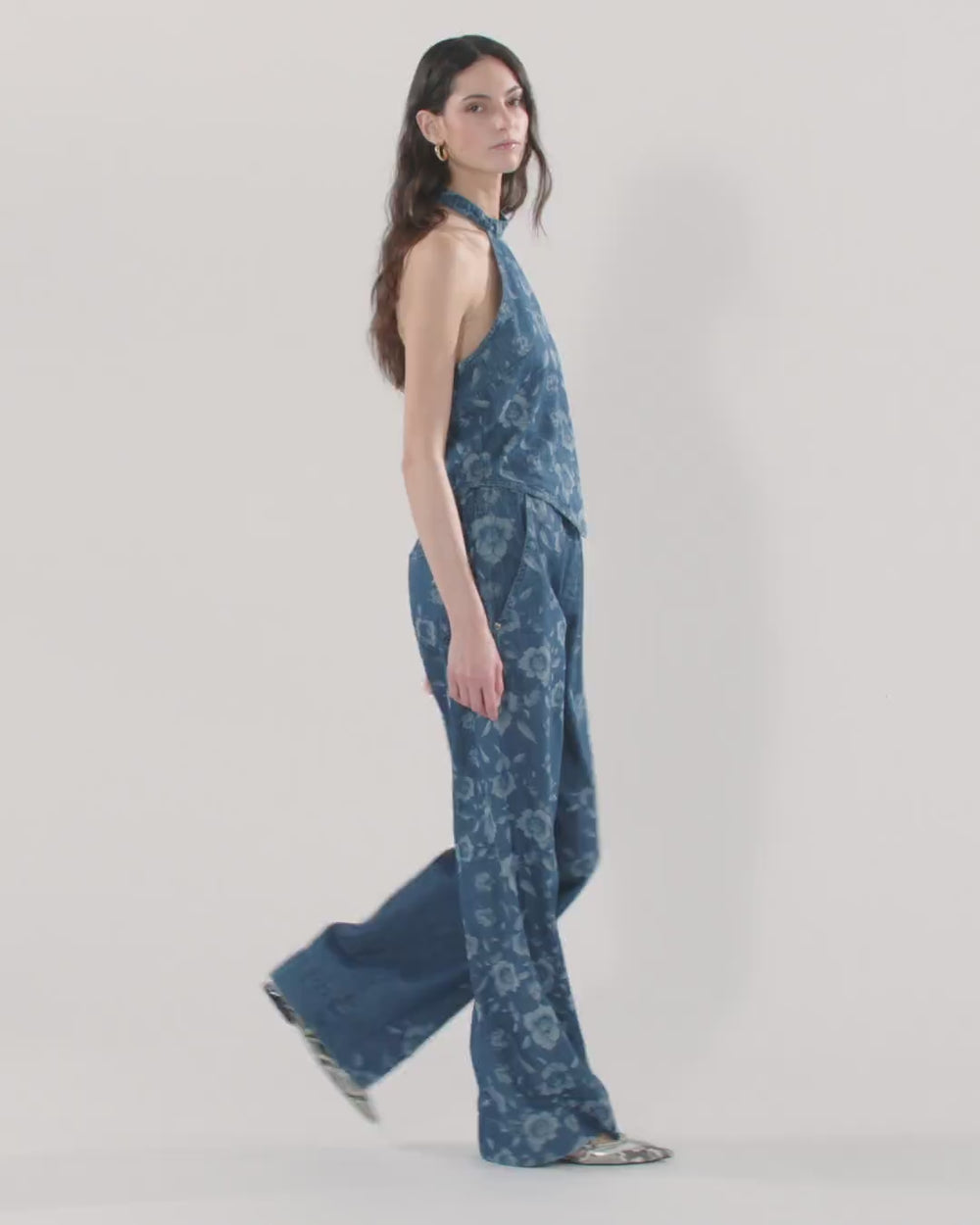 Top senza maniche caratterizzato dalla parte frontale a punta e da uno scollo all'americana con chiusura regolabile sul retro del collo. Il capo, reso sensuale dalla parte superiore della schiena scoperta, è dotato di una comoda chiusura posteriore con zip, ed è realizzato in denim leggero di puro cotone con una lavorazione laserata piazzata che dà vita a un elegante motivo floreale. Audace, femminile ed estremamente estivo, questo top richiama immediatamente una serata in spiaggia o un pool party esclusivo, soprattutto se indossato con i pantaloni coordinati.