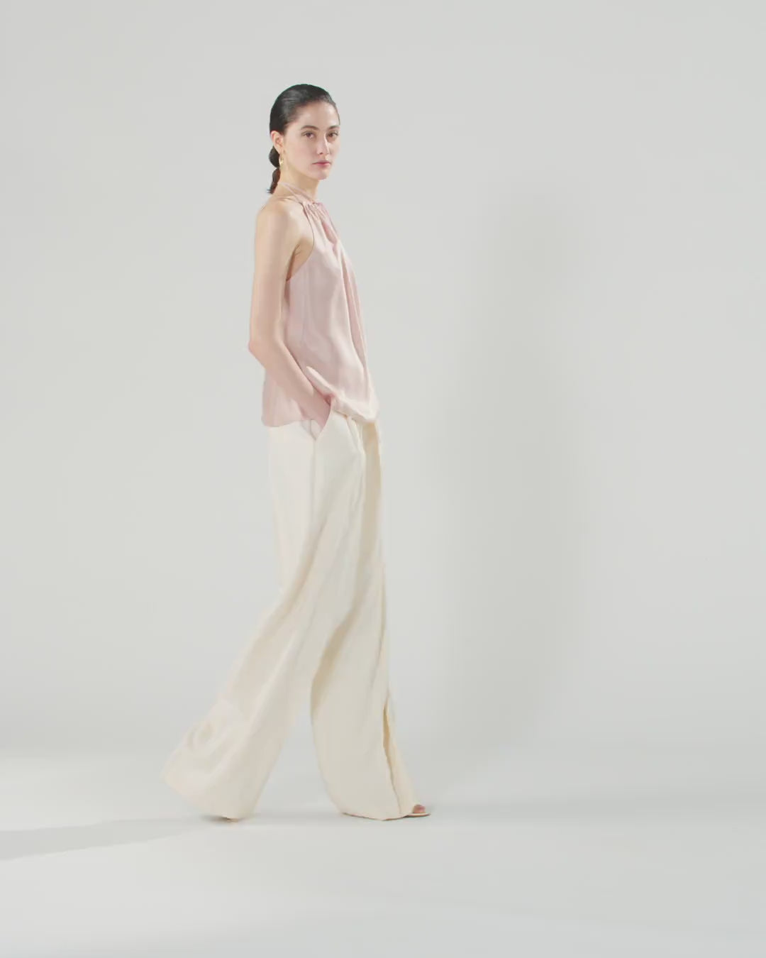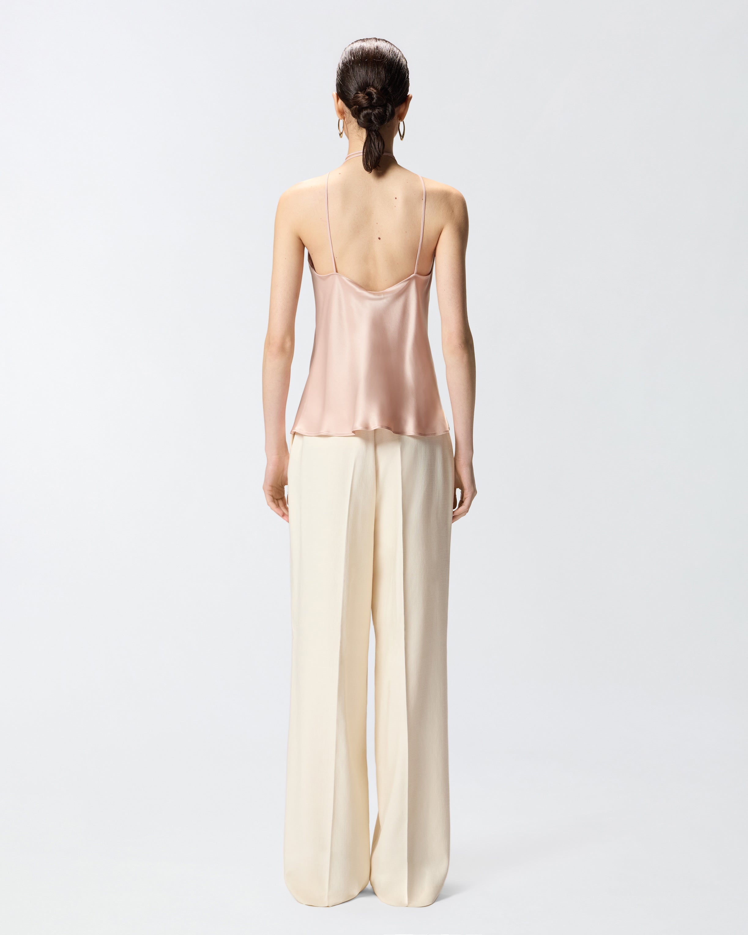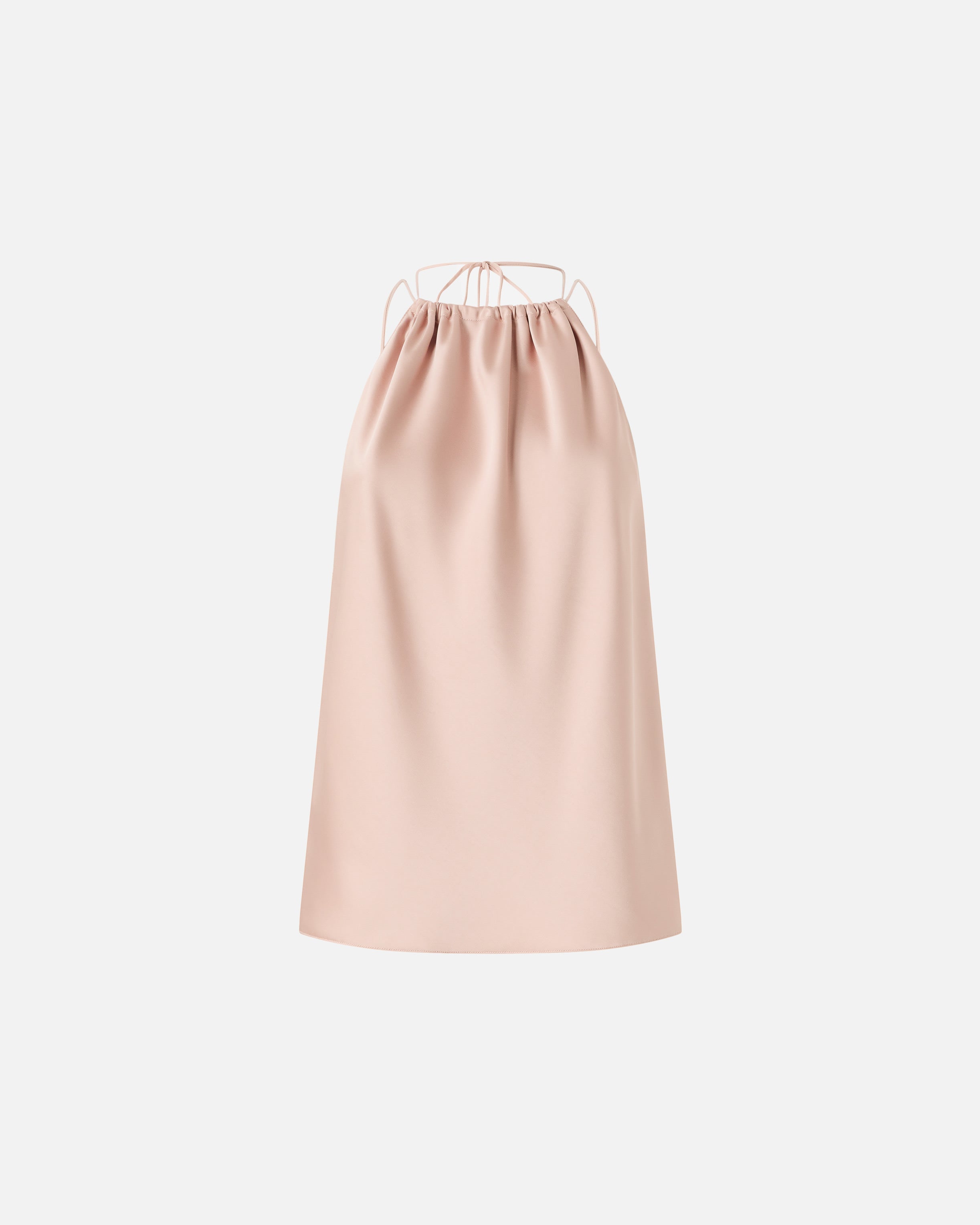 Top dalla linea linea morbida e scivolata, caratterizzato da uno scollo all'americana con coulisse regolabile completata da finalini metallici che crea raffinati arricci sul davanti e lascia la parte alta della schiena scoperta. Il modello è realizzato in morbido e lucente satin double face, per un aspetto raffinato e uniforme sia all'esterno sia all'interno, e presenta spalline sottili coordinate alla coulisse da indossare sia a vista sia nascoste. La fluidità di questo capo saprà stupirti per le cerimonie e occasioni speciali, soprattutto in total look con il pantalone abbinato.