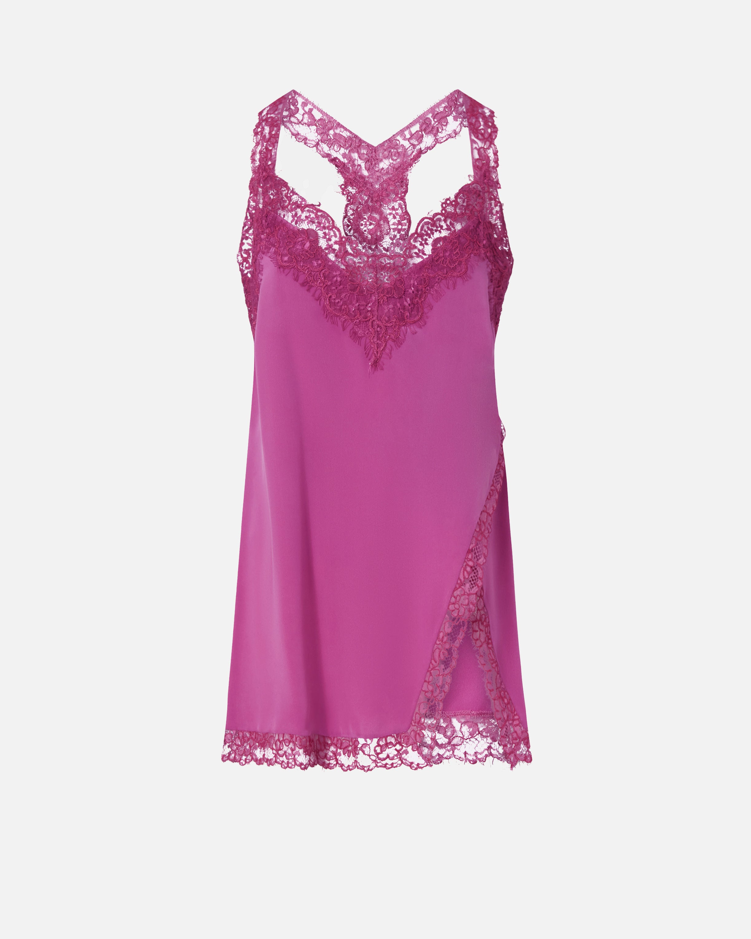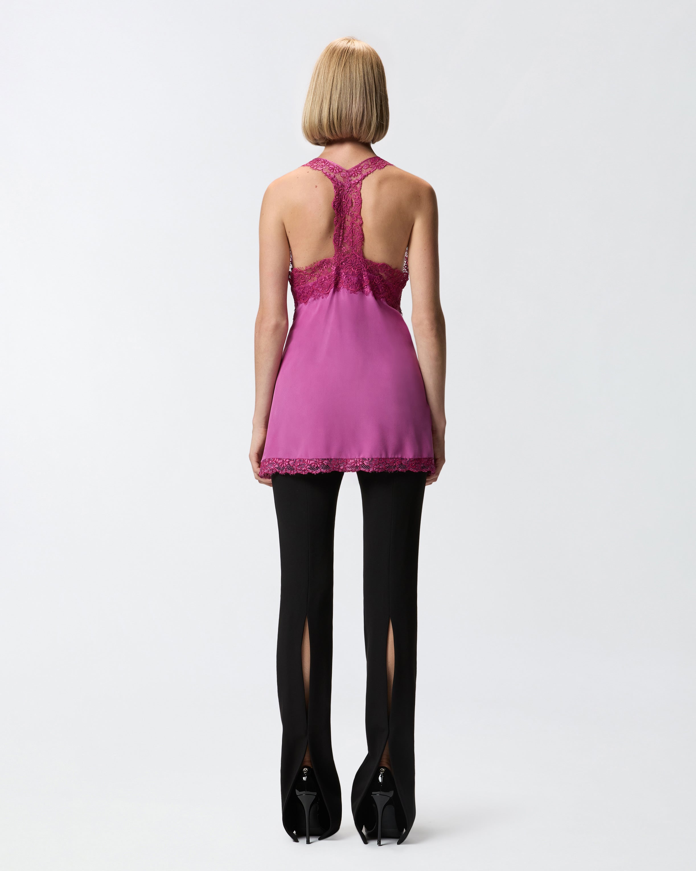 Top in stile lingerie realizzato in crêpe de Chine di seta. Il modello è profilato da dettagli in pizzo rebrodè sul fondo, sullo spacco diagonale sul davanti e sulle spalline che si incrociano sul retro formando una maxi spallina. Eleva l'eleganza e la femminilità di qualsiasi outfit grazie a questo top, che è il sottogiacca perfetto abbinato a pantaloni sartoriali, ma anche a un paio di jeans speciali.
