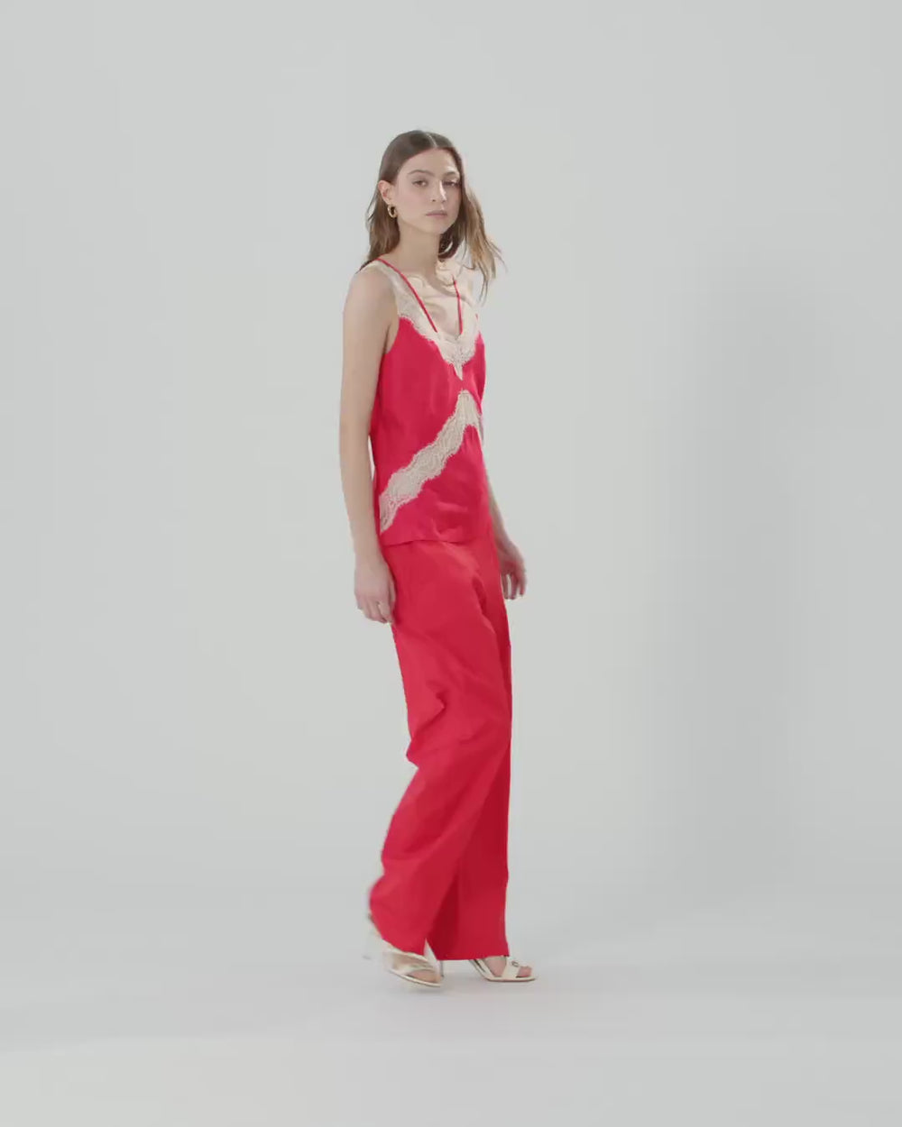 Top smanicato in stile lingerie realizzato in satin di viscosa dalla mano fluida e caratterizzato da un motivo jacquard maculato in tono su tutta la superficie. Il modello, dotato di sottili spalline nello stesso materiale, è impreziosito da bande in pizzo intarsiato sul davanti, lungo lo scollo a V e in corrispondenza delle spalline più spesse. Eleva l'eleganza e la femminilità di qualsiasi outfit grazie a questo top, che è il sottogiacca perfetto abbinato a pantaloni sartoriali, ma anche a un paio di jeans speciali.
