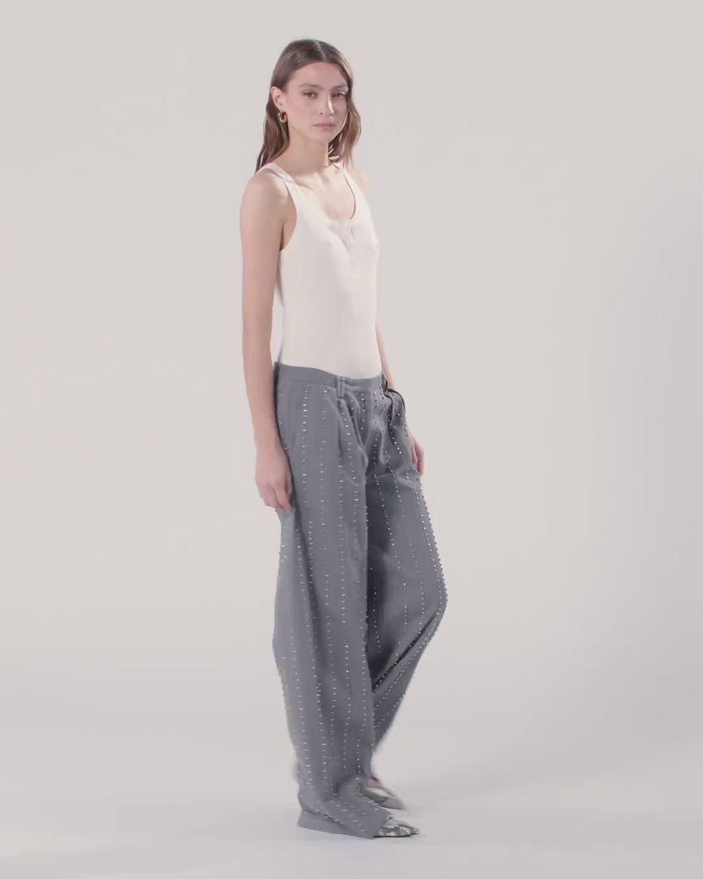 Top smanicato dalla raffinata lavorazione a costine realizzato in morbido e leggero misto di cotone e cashmere, un tessuto adatto a completare qualsiasi outfit della bella stagione. Il modello, con scollo tondo e abbottonatura serafino, è impreziosito da un Monogram P in tono ricamato sul petto, ed è completato dall'etichetta con logo lettering PINKO in jacquard sul retro.