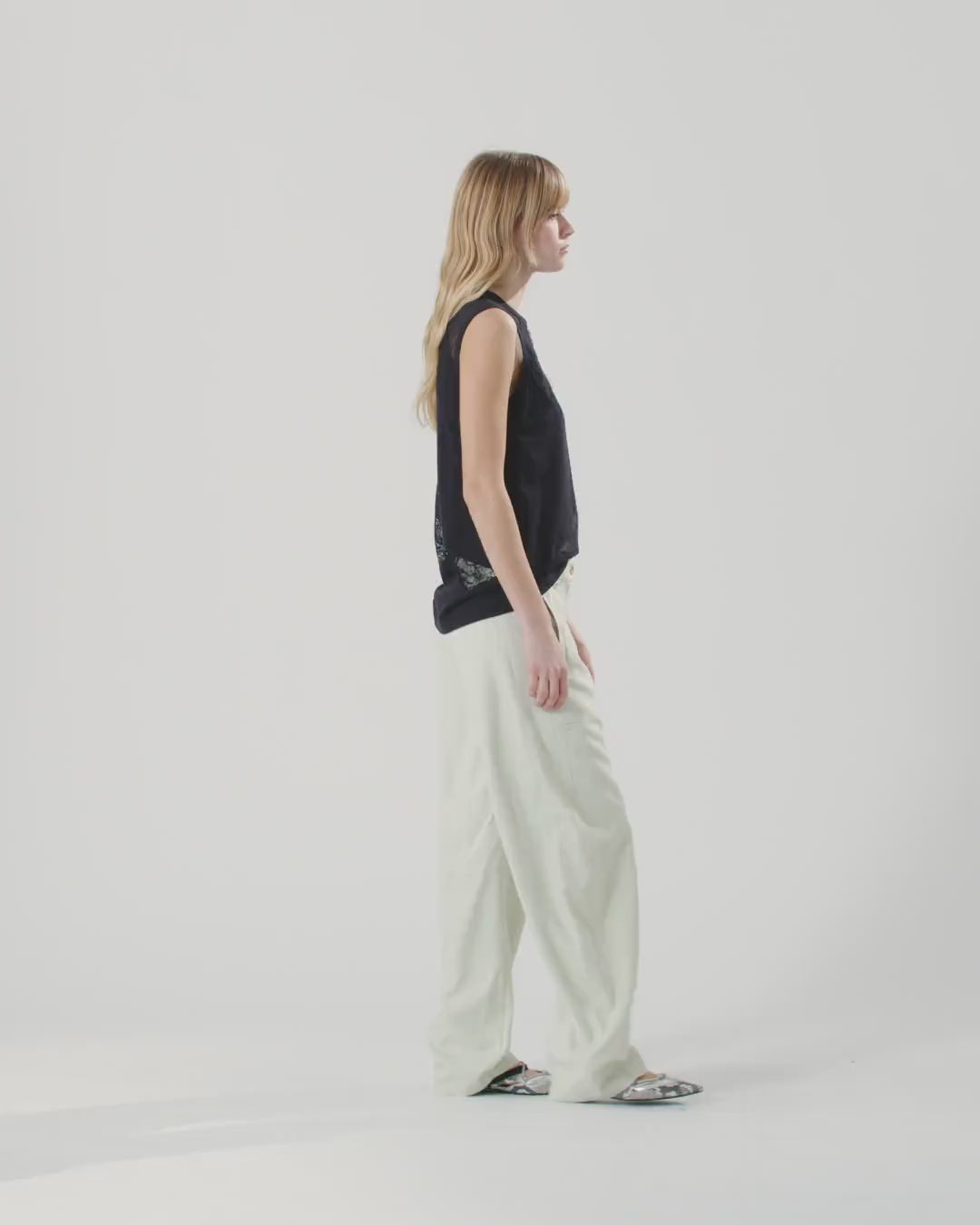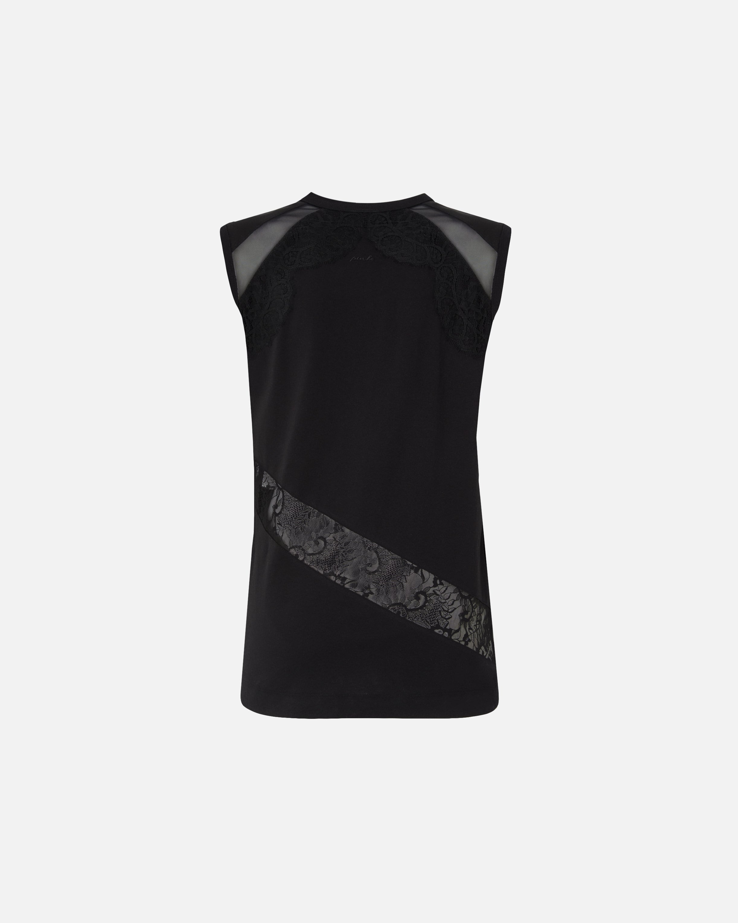 Top girocollo smanicato in jersey di cotone, caratterizzato da un gioco di inserti trasparenti e dettagli in pizzo. Grazie al design versatile ma elegante, è il sottogiacca perfetto abbinato a pantaloni sartoriali, ma anche a un paio di jeans speciali.