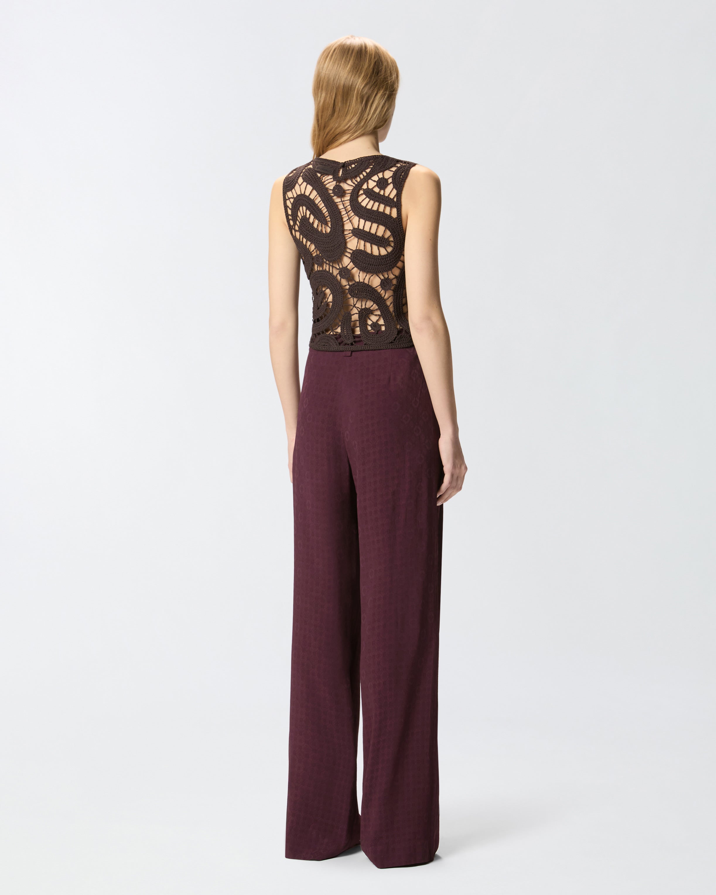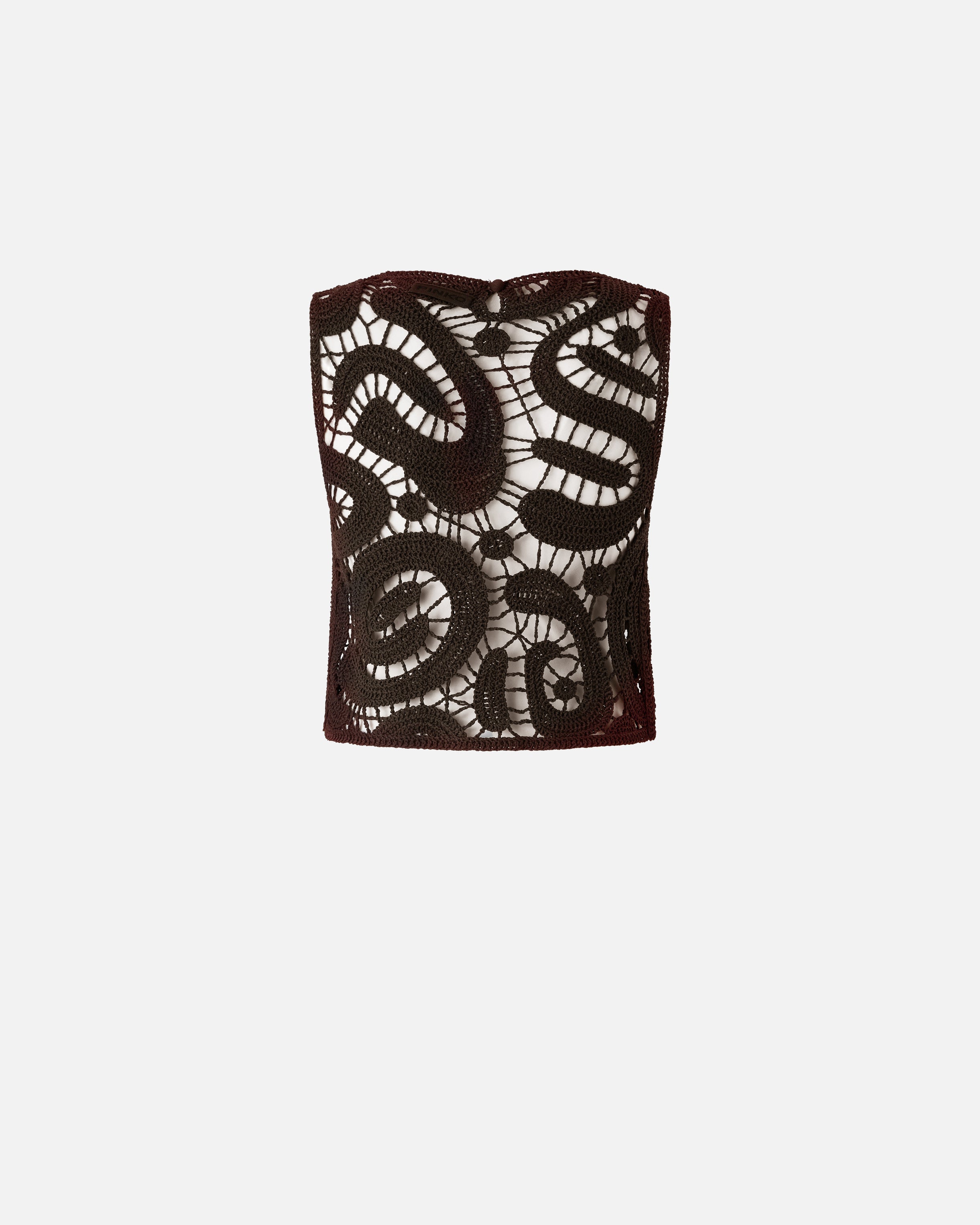 Top smanicato dal taglio corto caratterizzato da una raffinata lavorazione crochet con un innovativo motivo geometrico che dona dinamismo al design e crea un effetto vedo non vedo. Regala un tocco di unicità ai tuoi look con questo capo dallo stile contemporaneo e femminile.