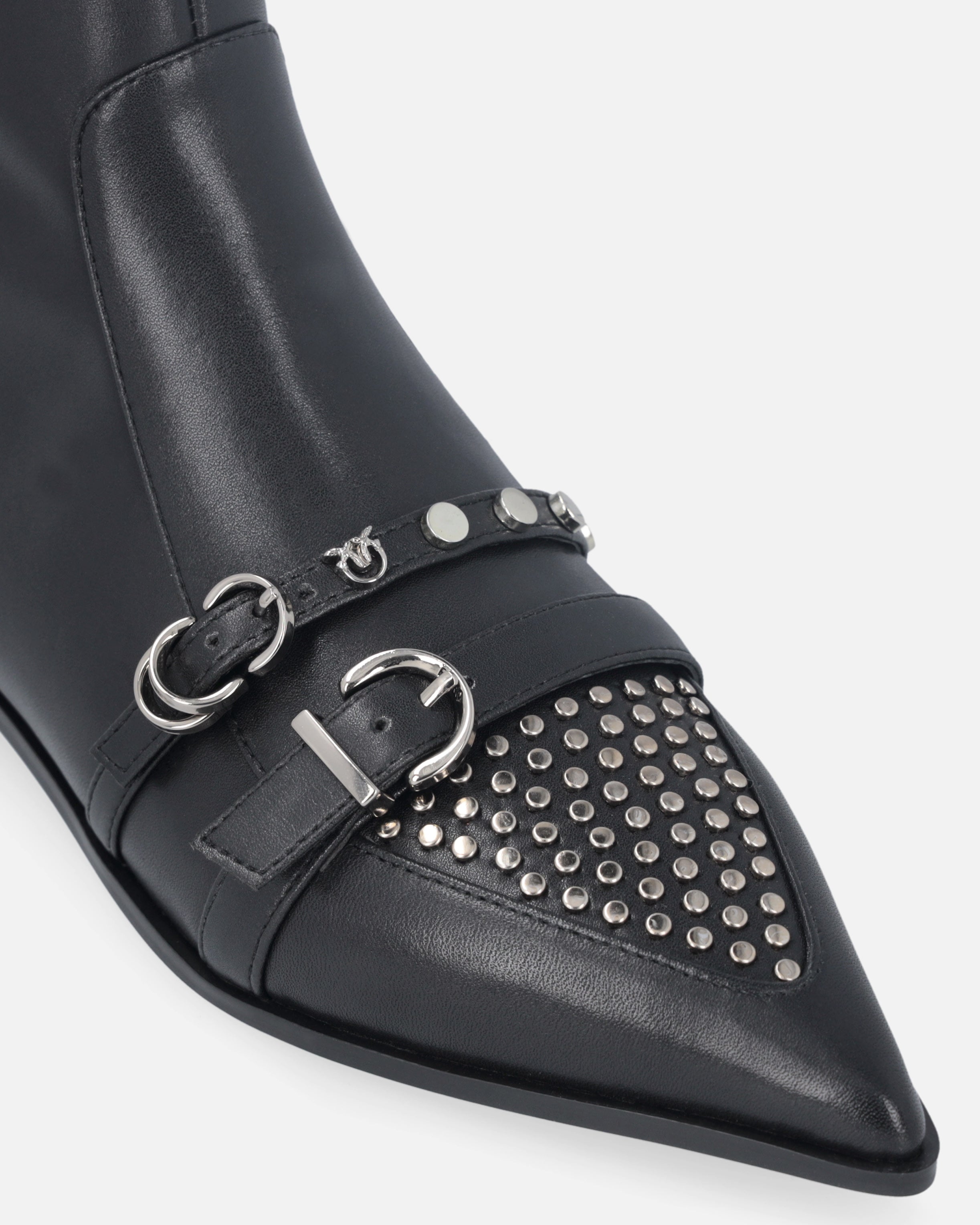 Tronchetti in pelle con gambale alto 15 cm, poggiati su un tacco chunky alto 1,5 cm Il modello si distingue per i due cinturini frontali, di cui uno rifinito da borchie e dall'iconico logo Love Birds, mentre la punta è caratterizzata da un inserto con mini borchie all over, che conferisce al design un luminoso tocco rock. Mix perfetto di eleganza e grinta urbana, questa scarpa è l'ideale per mettere a punto i look più audaci.