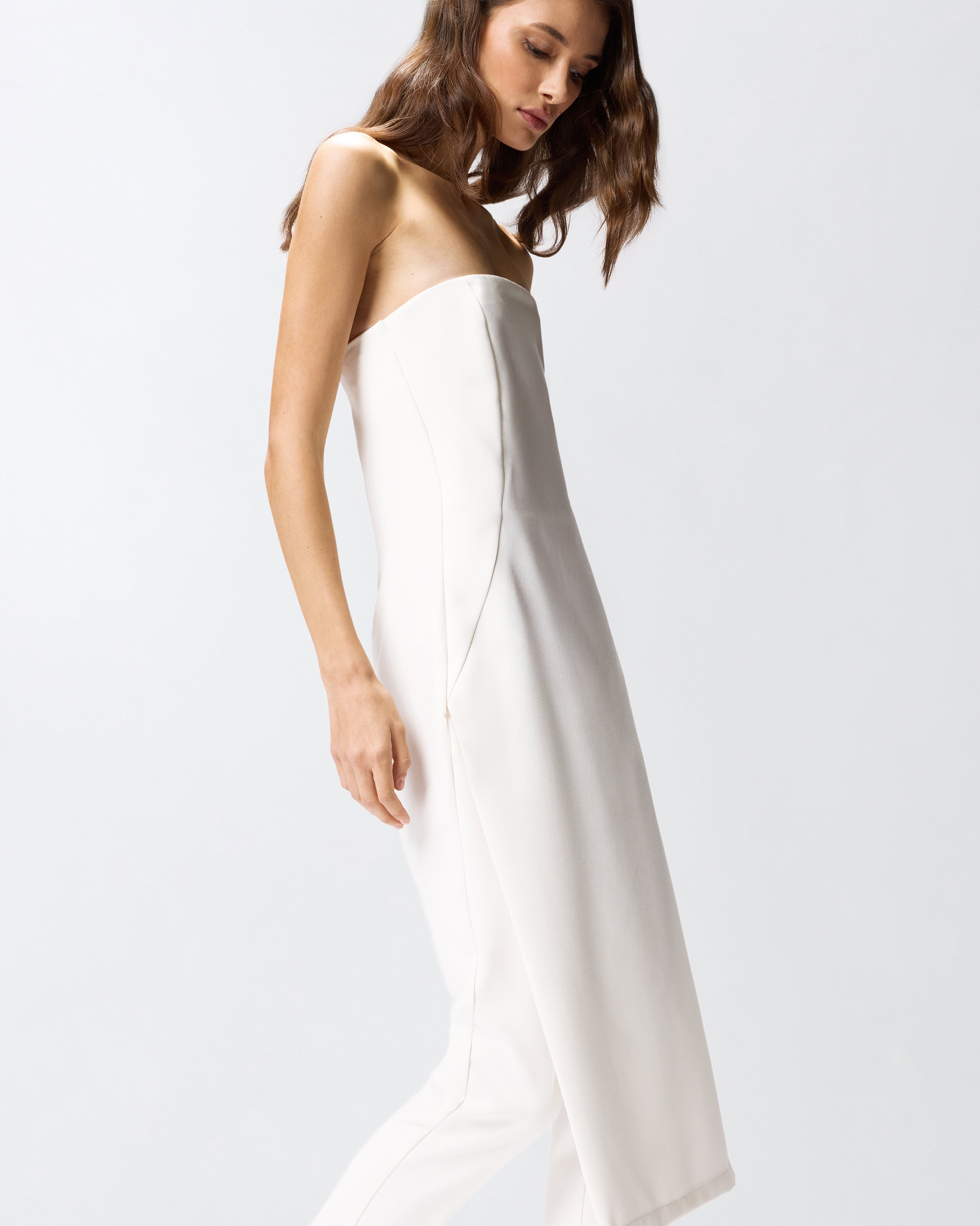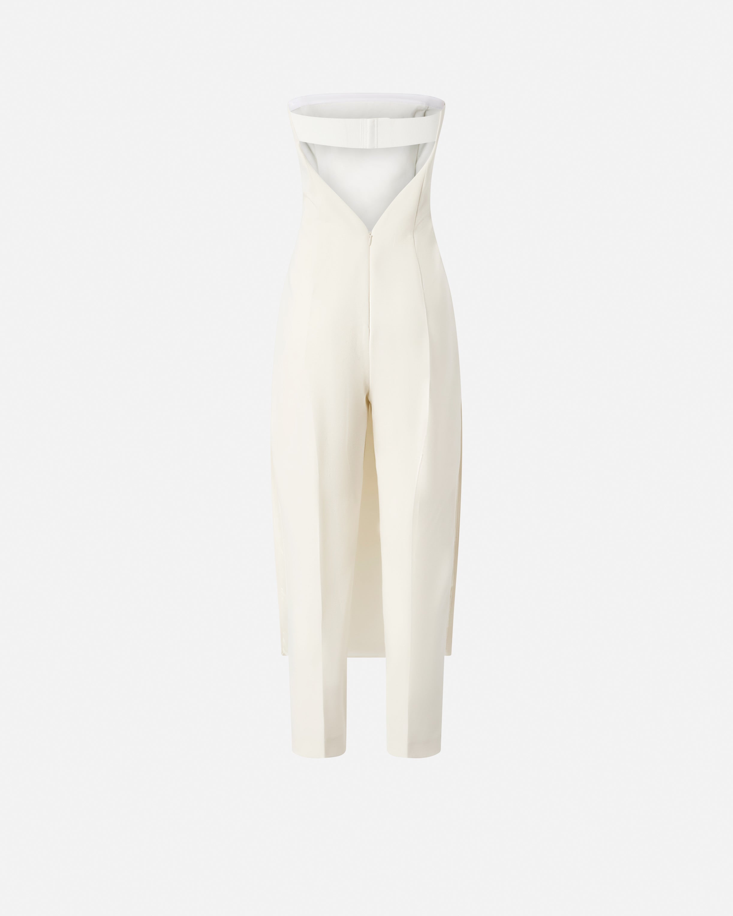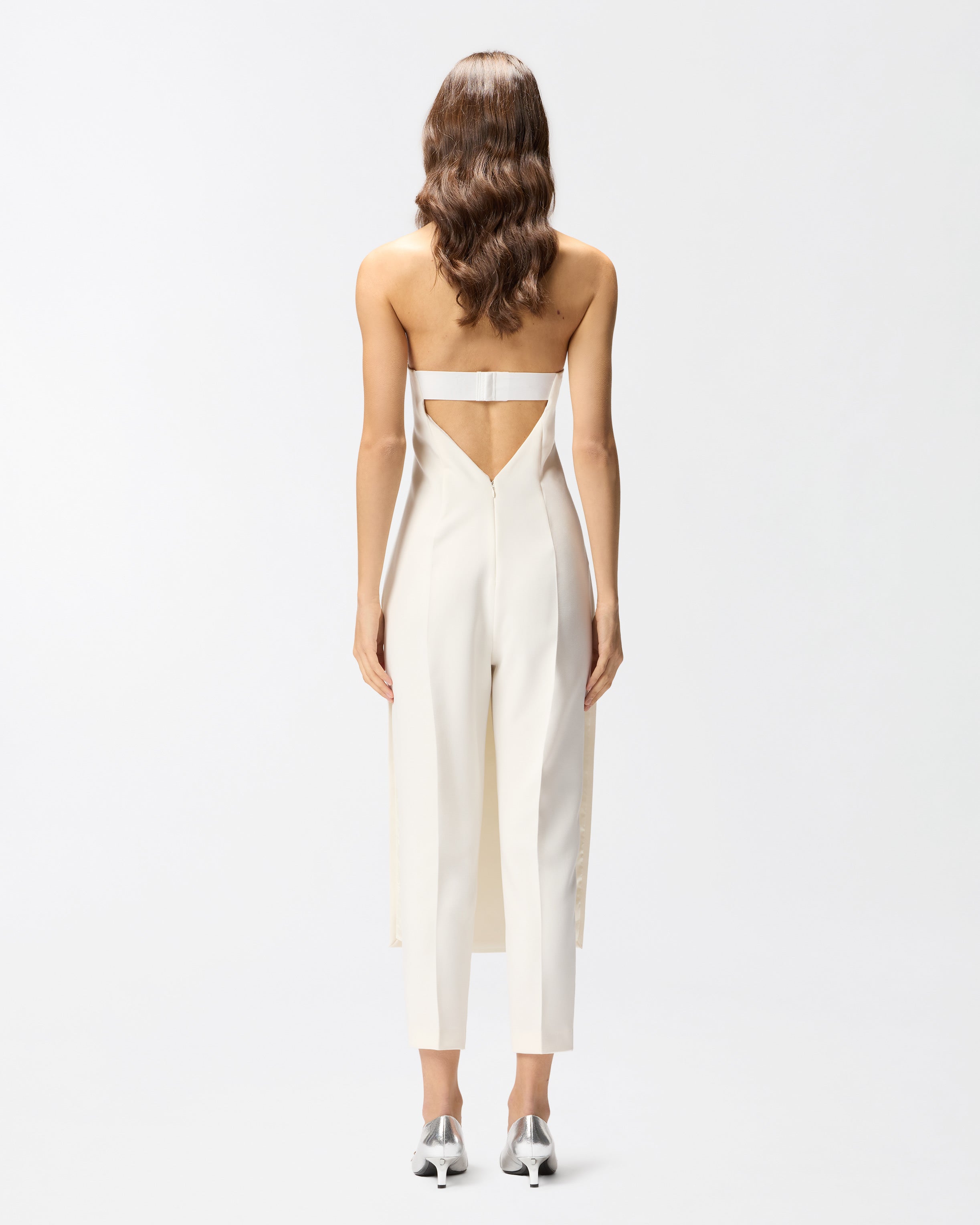 Tuta intera dalla linea aderente senza maniche e con pantaloni lunghi, caratterizzata dalla parte frontale che simula l'effetto di una gonna. Il tessuto in viscosa tecnica riesce a unire morbidezza e fluidità creando una texture sofisticata che offre comfort e vestibilità ottimali, senza perdere l'aspetto strutturato del design. L'effetto pantalone sul retro è completato da un'apertura con gros grain elasticizzato sulla schiena e zip. Le linee pulite e contemporanee del design sono arricchite da dettagli distintivi, come l'effetto leggermente steccato e il dettaglio cut-out sul retro.