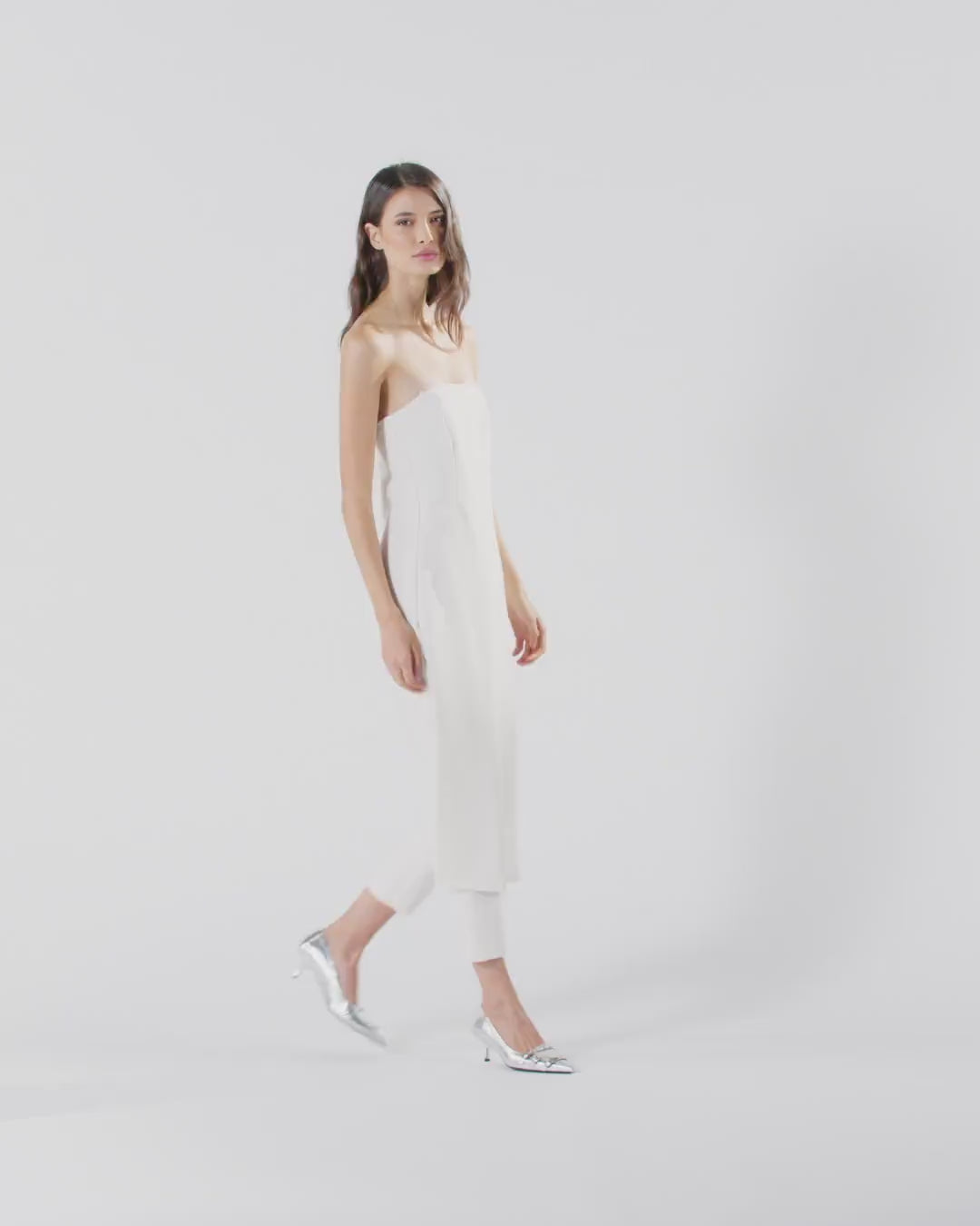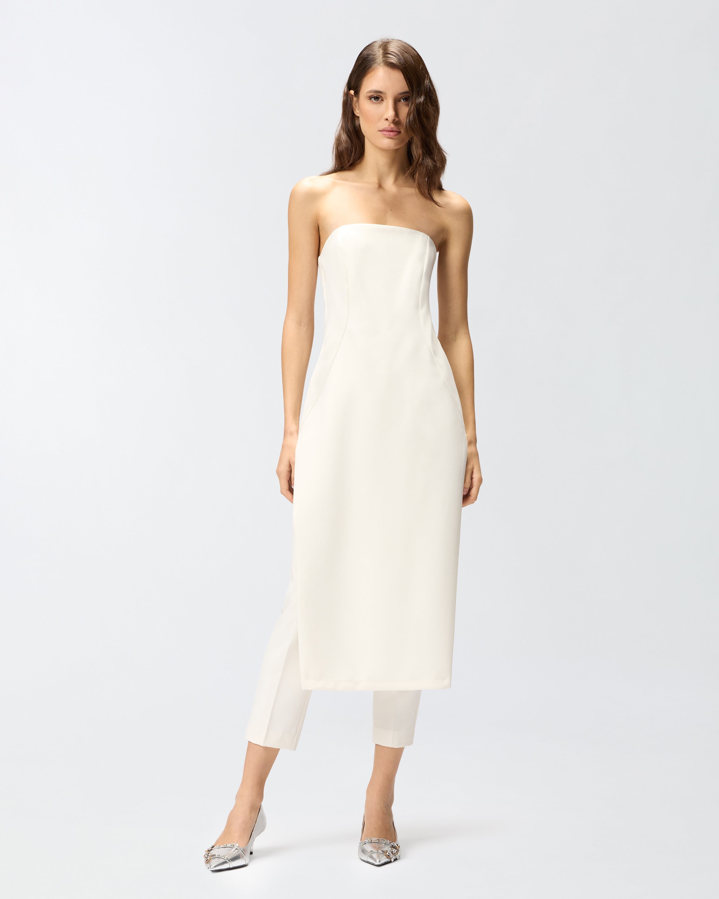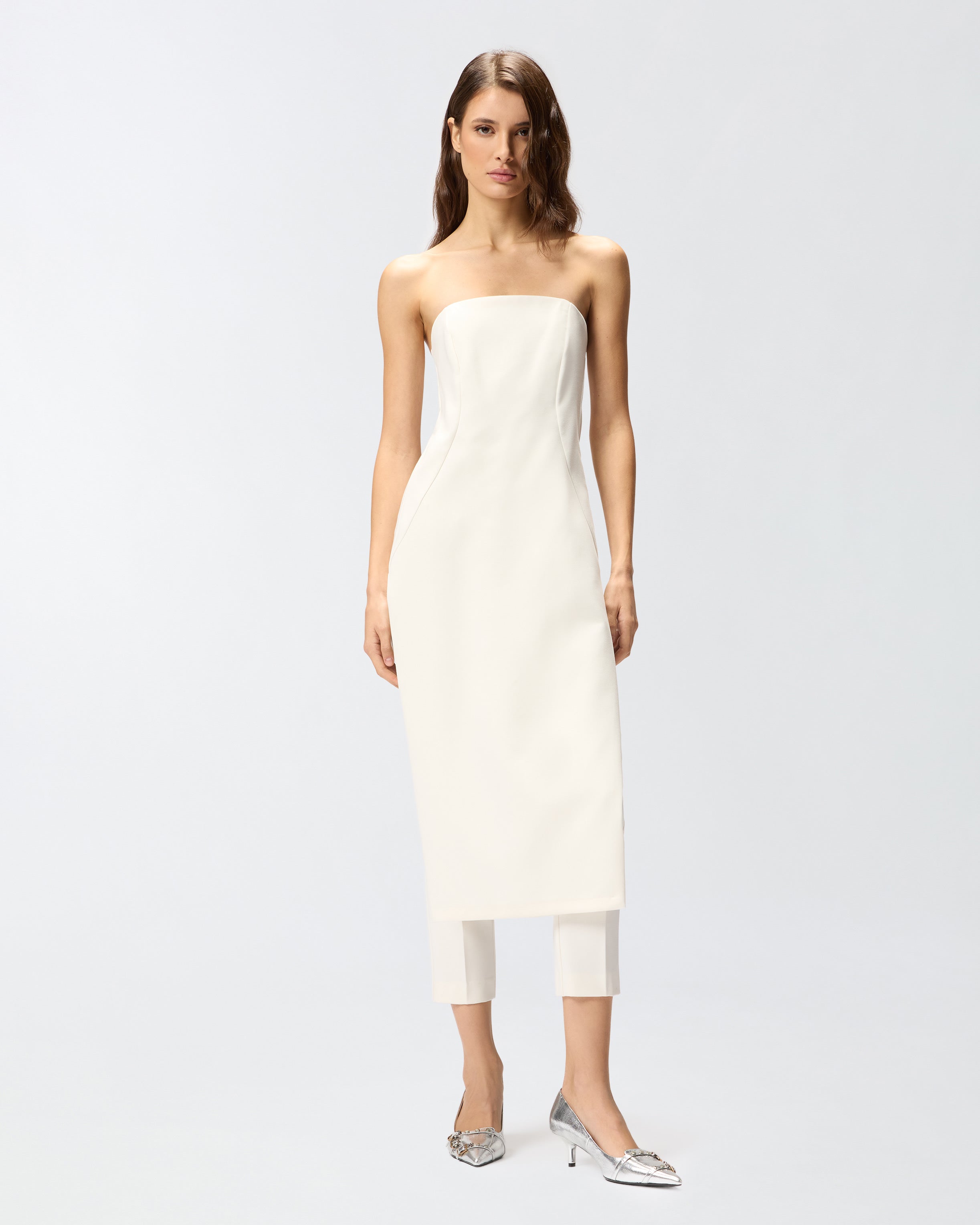 Tuta intera dalla linea aderente senza maniche e con pantaloni lunghi, caratterizzata dalla parte frontale che simula l'effetto di una gonna. Il tessuto in viscosa tecnica riesce a unire morbidezza e fluidità creando una texture sofisticata che offre comfort e vestibilità ottimali, senza perdere l'aspetto strutturato del design. L'effetto pantalone sul retro è completato da un'apertura con gros grain elasticizzato sulla schiena e zip. Le linee pulite e contemporanee del design sono arricchite da dettagli distintivi, come l'effetto leggermente steccato e il dettaglio cut-out sul retro.