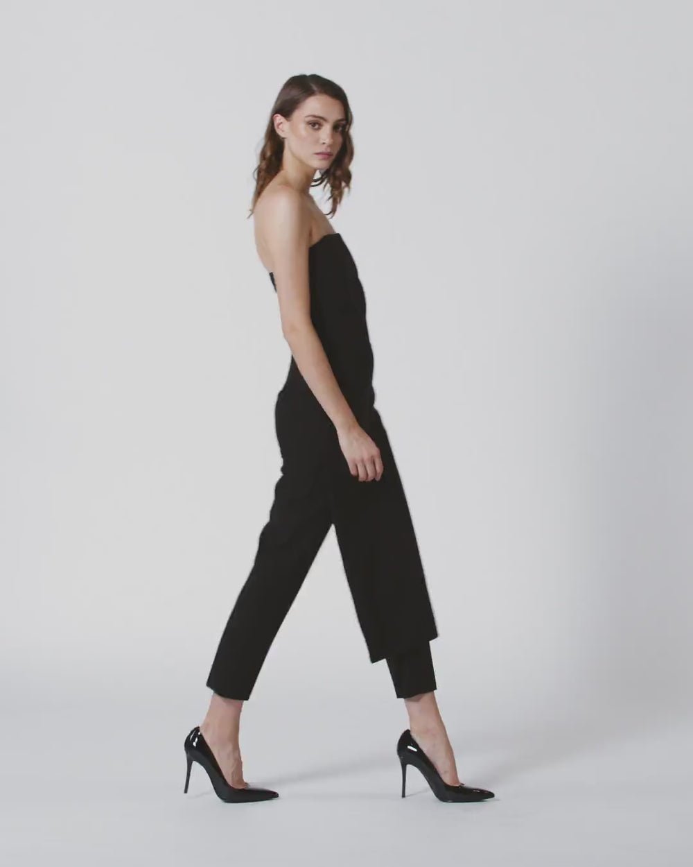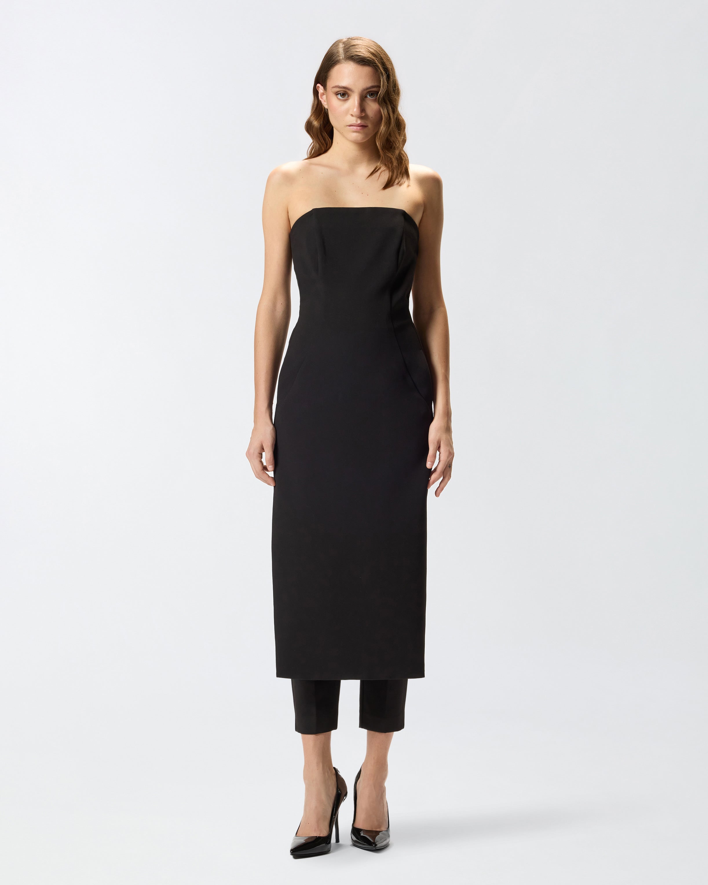 Tuta intera dalla linea aderente senza maniche e con pantaloni lunghi, caratterizzata dalla parte frontale che simula l'effetto di una gonna. Il tessuto in viscosa tecnica riesce a unire morbidezza e fluidità creando una texture sofisticata che offre comfort e vestibilità ottimali, senza perdere l'aspetto strutturato del design. L'effetto pantalone sul retro è completato da un'apertura con gros grain elasticizzato sulla schiena e zip. Le linee pulite e contemporanee del design sono arricchite da dettagli distintivi, come l'effetto leggermente steccato e il dettaglio cut-out sul retro.