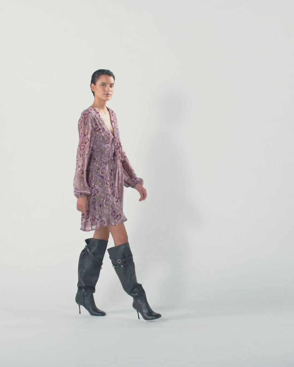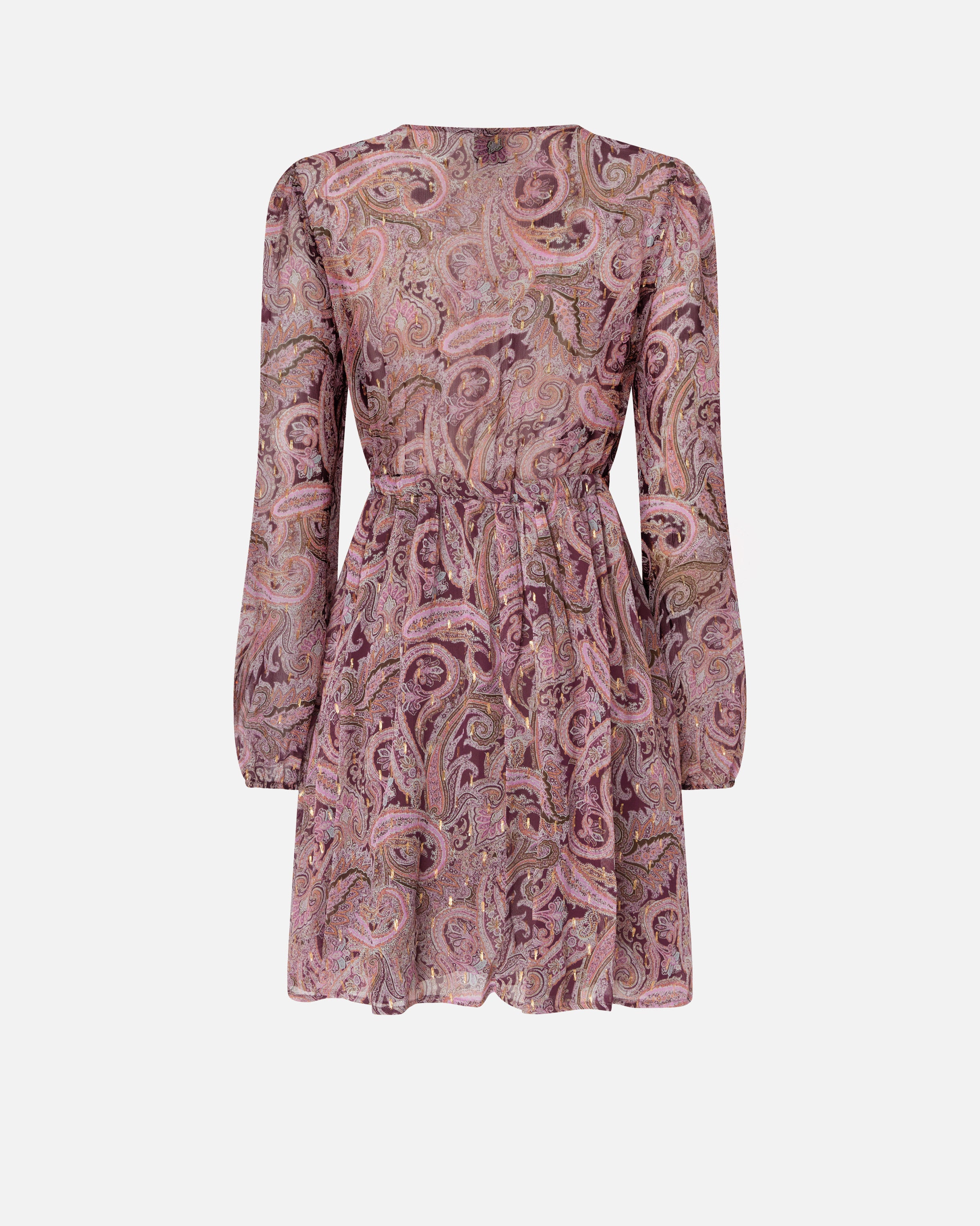 Vestito corto con maniche lunghe leggermente a palloncino e scollo a V, caratterizzato da una gonna morbida e plissettata e da un punto vita elasticizzato che valorizza la silhouette. Il modello è realizzato in leggero creponne di viscosa semitrasparente ed è arricchito da una sofisticata stampa d'ispirazione cachemire con dettagli in filo metallizzato per un tocco di luminosità in più. La leggerezza e la silhouette del capo lo rendono femminile e sensuale, ma l'elemento che catalizza l'attenzione è il cut-out sul davanti creato dalle due bande di tessuto allacciate, tanto semplice quanto d'effetto.