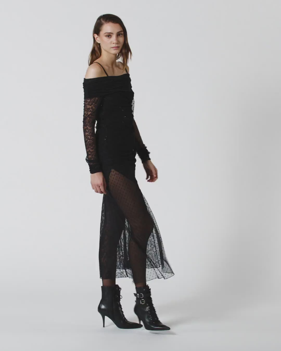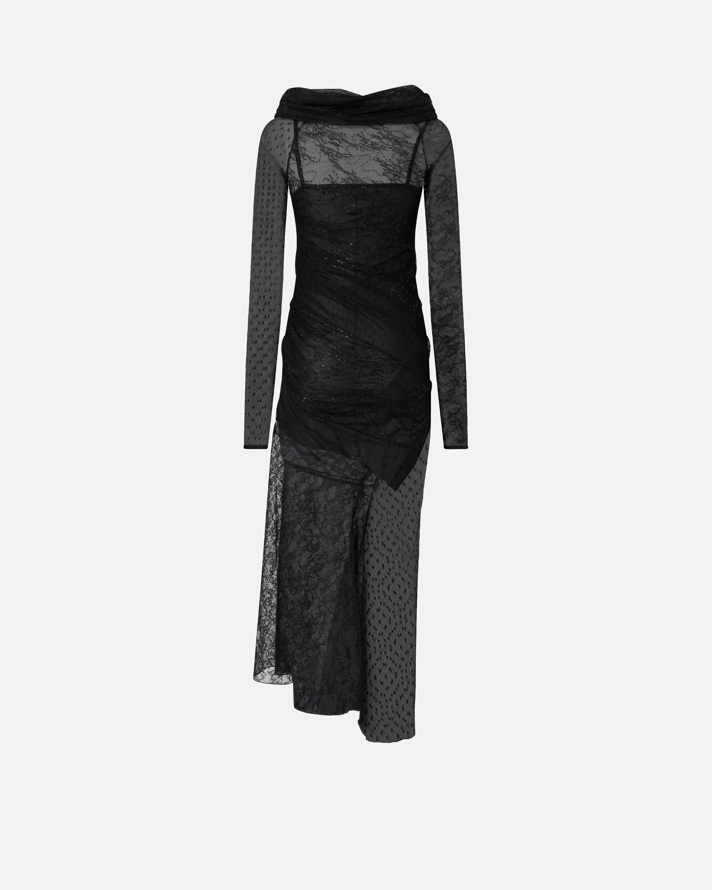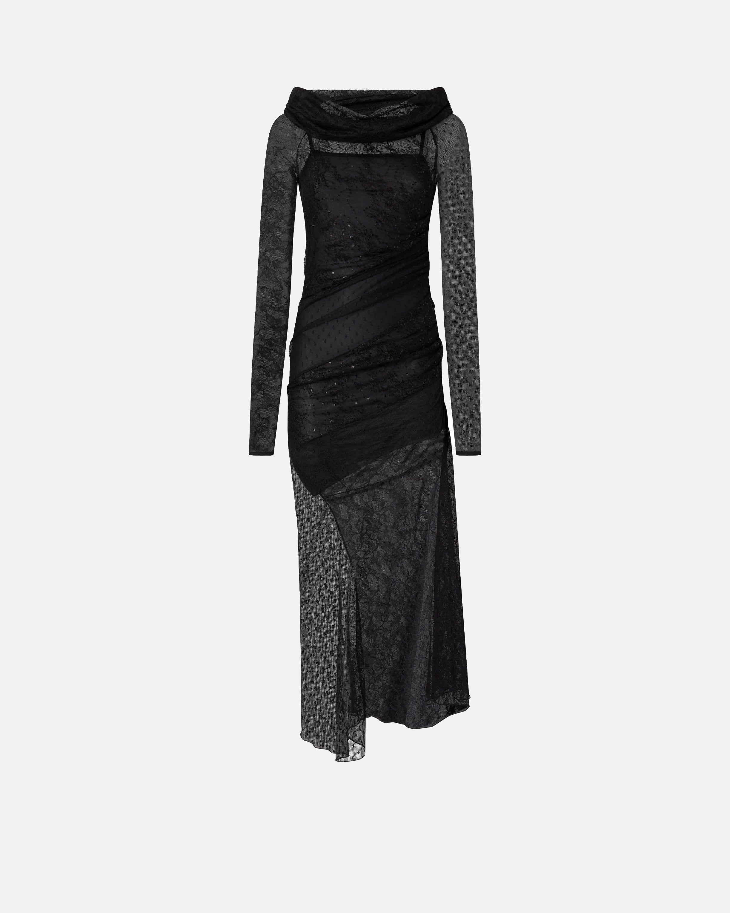 Vestito lungo a maniche lunghe con voluminoso scollo a barchetta drappeggiato e fondo asimmetrico. Il design è realizzato con tre distinti motivi di pizzo, ciascuno scelto per creare un gioco di contrasti visivi, ed è illuminato in particolar modo dai ricami con paillettes. La combinazione di tessuto e i dettagli raffinati rendono questo abito aderente un outfit ideale per una serata elegante. Inoltre, i drappeggi strategici che avvolgono il corpo creano sensuali trasparenze e enfatizzando le forme con un effetto dinamico e fluido.