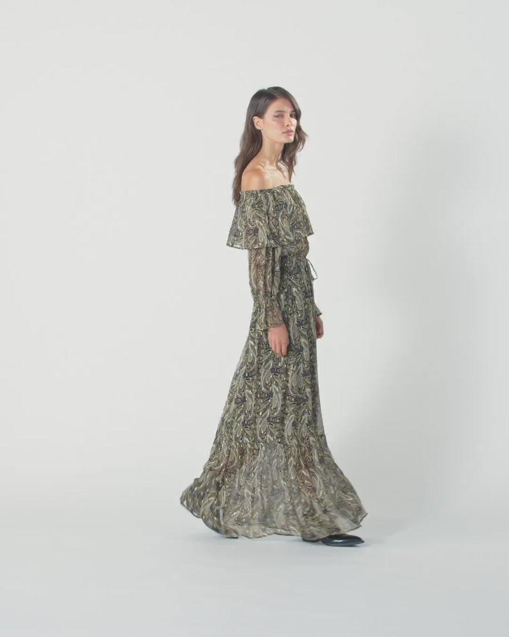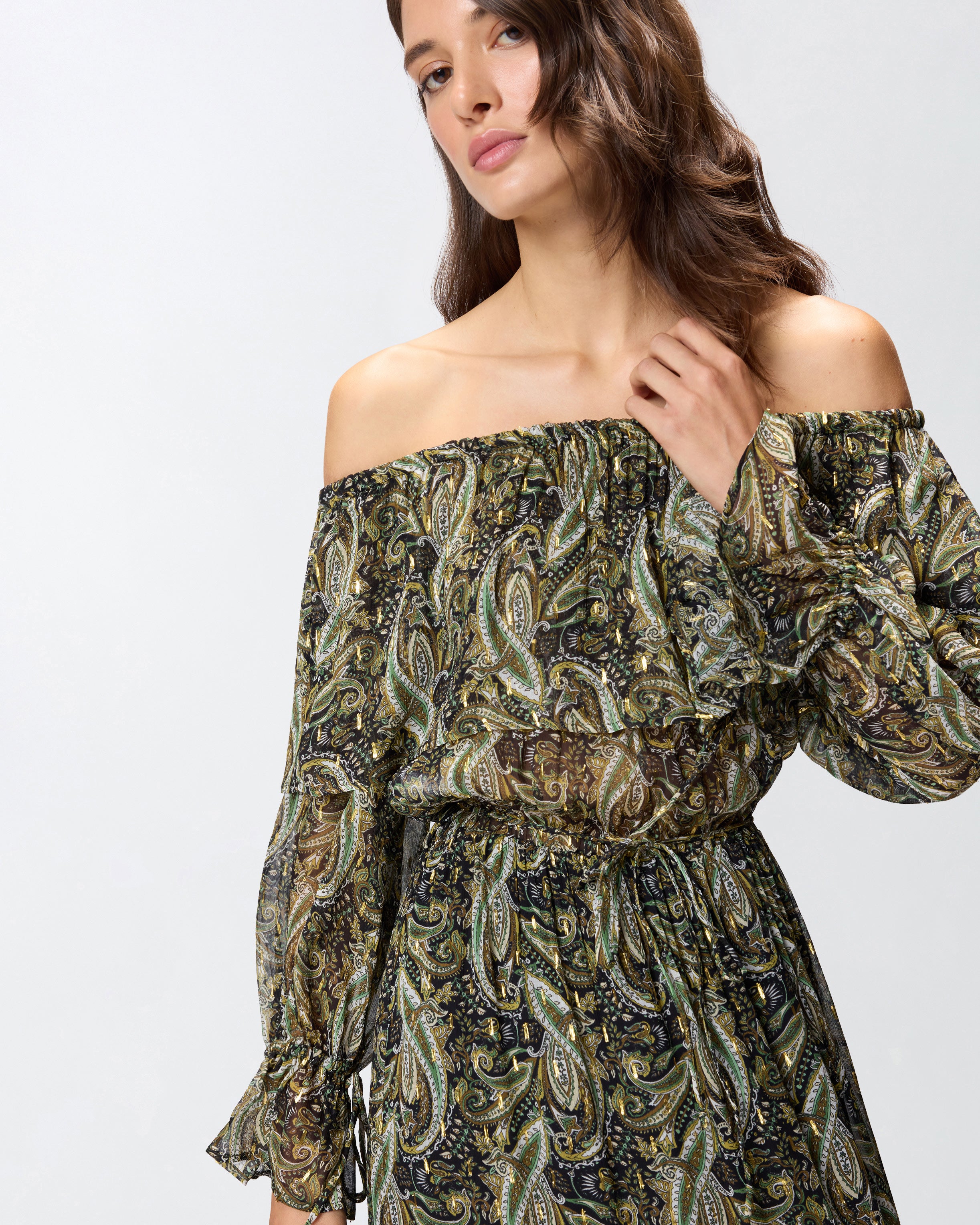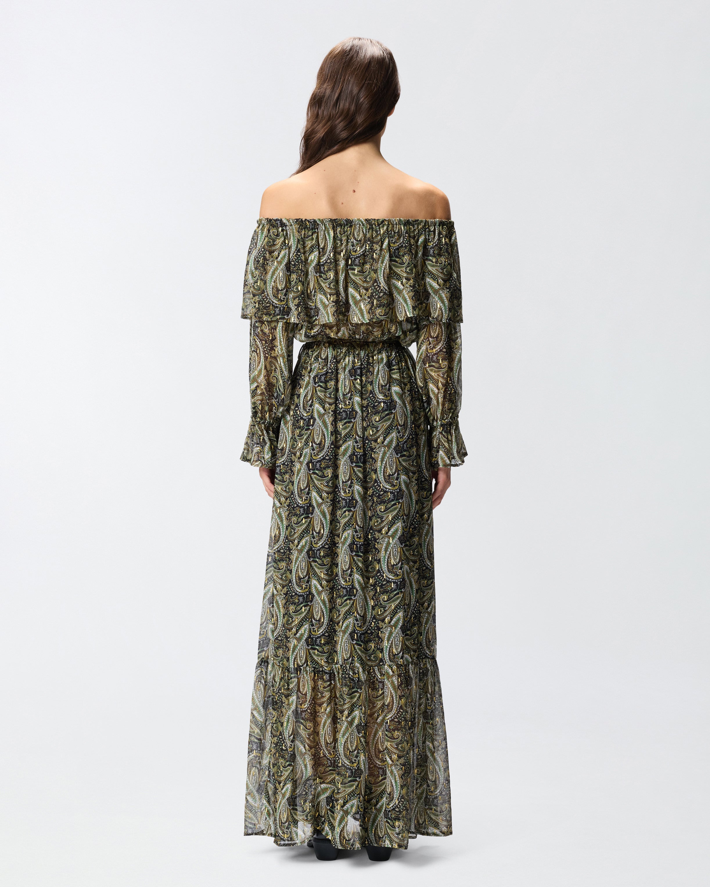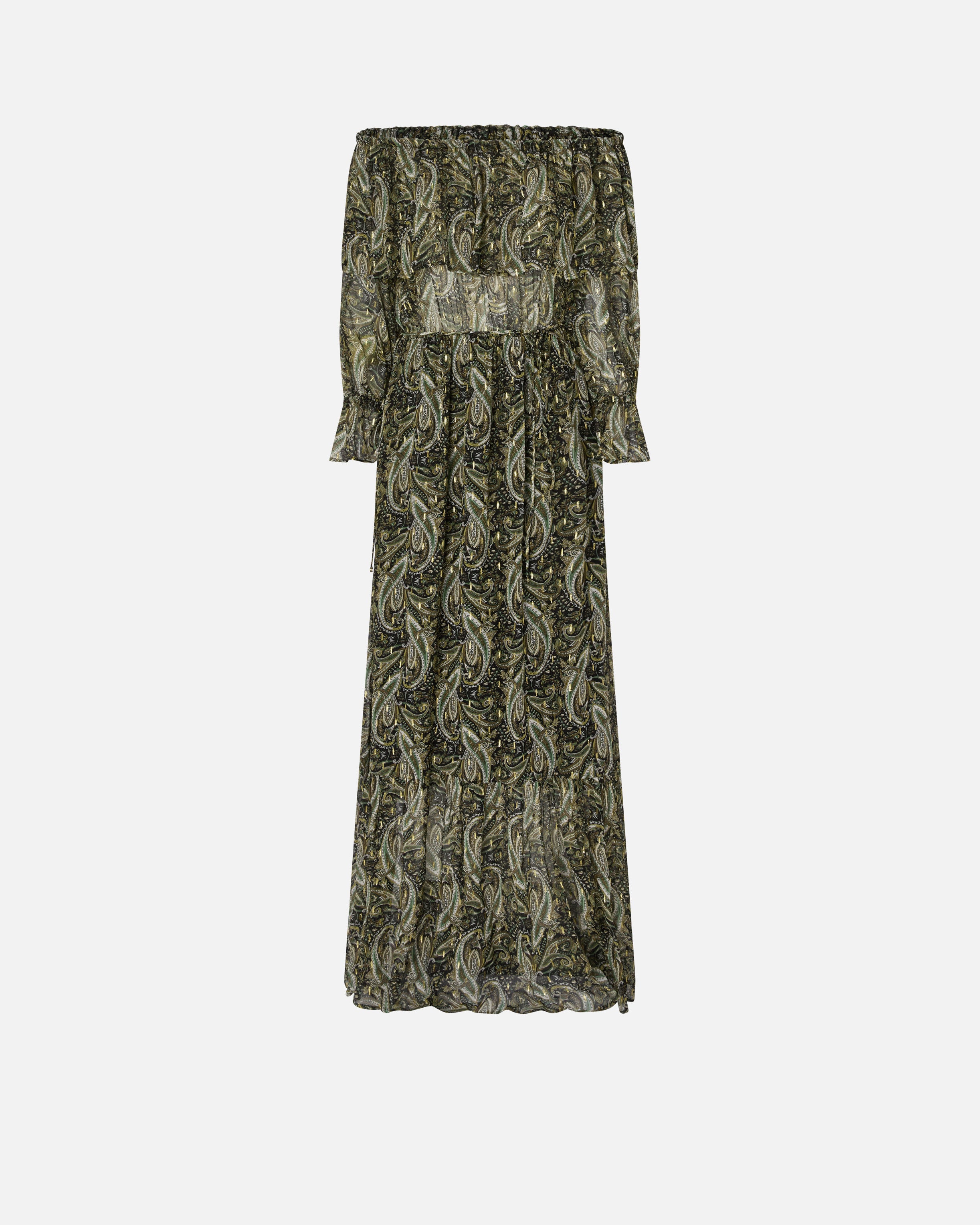 Vestito lungo con spalle scoperte, maniche lunghe con volant al fondo e morbida gonna a balze. Il modello è realizzato in leggero creponne di viscosa semitrasparente ed è arricchito da una sofisticata stampa d'ispirazione cachemire con dettagli in filo metallizzato per un tocco di luminosità in più. La leggerezza e il gioco di trasparenze femminili rendono questo abito da donna la scelta ideale per un look da sera dal gusto boho-chic.