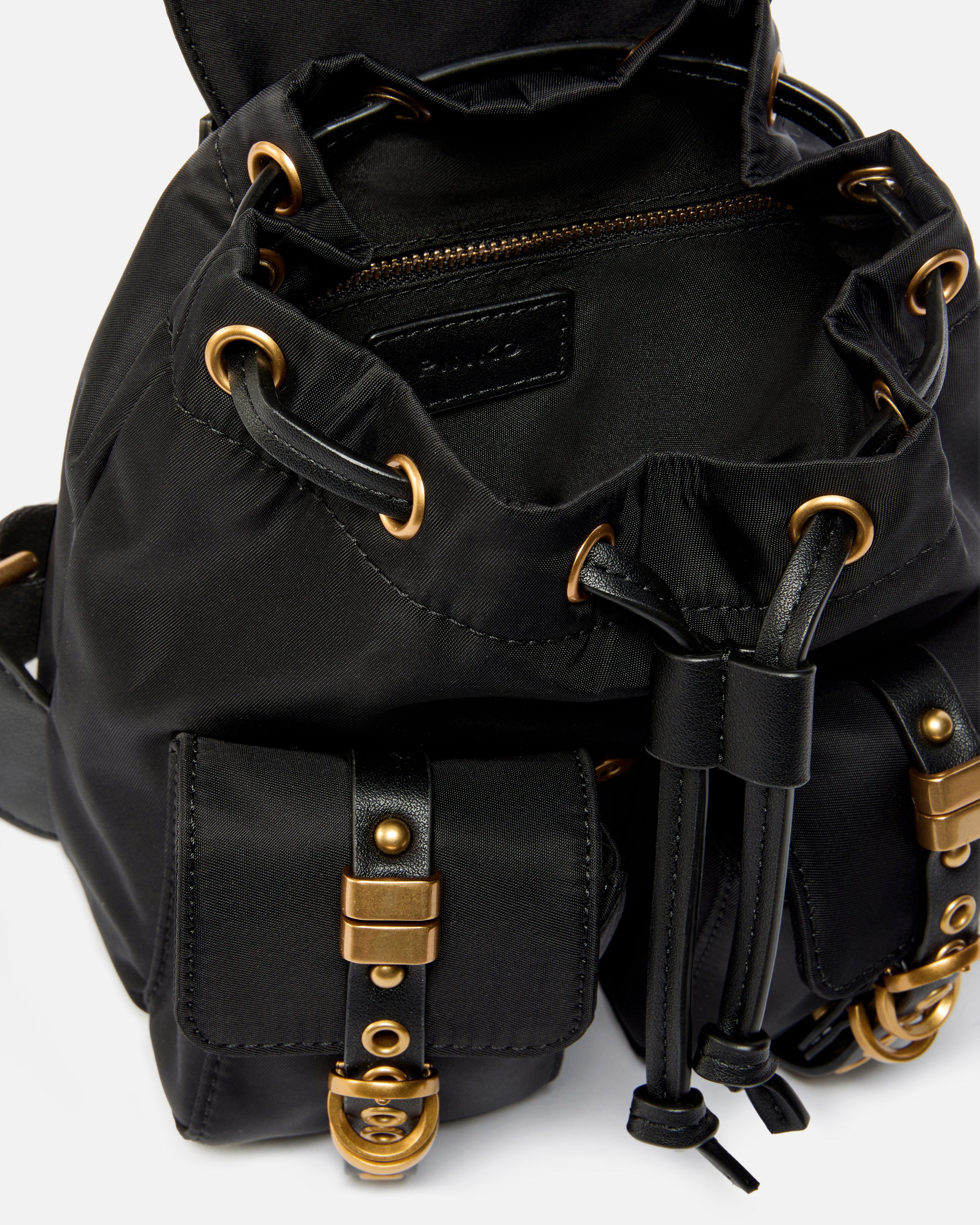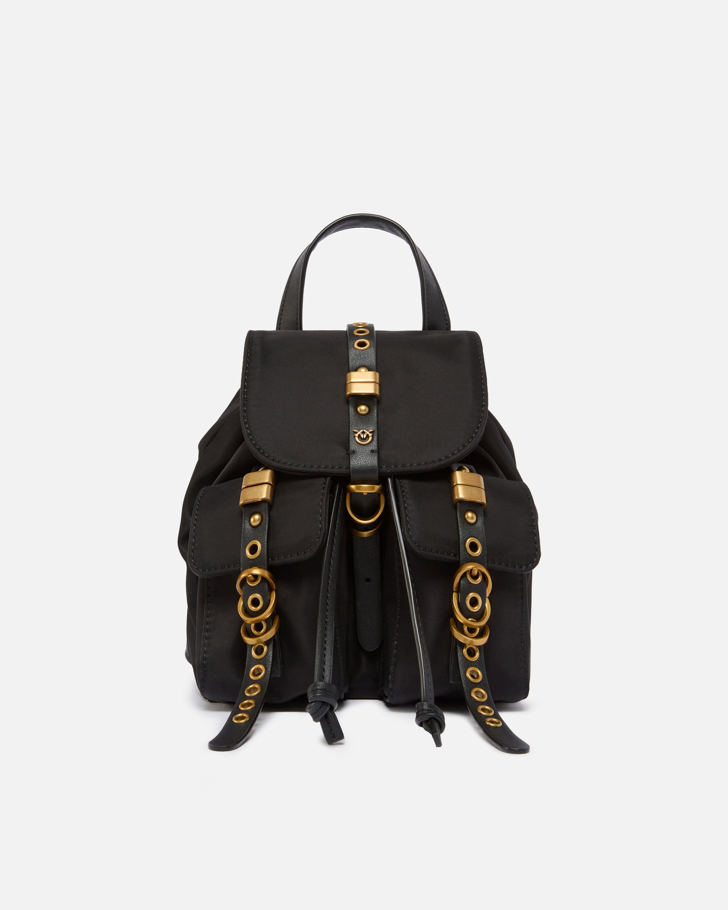 Zaino di piccole dimensioni dal design morbido e capiente, realizzato in nylon tinta unita. Il modello con manico superiore si distingue per la combinazione di elementi pratici e decorativi, rappresentati sia dalla chiusura esterna con cinturino effetto pelle arricchito da occhielli, anelli metallici e placchetta con logo Love Birds Diamond Cut, sia dalle grandi tasche frontali con patta, anch'esse impreziosite da cinturini similpelle con occhielli e anelli metallici. Perfetto per completare i tuoi outfit quotidiani con stile e funzionalità, questo zainetto è dotato di ampi spallacci regolabili in nastro e presenta una chiusura interna con coulisse, che rivela un vano principale foderato in drill di cotone con chiusura a parete con zip ed etichetta logata. Attiva il tuo accessorio PINKO: verifica l'autenticità del tuo prodotto e accedi all'esperienza personalizzata avvicinando il tuo smartphone al ricamo Love Birds che trovi sul retro!