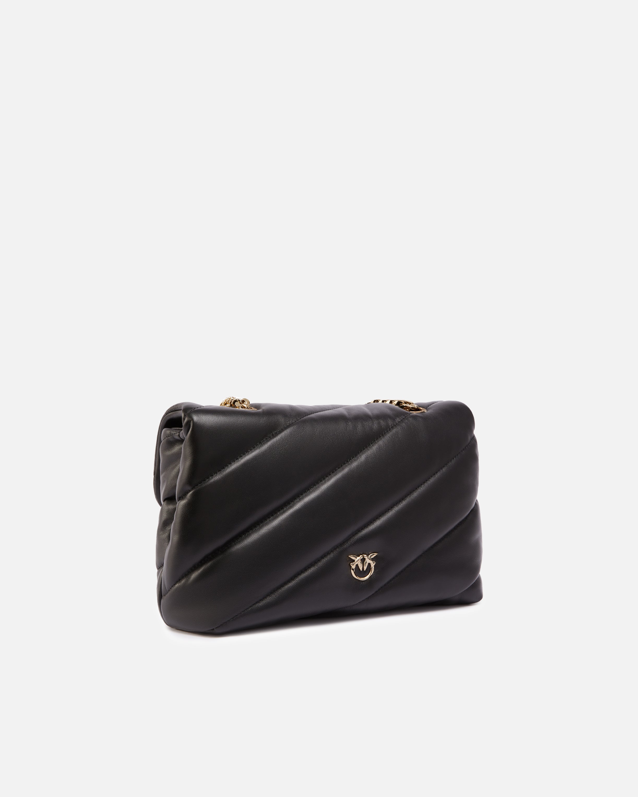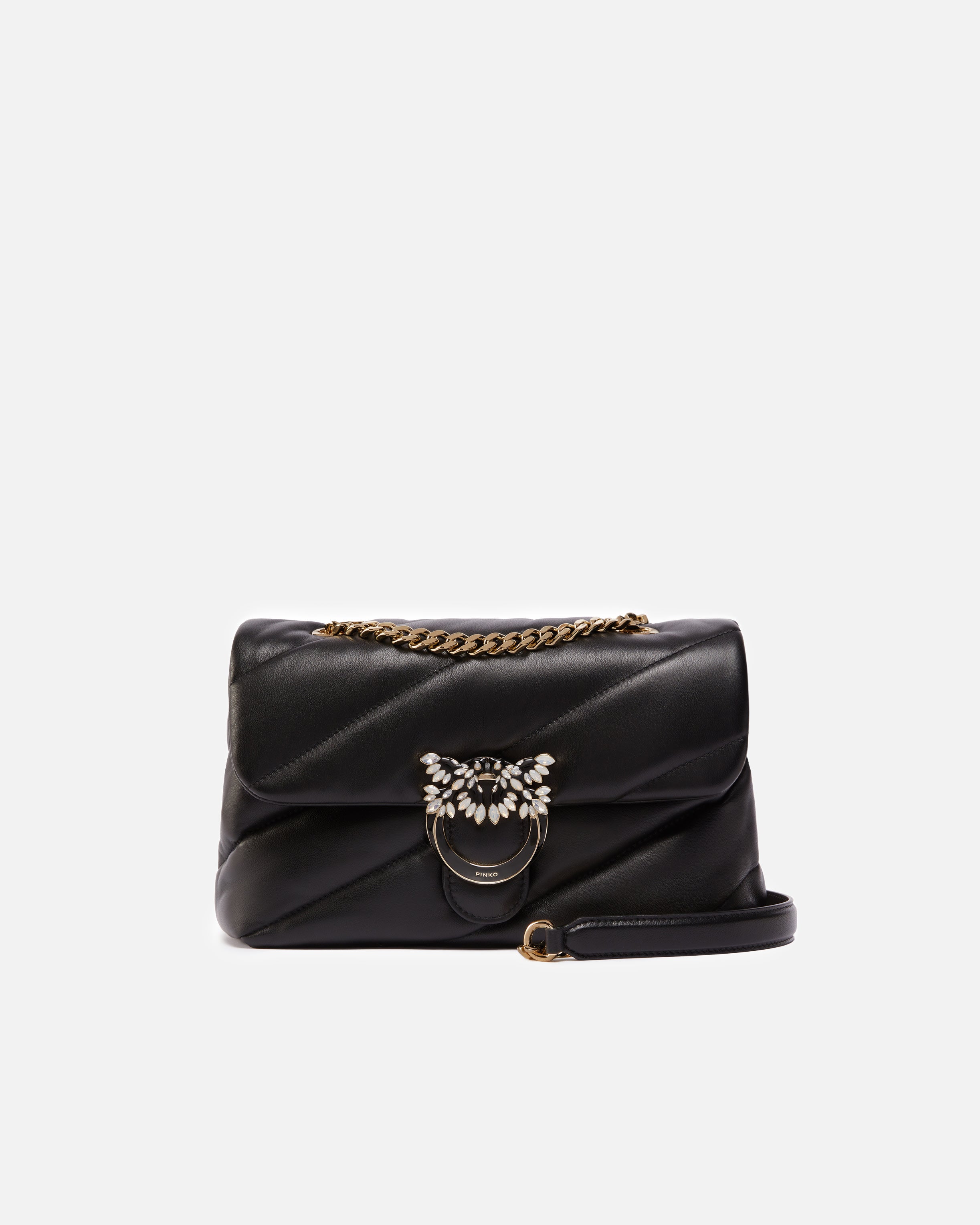 Love Bag Puff shoulder bag in soft quilted nappa leather with maxi oblique pattern, complete with sliding metal chain shoulder strap with nappa leather shoulder strap, which allows the bag to be carried both over the shoulder and on the shoulder, simply by doubling the chain. The Love Birds logo buckle that completes the closure is embellished with white enamel and pavé of black stones with an opalescent effect. The inside of the bag, lined in fabric, is complete with a partition that divides the space in two for a better organization of your essentials for each day. The bag is part of the special Limited Edition capsule collection made in a limited edition exclusively for PINKO Galleria. Use the special NFC chip to live a special experience dedicated to the bag you have purchased!