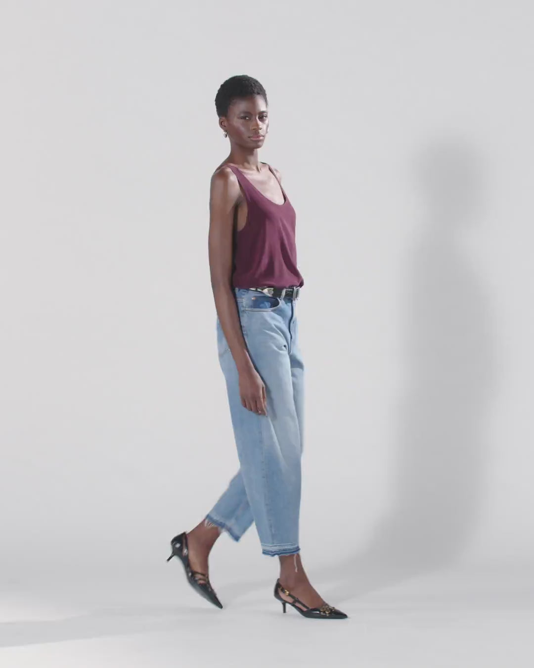 Five-pocket balloon-fit jeans with low waist and legs that are rounded at the top and tighter at the bottom. This model is made from medium-washed cotton and lyocell denim with fading for an eye-catching worn look, and is finished with reserve-dyed leg hems for a deconstructed effect. The darker wash of the fifth pocket, label and bottom of the garment provides a modern, PINKO-signature contrasting touch, while the iconic Love Birds logo is embroidered on one of the back pockets. Wear these jeans with the matching jacket for a modern head-to-toe denim look, or with your favourite T-shirt for a casual, laid-back mix suitable for any occasion.