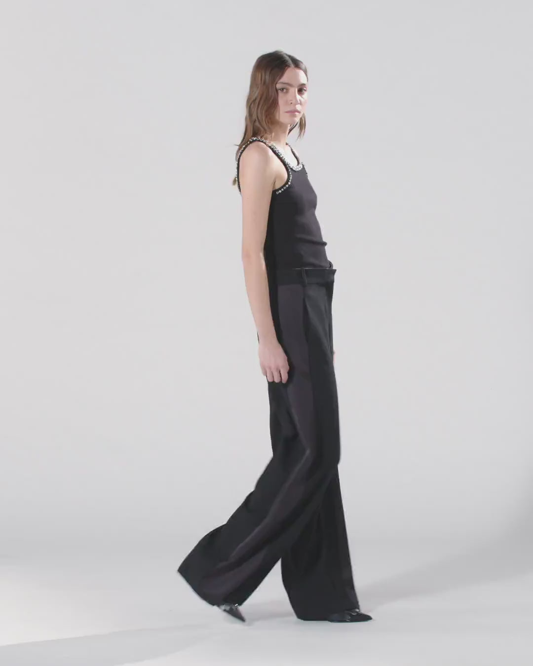 Vest top in ribbed cotton-blend jersey. The front and back necklines and shoulder straps are covered with expertly hand-embroidered crystals and shiny studs that add shimmer and exquisiteness to the garment. Make any outfit extra elegant and feminine with this top, which is perfect to wear under a jacket, paired with either tailored trousers or even a pair of special jeans. - CORIANDOLI TANK TOP
