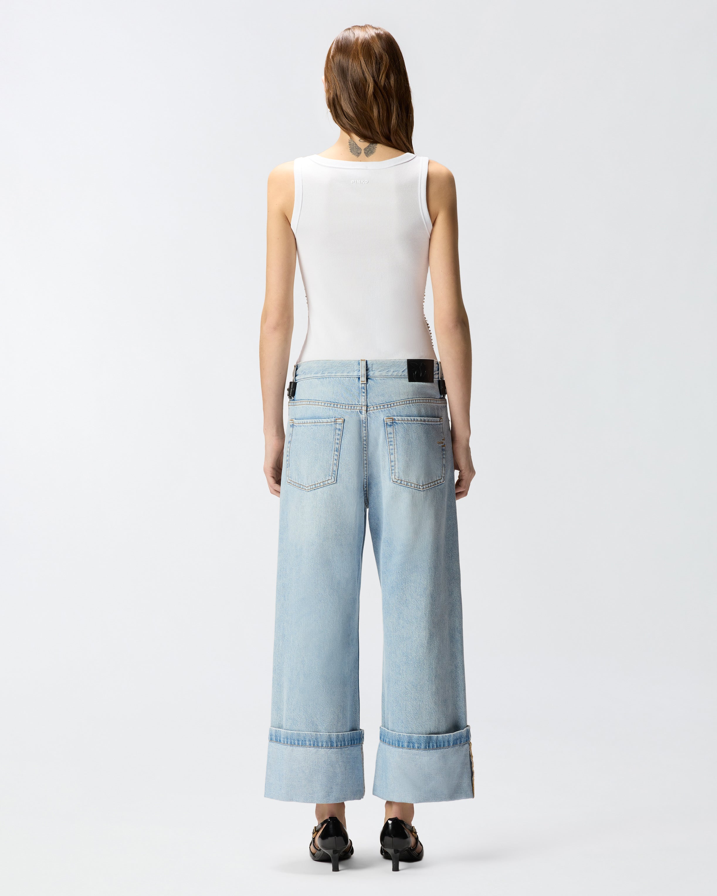 Vest top in finely ribbed cotton-blend fabric, embellished on the front with small jewel appliqués arranged into vertical stripes for a pinstriped effect. Make any outfit extra elegant and feminine with this top, which is perfect to wear under a jacket, paired with either tailored trousers or even a pair of special jeans.