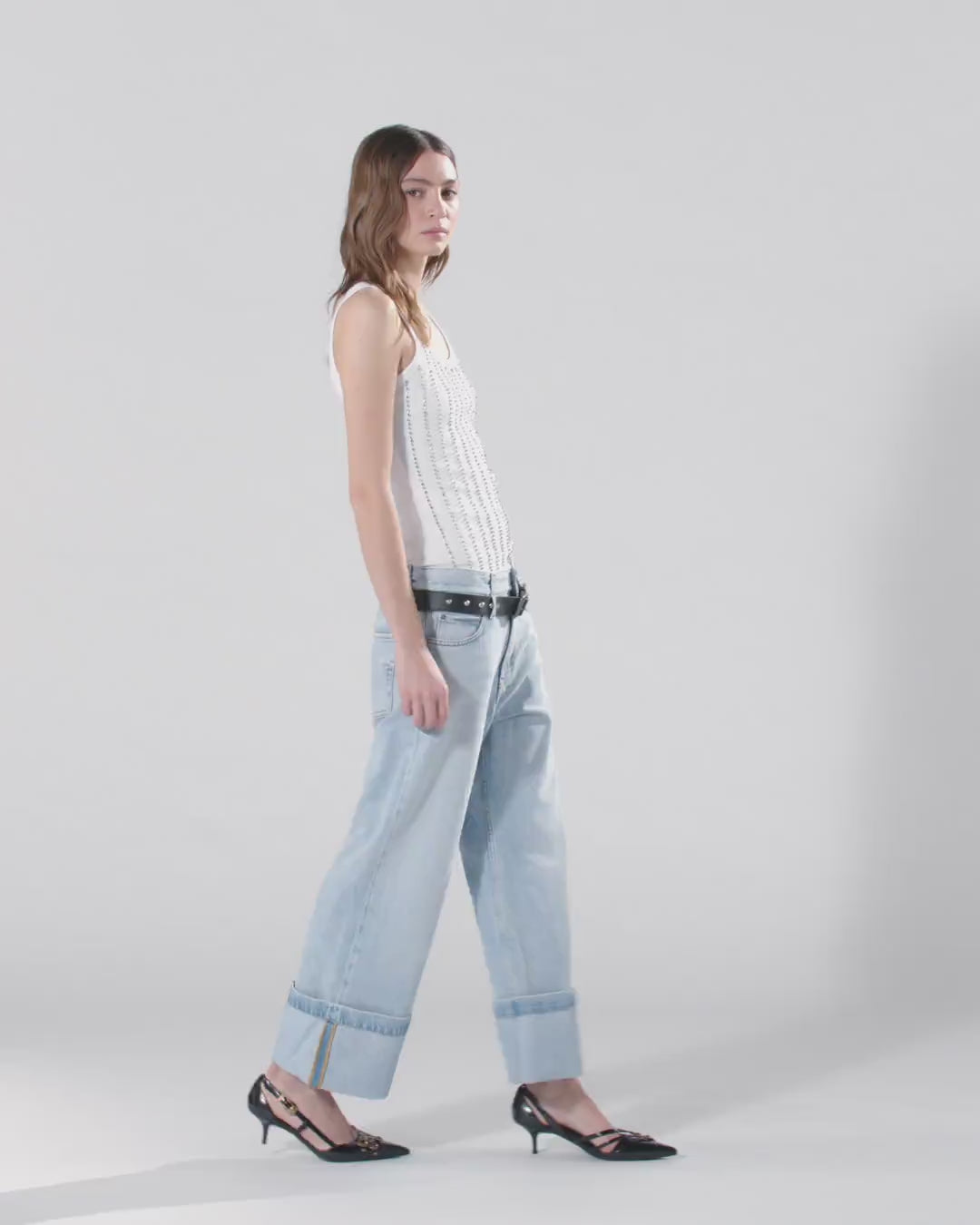 Five-pocket jeans in soft-feeling cotton and lyocell denim with light fading for a delicate worn effect. This model features cropped legs with a fixed cuff at the bottom and a removable, stud-embellished belt made from genuine leather. Thanks to their design with removable belt and two sets of belt loops at different heights, these jeans can be worn in three different ways: beltless for a cleaner and more relaxed look, high-waisted with the belt tightened for a paper-bag effect, or with the belt adjusted at the side for a loose, low-waisted fit. The amazing versatility of this garment makes it a winner for any woman's sunny-month wardrobe. - SIPARIO TROUSERS