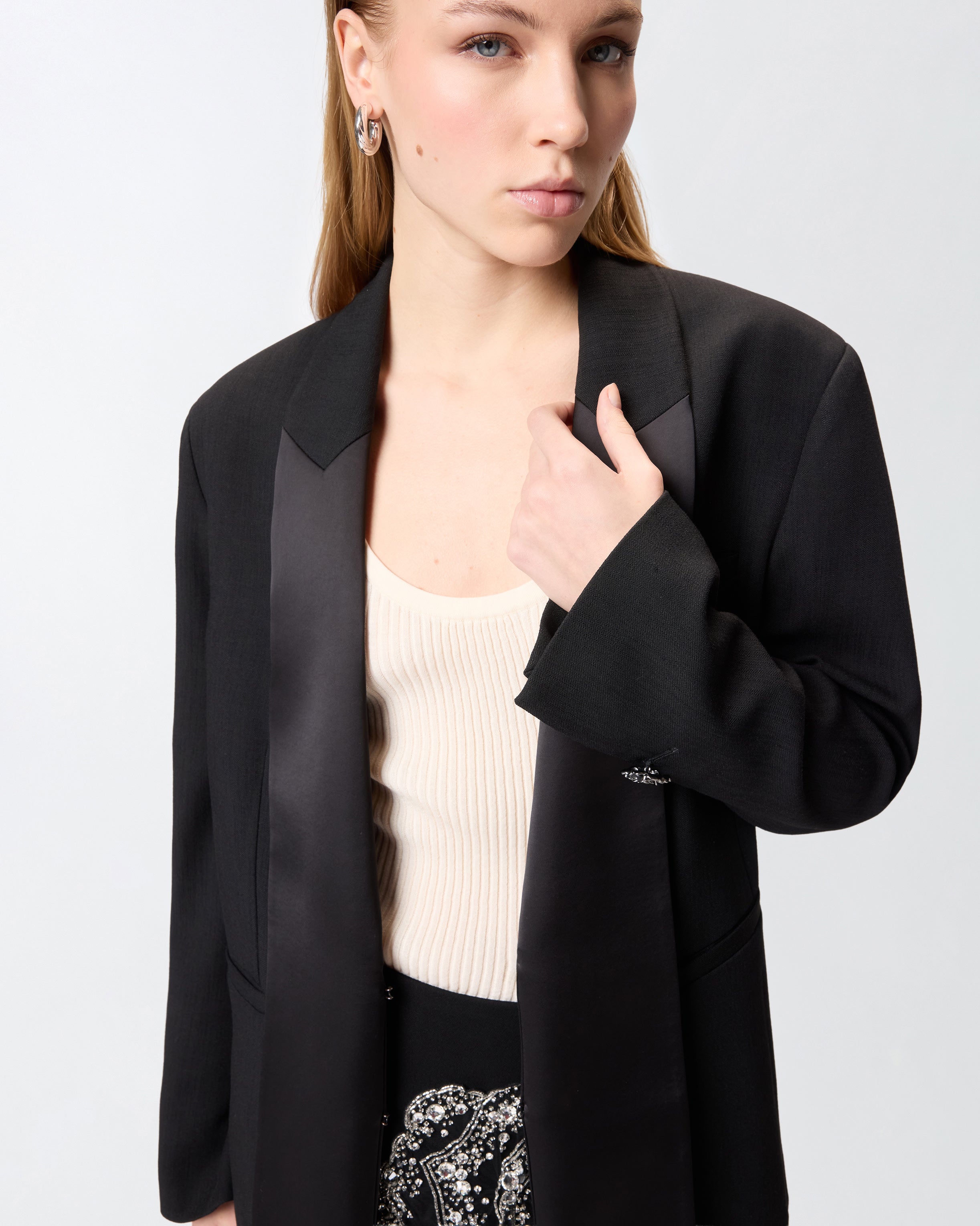 Jacket in yarn-dyed slub fabric with long lapels in smooth, shiny satin that provides delicate contrast against the main fabric for an elegant tuxedo look. Offering a flowing fit, this model also stands out for the small, jewel button-fastened slits on the cuffs, the welt pockets on the front and chest, and the double inner hook fastening. Refined and modern, this jacket will become the ace up your sleeve for formal occasions.
