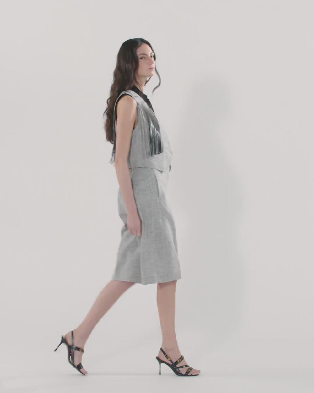 Vest in lightweight, yarn-dyed fil-à-fil cotton- and linen-blend slub fabric with button fastening at the front. This model features refined welt pockets at the front and a V-neck that contrasts with the pointed hem. The irregular, mottled texture of the fabric creates a two-tone optical effect, while the long fringes on the front and back give the garment a modern Texan-inspired character.