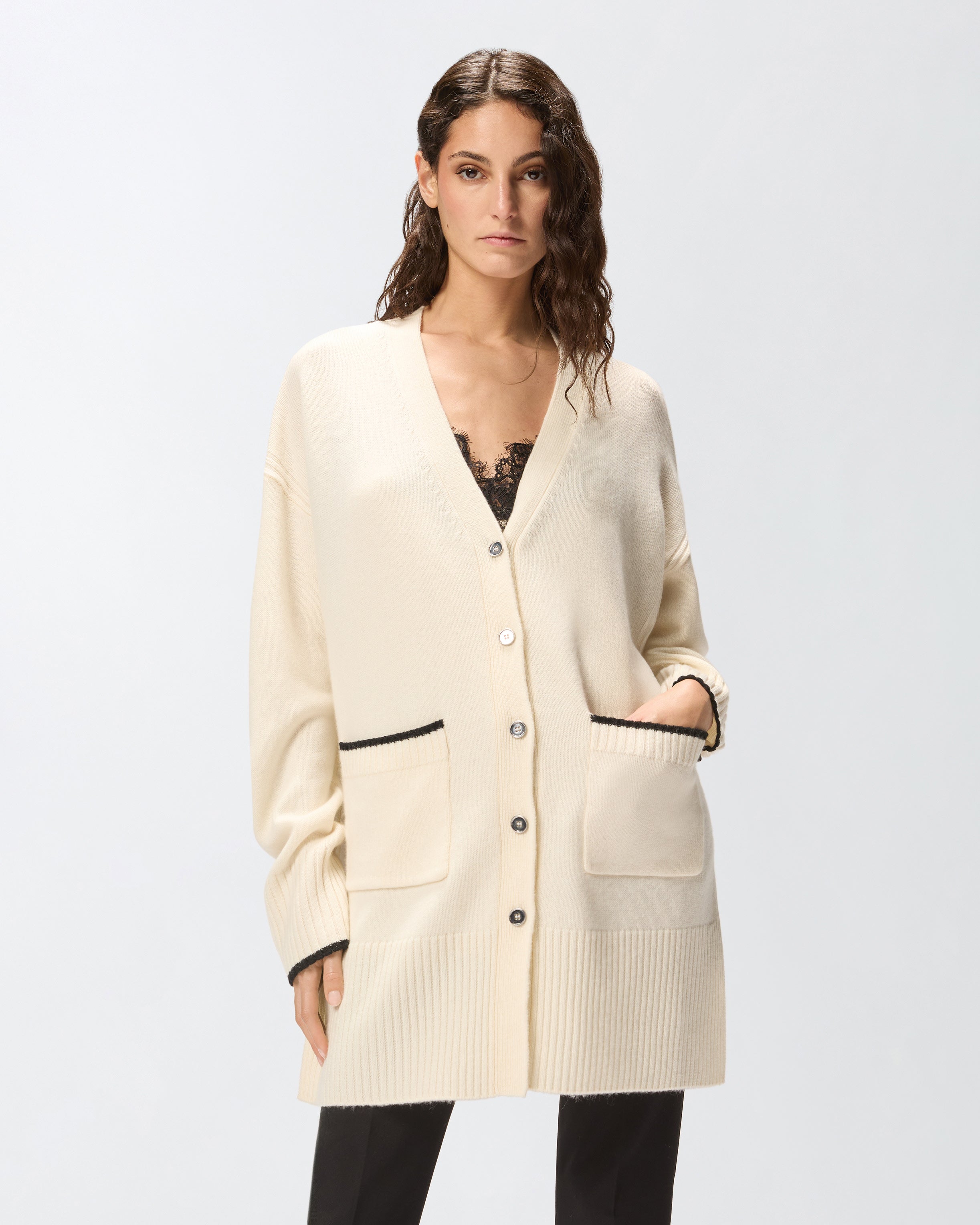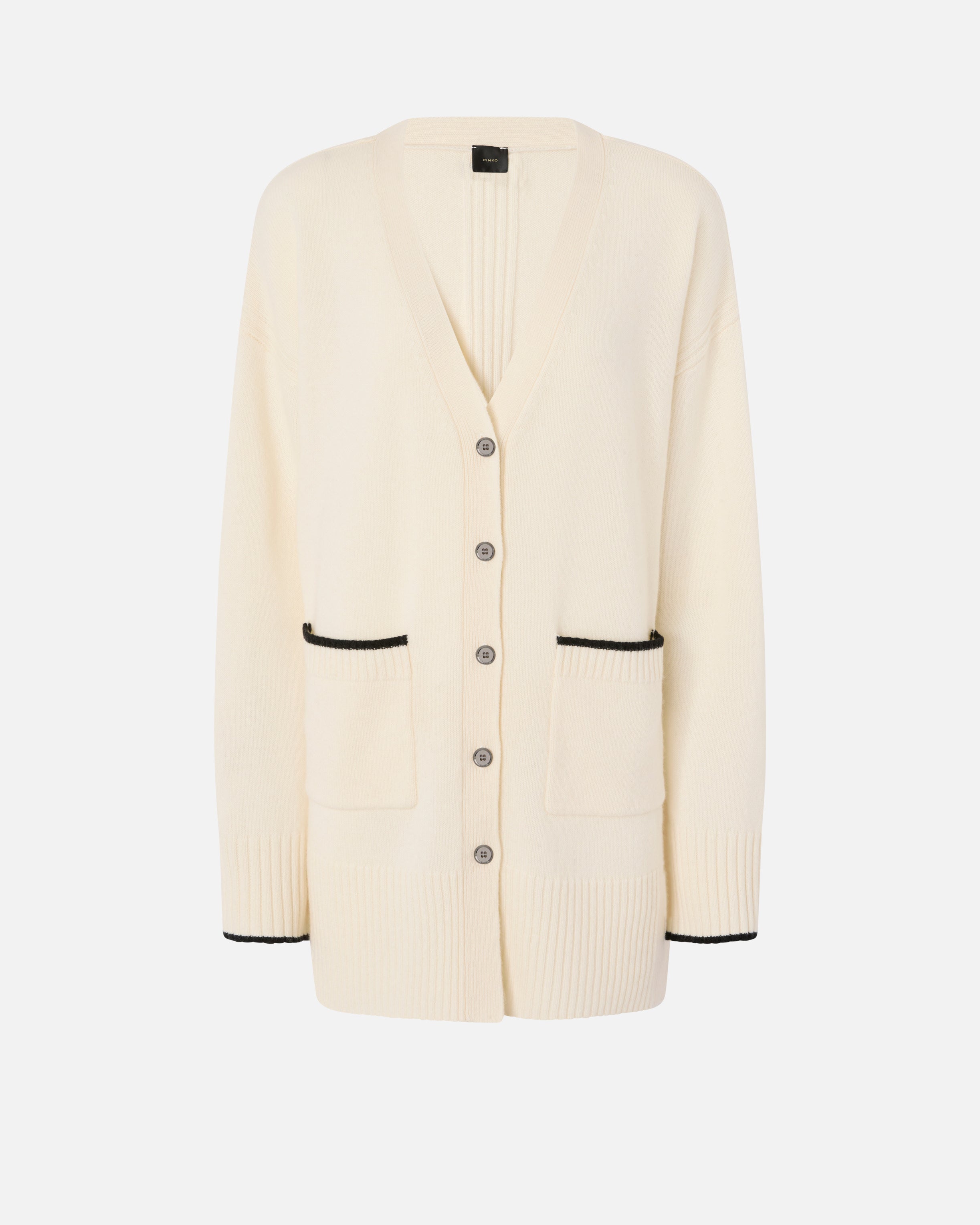 Długi kardigan z dekoltem w serek, z obniżoną linią ramion, wykonany z miękkiej mieszanki wełny merynosów i kaszmiru, idealny na relaksujące dni. Kontrastująca przędza w dyskretny i wyrafinowany sposób eksponuje kieszenie i obszycia rękawów. Odzież została poddana testom wykończeniowym, aby zminimalizować możliwość tworzenia się mechaceń i zapewnić większą miękkość i trwałość materiału. Brzeg i mankiety są wykończone ściągaczami, a zwieńczeniem jest etykietka w tym samym odcieniu z logo PINKO z tyłu na karku.