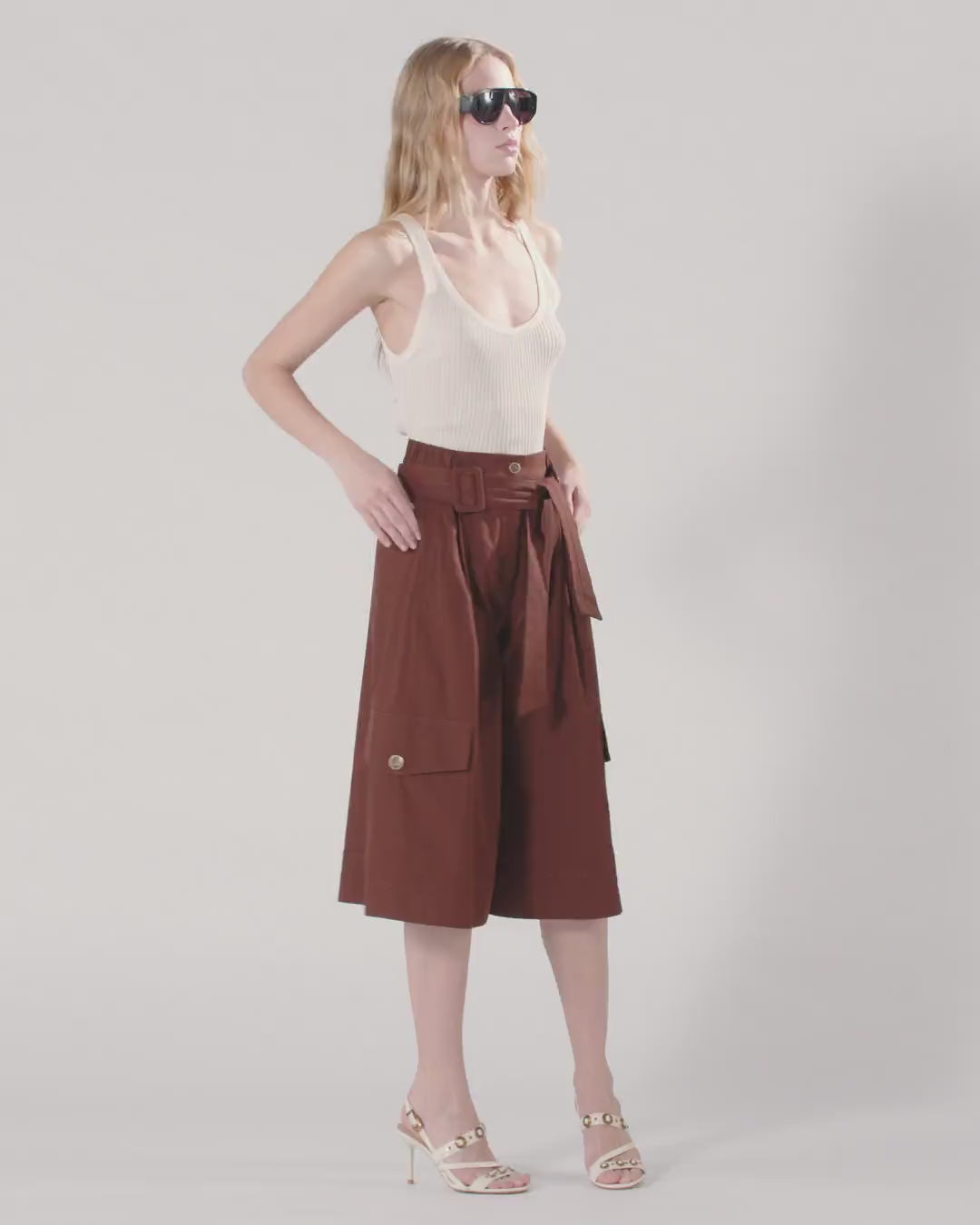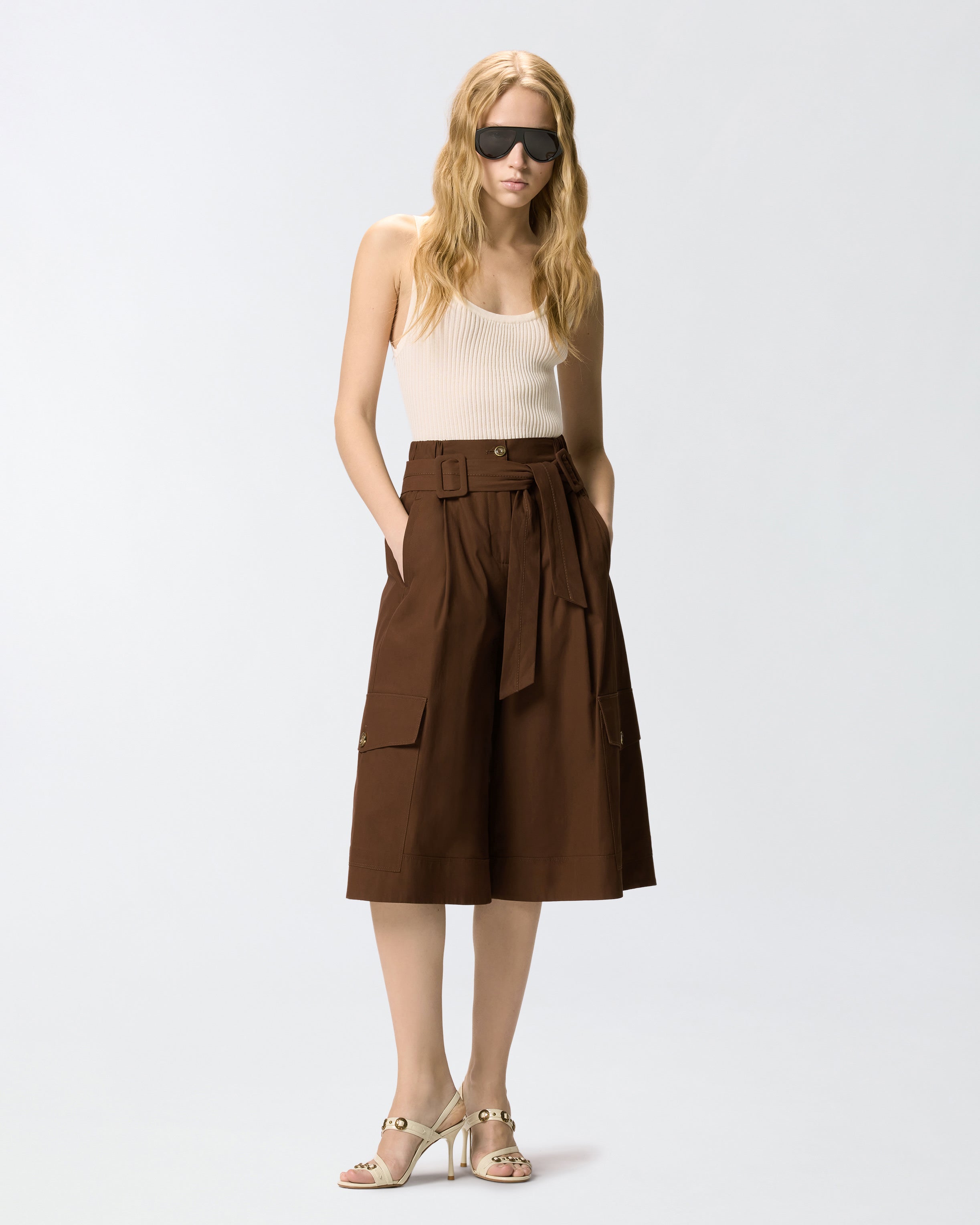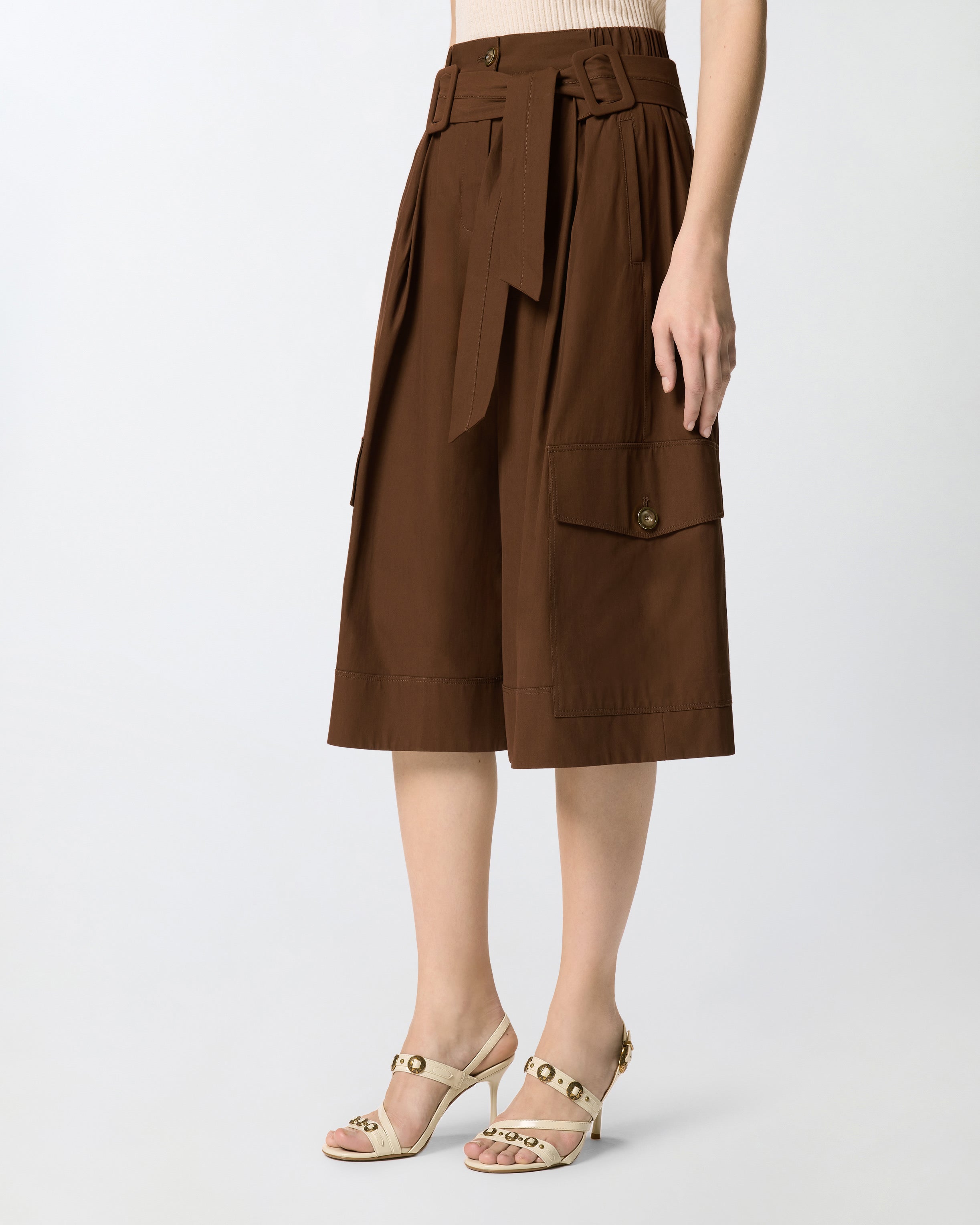 Długie bermudy z grubego i lejącego twillu z bawełny z dopracowanymi plisami z przodu, z dopasowanym paskiem z tkaniny z podwójną klamrą do zawiązania z przodu. Model ma również boczne kieszenie, tylne kieszenie z ramką, kieszenie z klapką i na guzik wzdłuż nogawek oraz elastyczną talię po bokach. Wewnętrzna podszewka zwiększa komfort noszenia. Elegancki i nowoczesny model będzie towarzyszyć twoim stylizacjom zawsze i wszędzie. - PATRICIA BERMUDA SHORTS