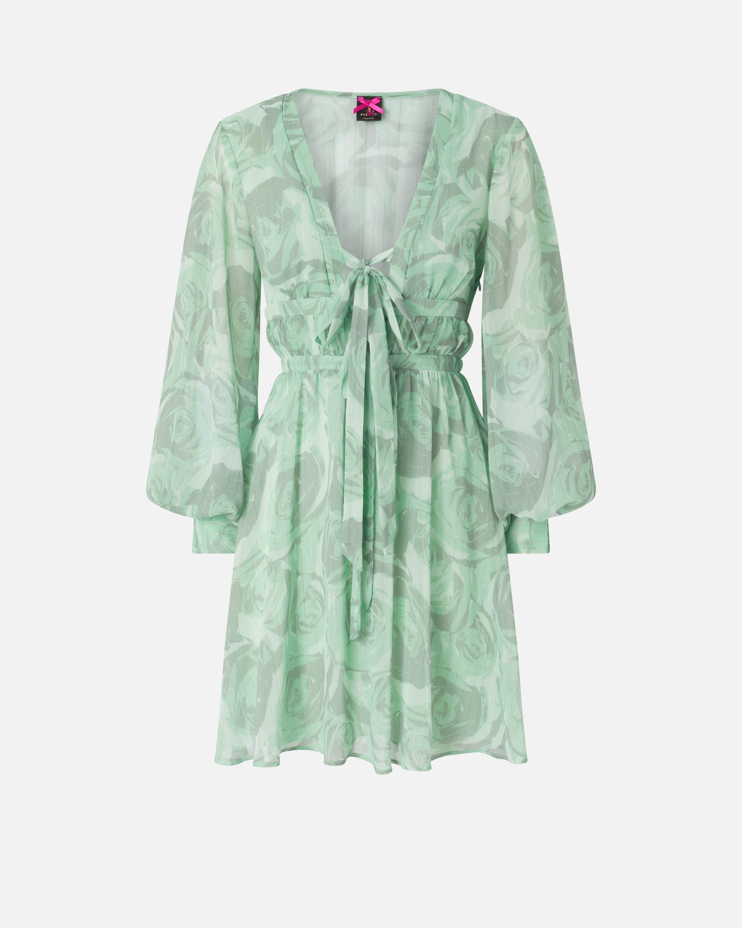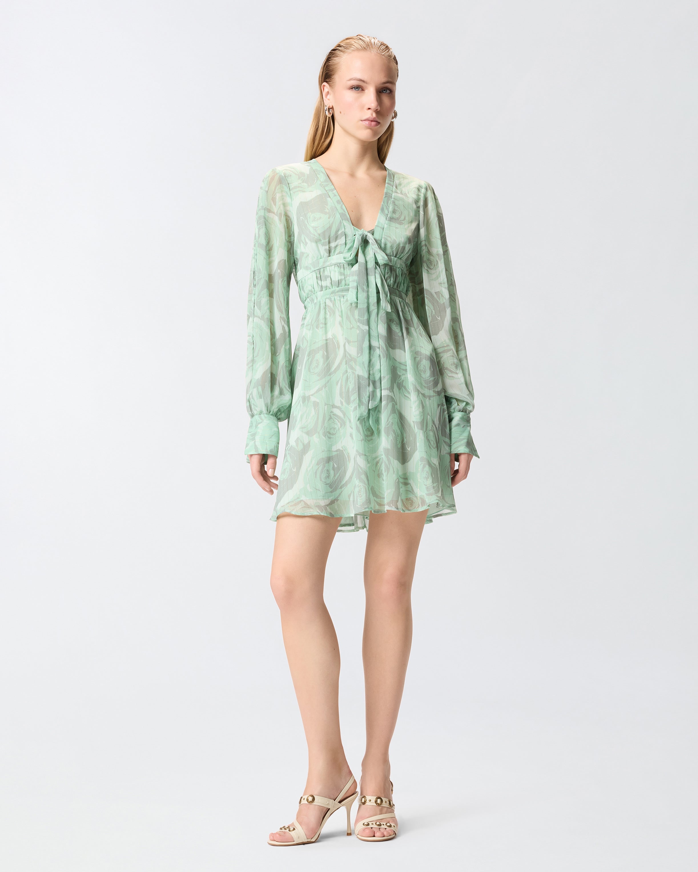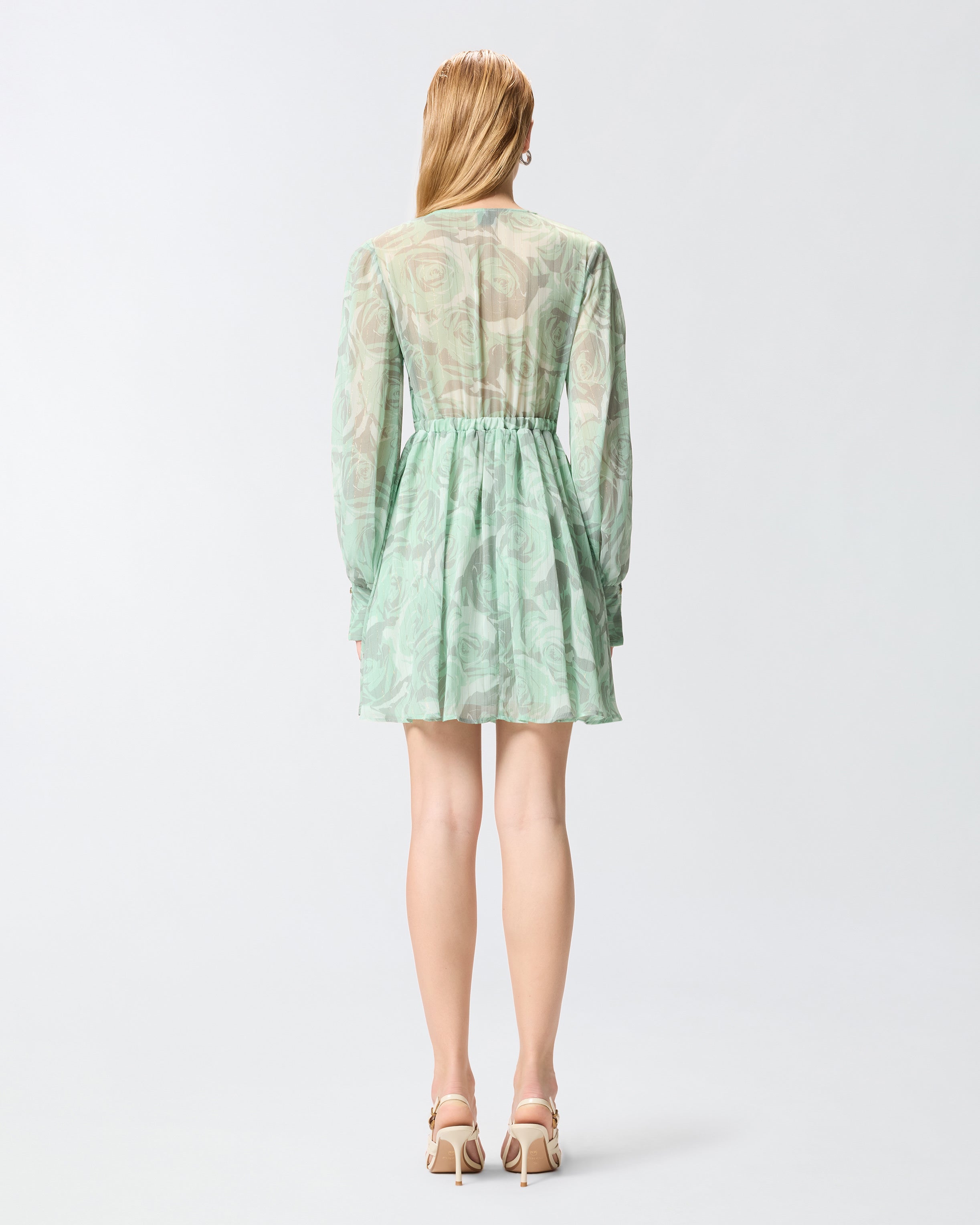 Krótka sukienka z miękkim dołem z zakładkami, z długimi bufiastymi rękawami z mankietami, elastycznym paskiem z metalowymi zakończeniami i głębokim dekoltem w kształcie litery V z miękkimi tasiemkami do zawiązania kokardki. Model, uszyty z lekkiego marszczonego kreponu z delikatną metaliczną nitką, idealnie wprowadzającą odrobinę dynamiki i blasku wraz z nadrukiem róż w tym samym odcieniu i z trójwymiarowym efektem. Delikatne przezroczystości, złagodzone podszewką, i żywa faktura sprawiają, że model ten jest niezwykle kobiecy, doskonały na uroczystości lub na bardziej formalną okazję, aby wyróżnić się z wdziękiem.