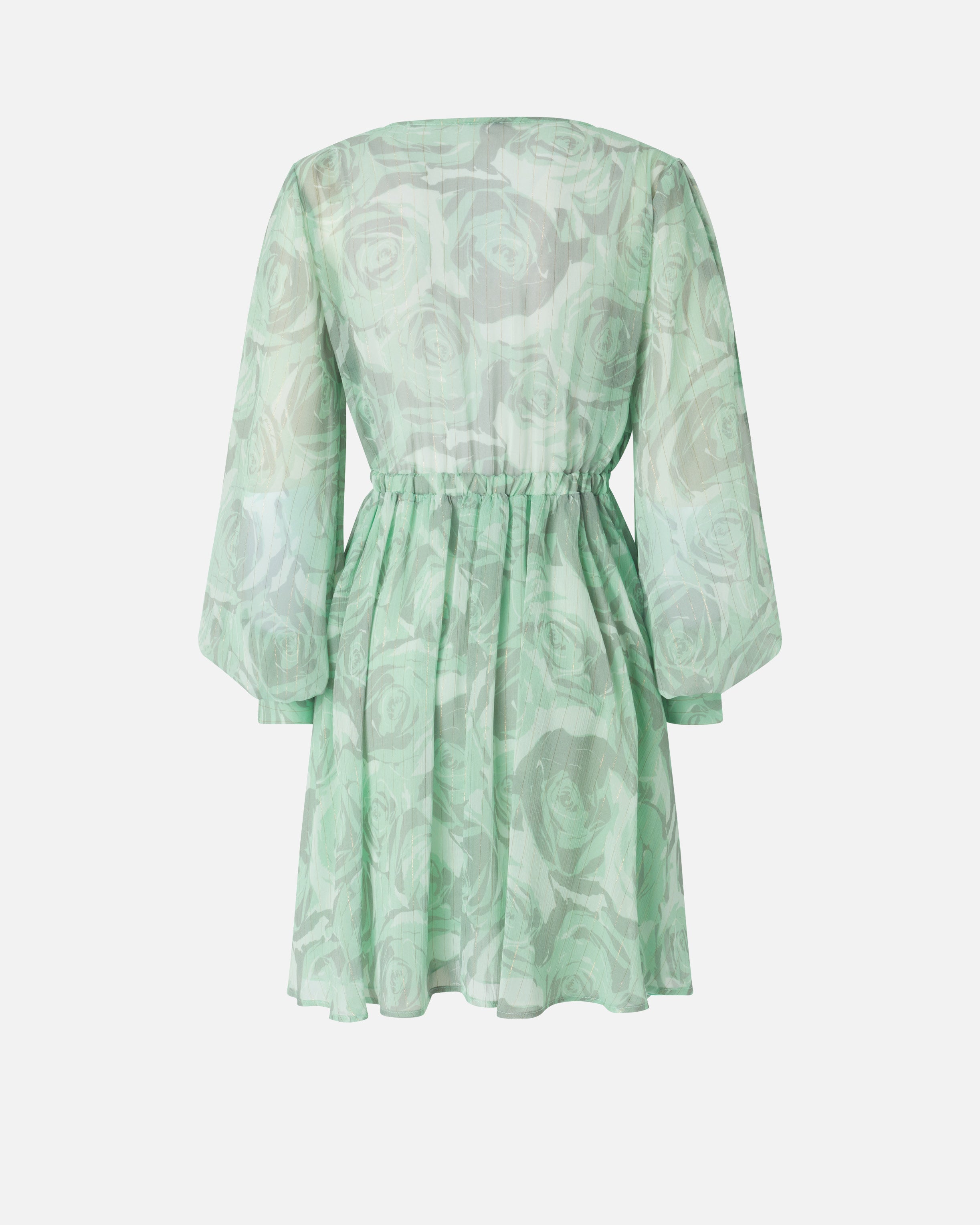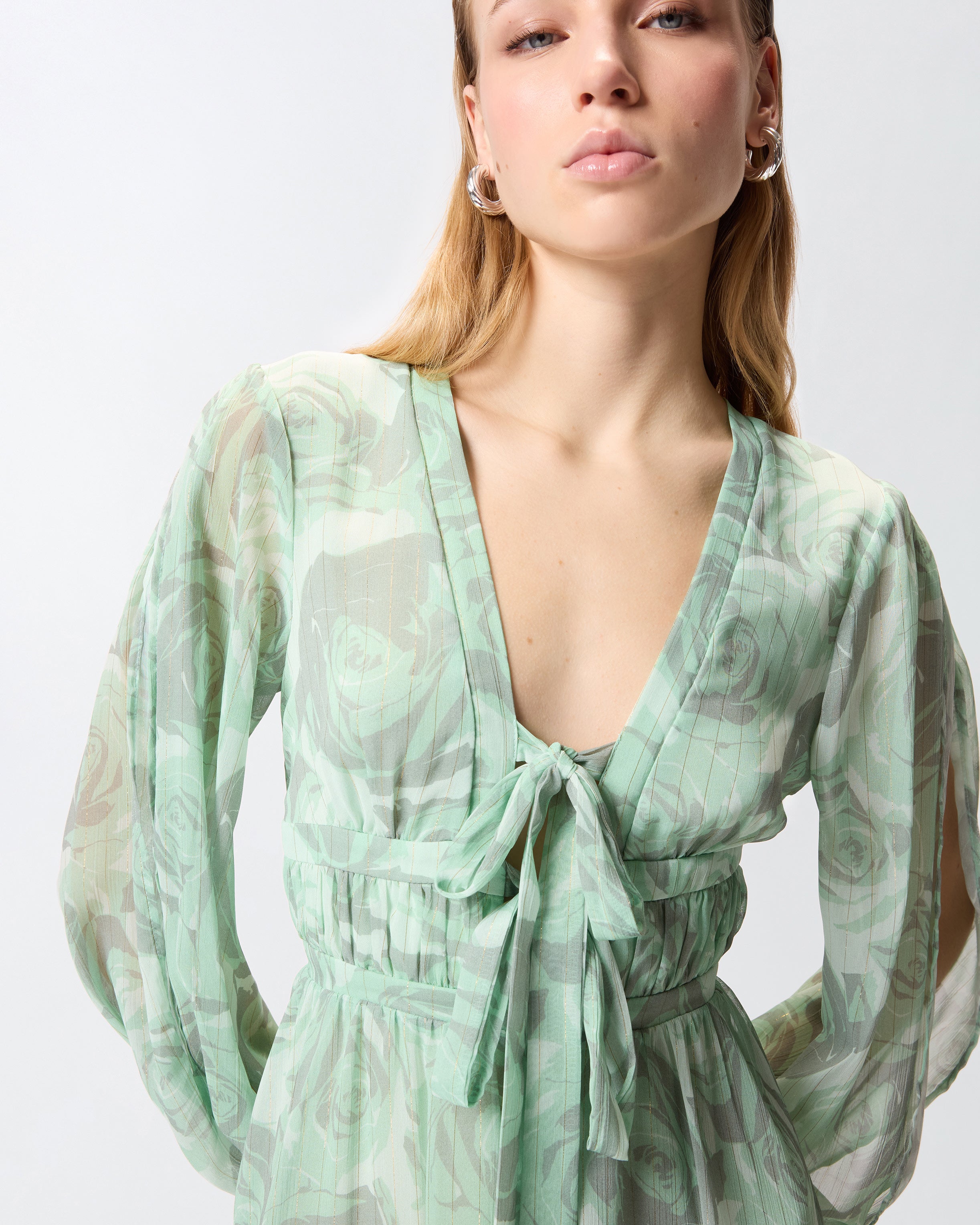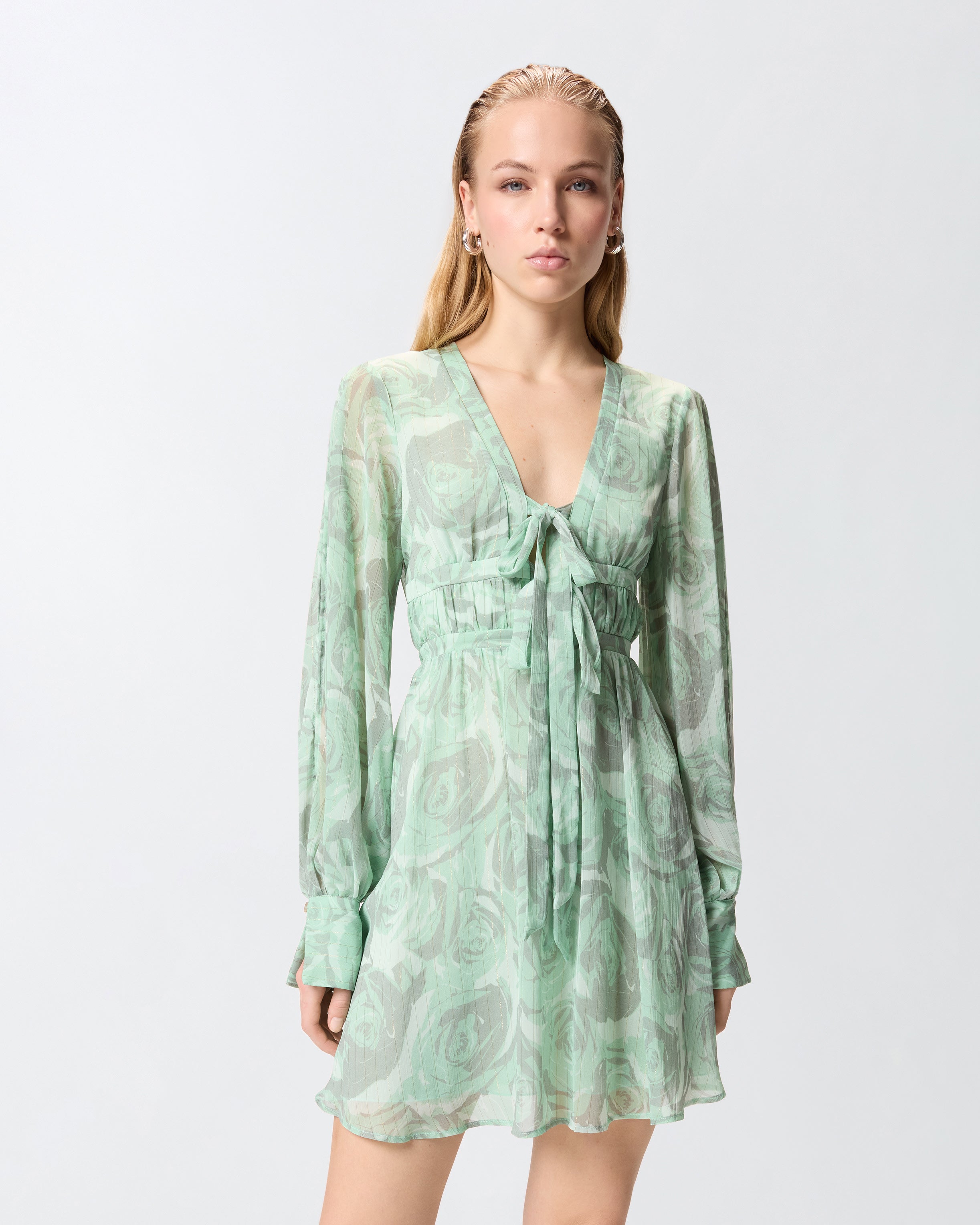 Krótka sukienka z miękkim dołem z zakładkami, z długimi bufiastymi rękawami z mankietami, elastycznym paskiem z metalowymi zakończeniami i głębokim dekoltem w kształcie litery V z miękkimi tasiemkami do zawiązania kokardki. Model, uszyty z lekkiego marszczonego kreponu z delikatną metaliczną nitką, idealnie wprowadzającą odrobinę dynamiki i blasku wraz z nadrukiem róż w tym samym odcieniu i z trójwymiarowym efektem. Delikatne przezroczystości, złagodzone podszewką, i żywa faktura sprawiają, że model ten jest niezwykle kobiecy, doskonały na uroczystości lub na bardziej formalną okazję, aby wyróżnić się z wdziękiem.