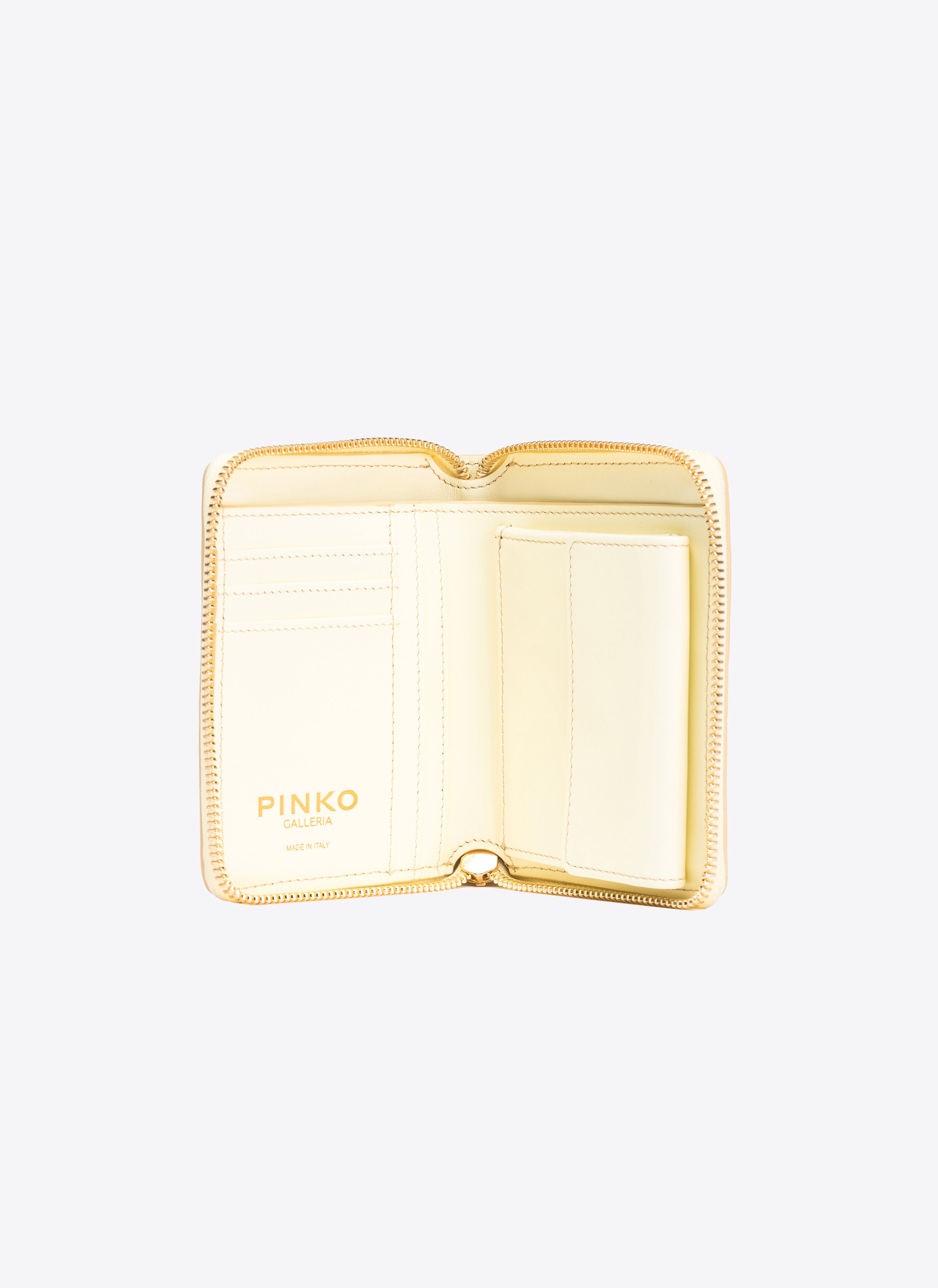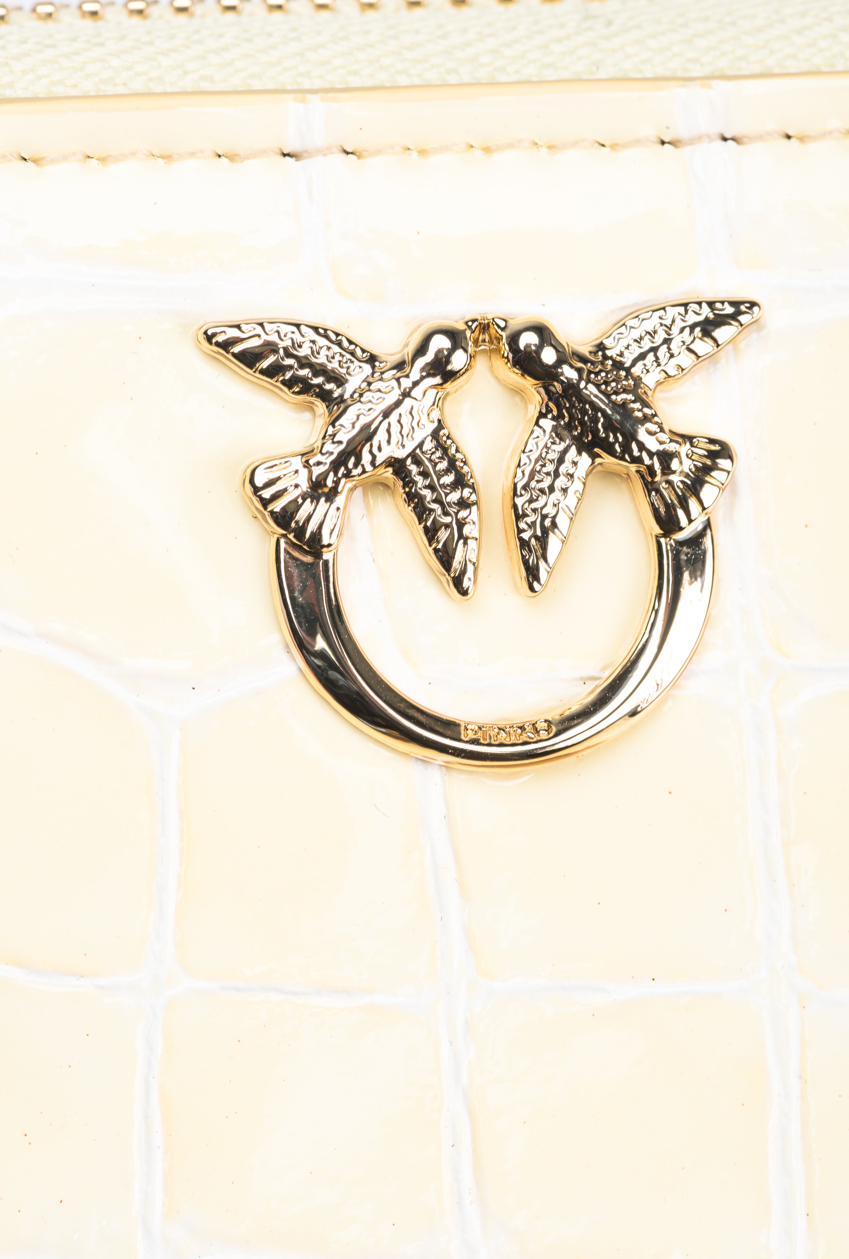 Kwadratowy portfel zapinany dookoła na zamek, wykonany ze skóry z lekko wypukłym, błyszczącym deseniem krokodyla, posiada plakietkę Love Birds Diamond Cut na podkładce ze skóry. Wnętrze wykończone materiałową podszewką. Zapięcie na zamek. Dodatek pochodzi ze specjalnej kolekcji kapsułowej Limited Edition, wykonanej w limitowanej ilości wyłącznie dla PINKO Galleria.