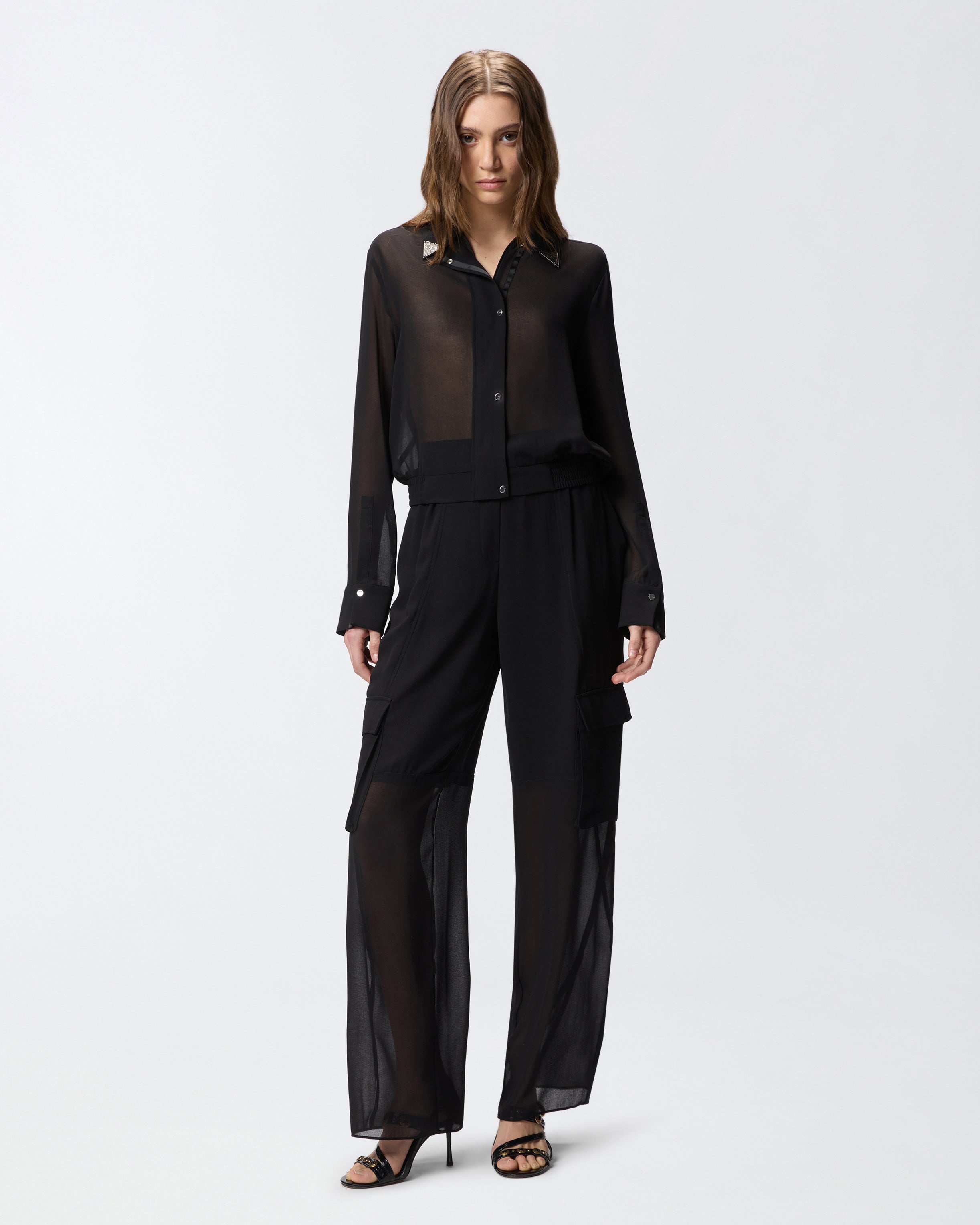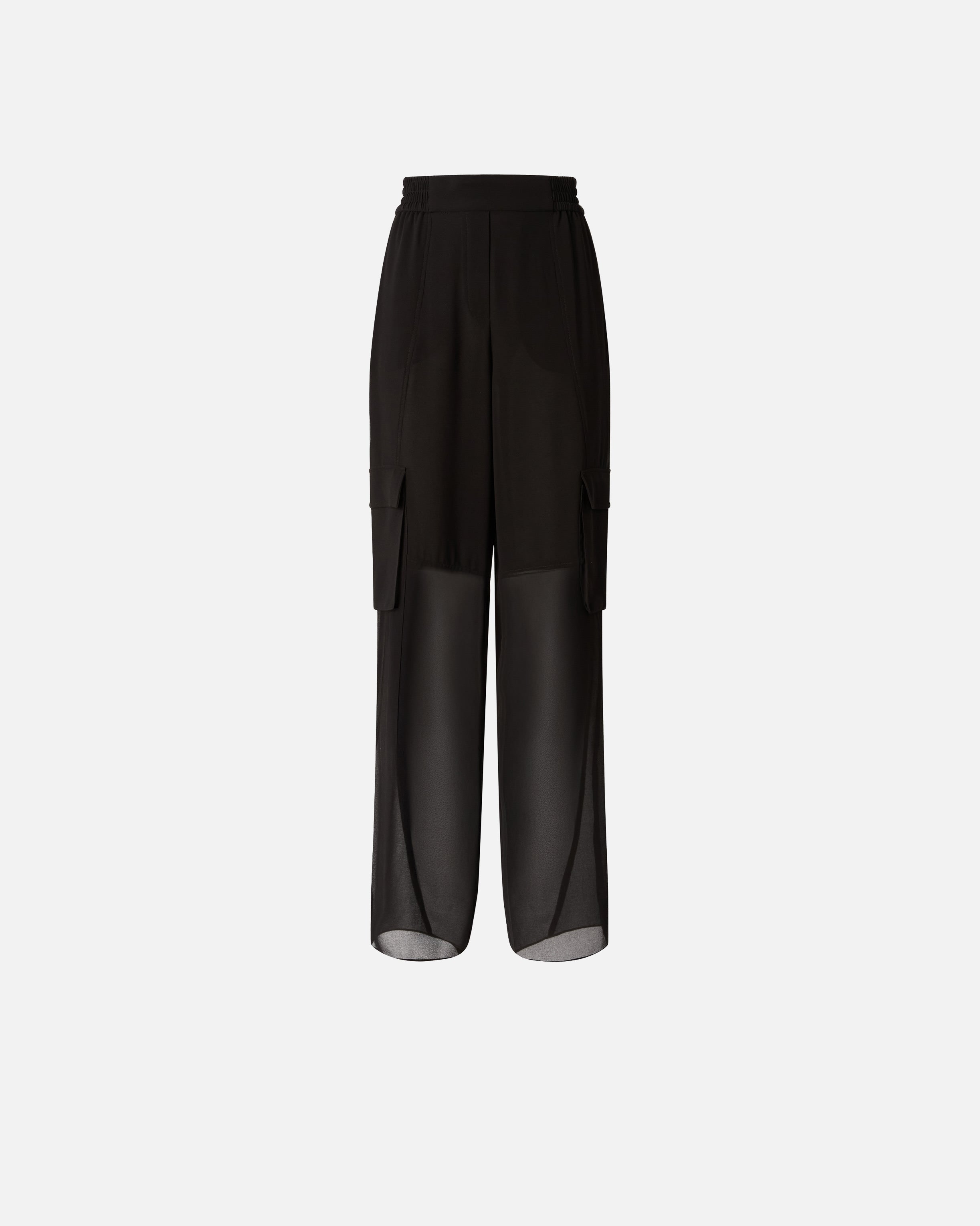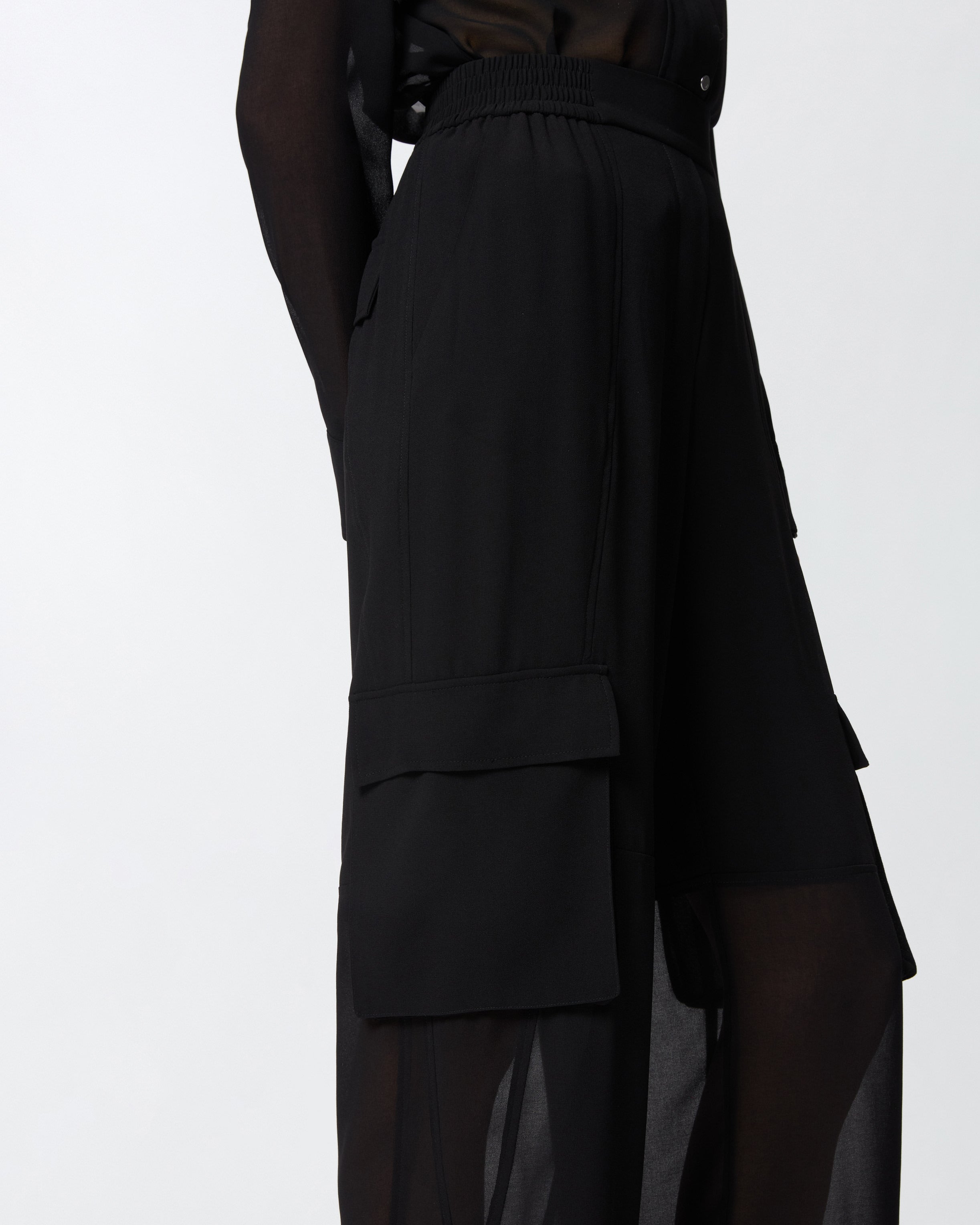 Spodnie z prostą i miękką nogawką, uszyte z lekkiej żorżety. Model jest wykończony elastycznym pasem z przeszyciami po bokach, dwiema kieszeniami z tyłu z klapką oraz dwiema kieszenie z mieszkiem na nogawce. Spodnie mają podszewkę zwiększającą komfort noszenia. Minimalistyczny i nowoczesny model będzie towarzyszyć twoim stylizacjom zawsze i wszędzie.
