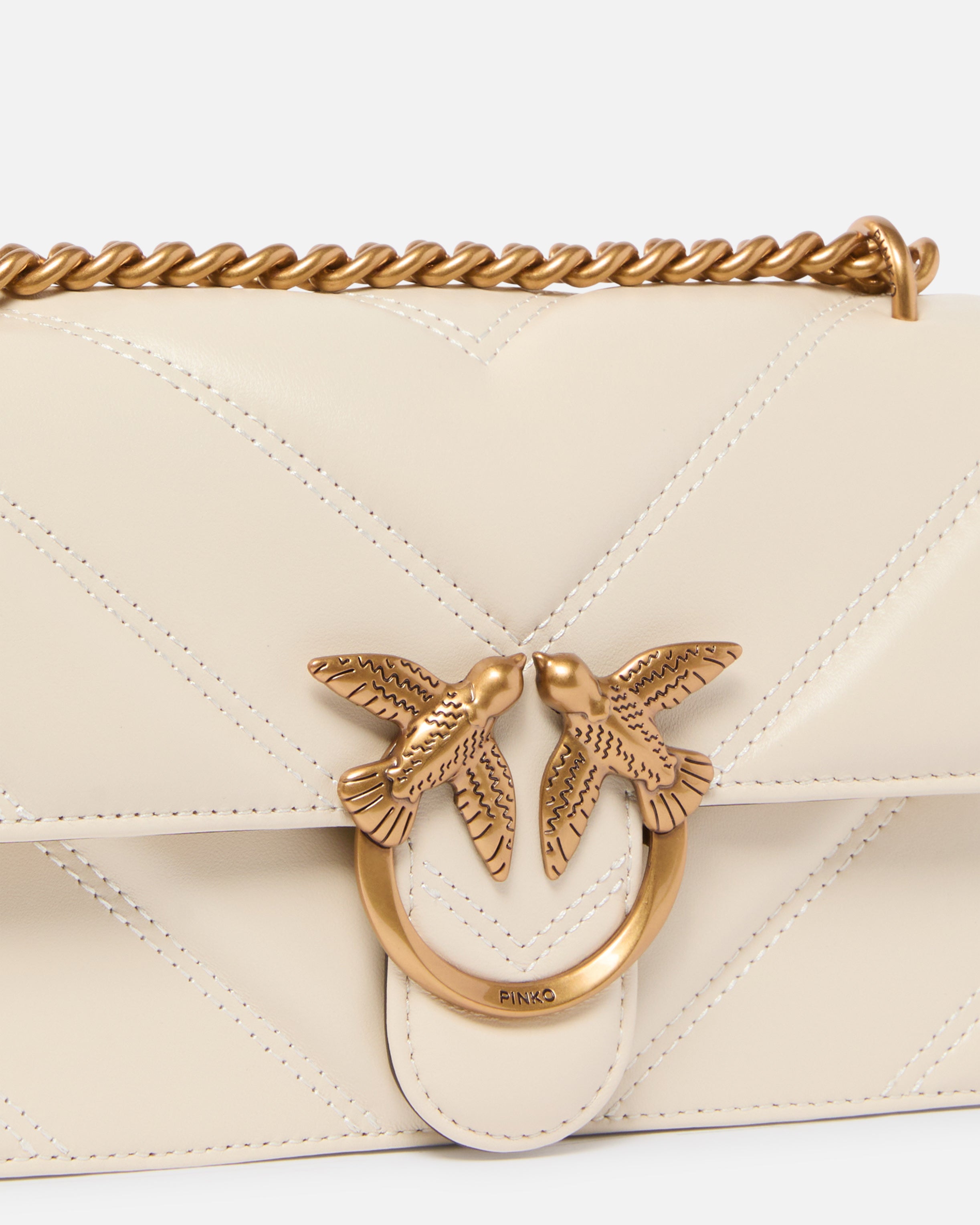 Mała torebka do ręki Love Bag One ze skóry ozdobionej pikowaniem w jodełkę, o lekkiej, nieregularnej konstrukcji. Regulowany długi skórzany pasek sprawiają, że model jest niezwykle uniwersalny i praktyczny. Klamra z logo Love Birds Diamond Cut w kolorze złotym stanowi dopełnienie zapięcia w stylu PINKO. Wnętrze torebki wyściełane jest bawełną i zawiera płaską boczną kieszonkę zapinaną na zamek. Aktywuj swoją torebkę PINKO: sprawdź autentyczność swojego produktu i dołącz do spersonalizowanych wrażeń, w tym celu zbliż swój smartfon do haftu Love Birds, który znajdziesz z tyłu torebki!