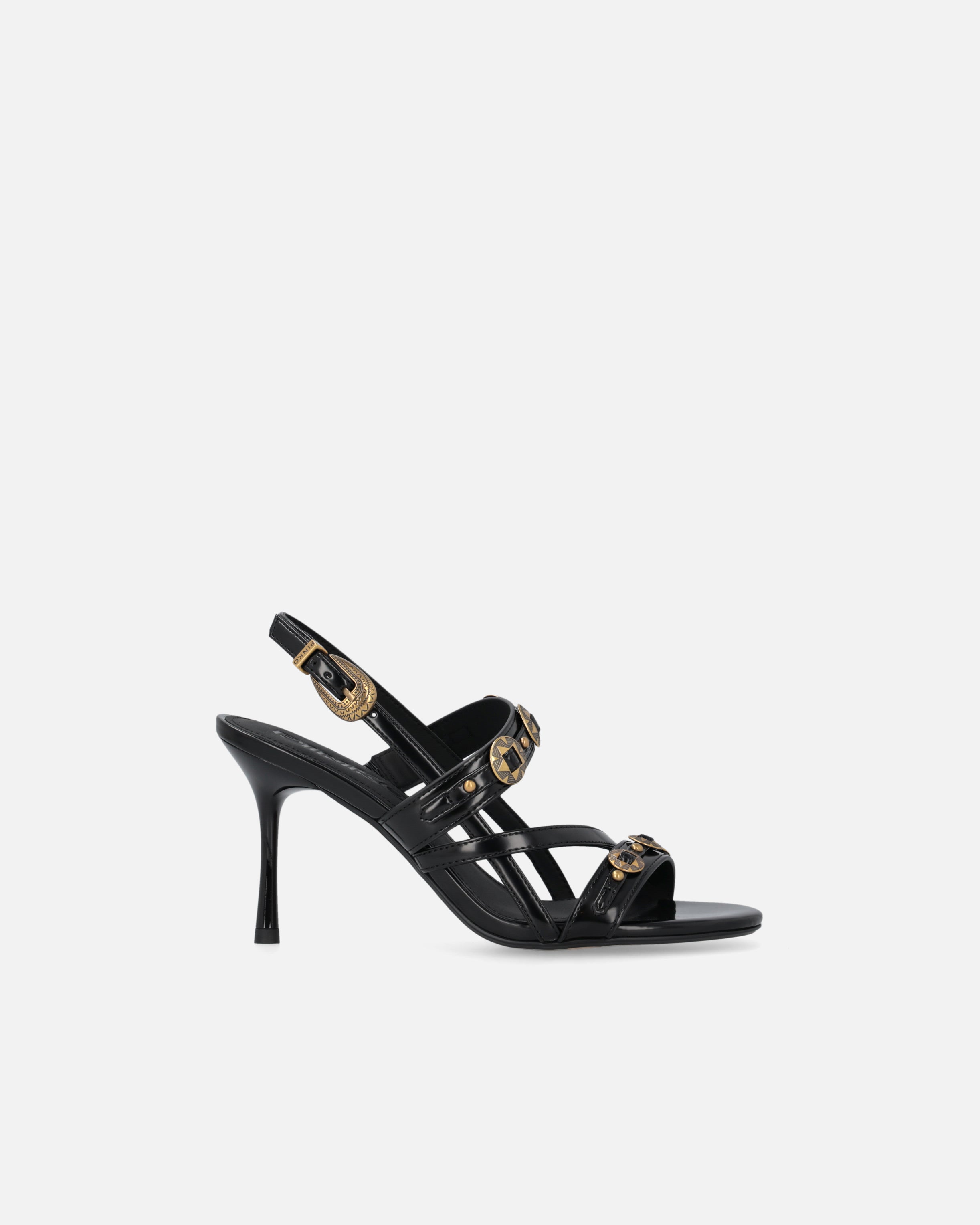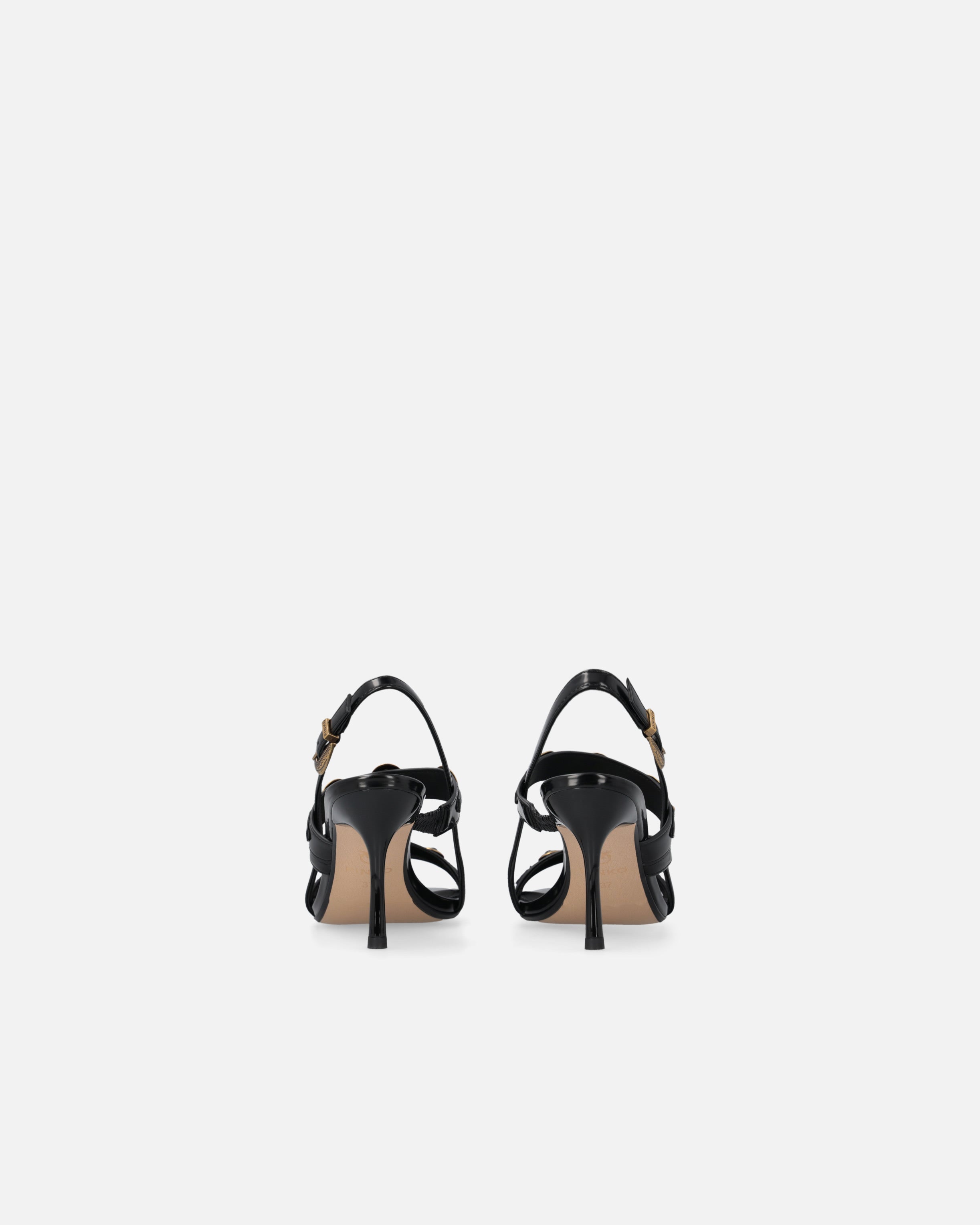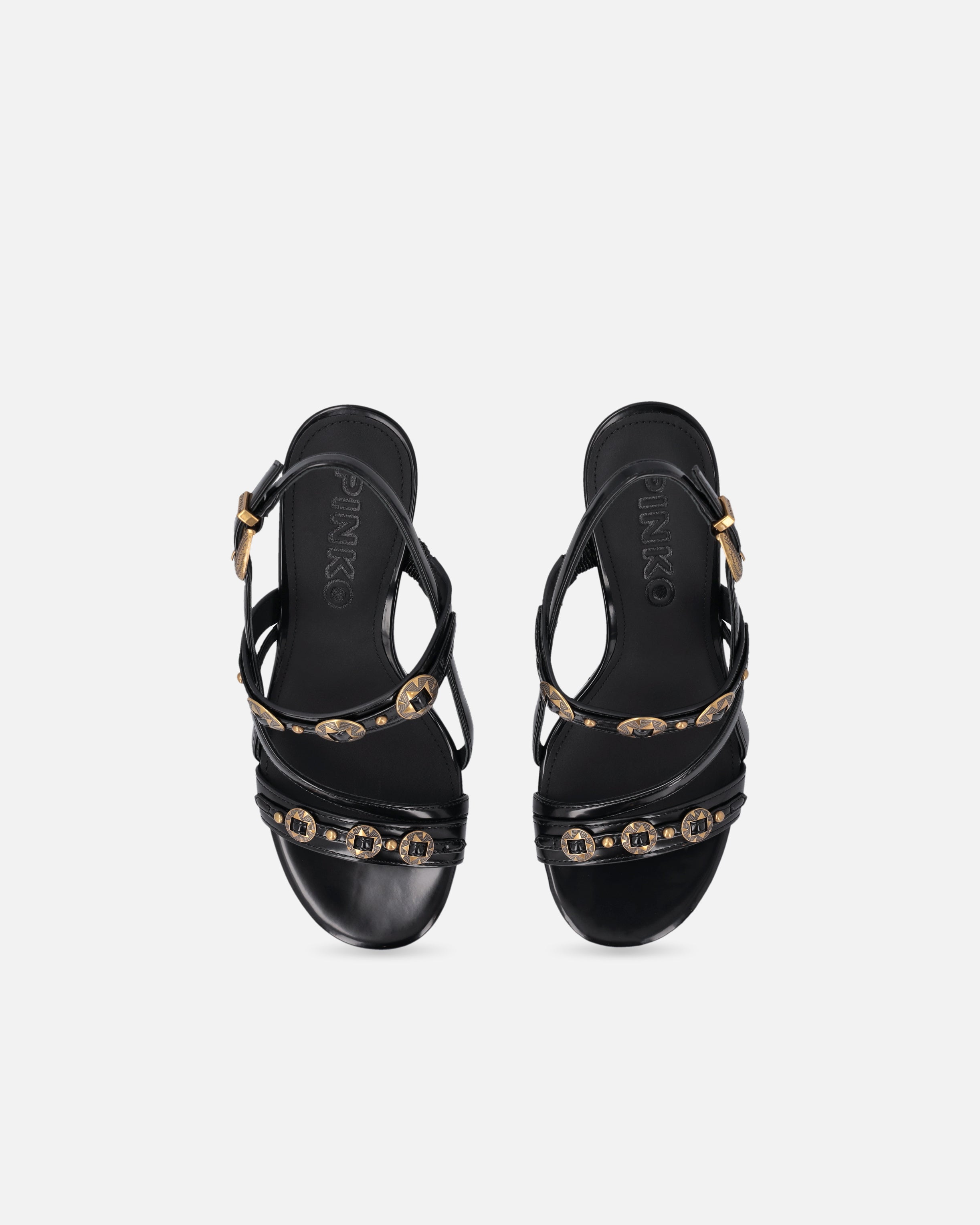 Sandały typu slingback na wysokim obcasie, zaokrąglonym noskiem z wytrzymałego materiału imitującego szorstką skórę i charakteryzujące się cienkimi paseczkami, które uwodzicielsko krzyżują się na wierzchu stopy. Model wyróżnia się dbałością o detale typowe dla kreacji PINKO: ćwieki nabite na dwóch opaskach, wprowadzające rockowy i wyrafinowany klimat, oraz starannie dopracowana, metalowa, biżuteryjna klamra, która stanowi dodatkowy cenny element oraz przepięknie wieńczy praktycznym akcentem tylny regulowany paseczek. Skórzana wkładka podnosi komfort noszenia, a gumowa podeszwa sprawia, że każdy krok jest bezpieczny, więc prezentowane sandały na wysokim obcasie wprowadzą wyrazisty i elegancki akcent do twoich outfitów na uroczystości i specjalne wydarzenia. - VANDA 01
