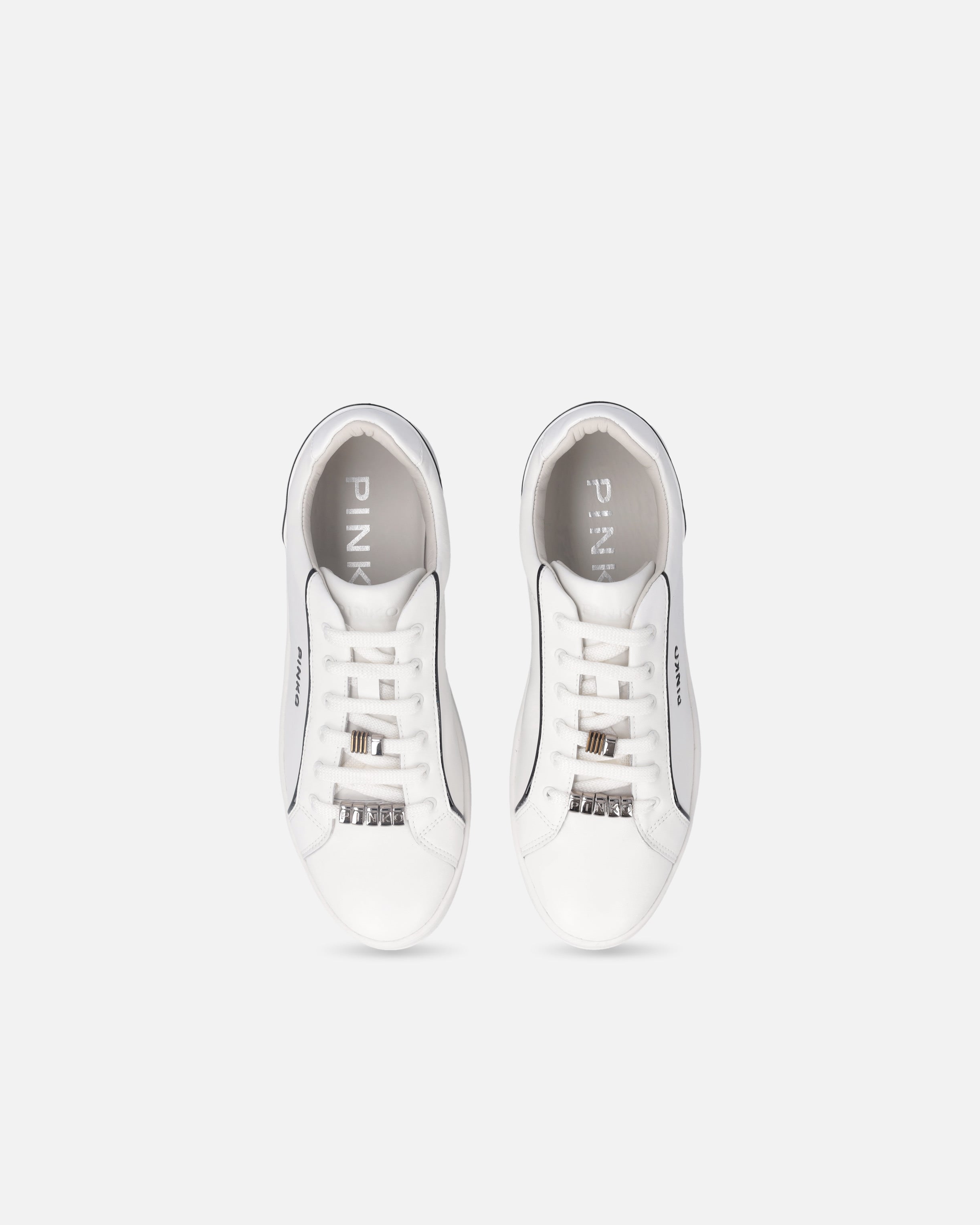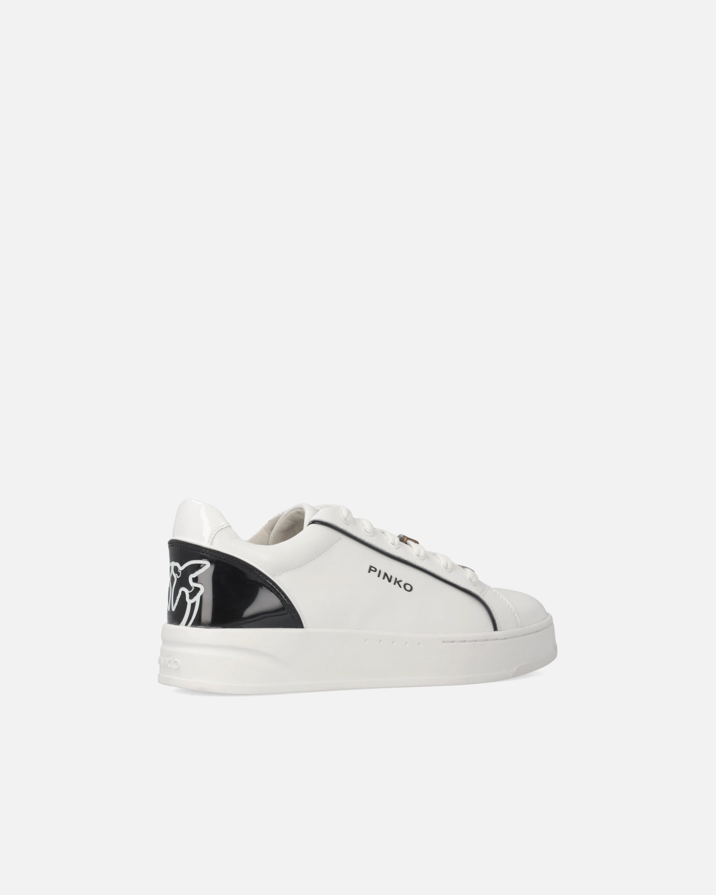 Buty sportowe ze sznurowadłami, wykonane z gładkiej skóry i tkaniny technicznej. Model charakteryzuje się subtelnymi kontrastami stworzonymi przez lamówkę wzdłuż przyszwy, napisem z logo PINKO z boku oraz błyszczącym obcasem ozdobionym kultowym logo Love Birds. Ostatnim stylowym akcentem są metalowe kółeczka, które zdobią sznurówki z napisem logo PINKO. Gruba gumowa podeszwa i skórzana wkładka, oba oznaczone marką, zapewniają natychmiastowy komfort. Idealny model dla tych, które kochają wyróżniać się ze stylem, ale bez poświęcania praktyczności.