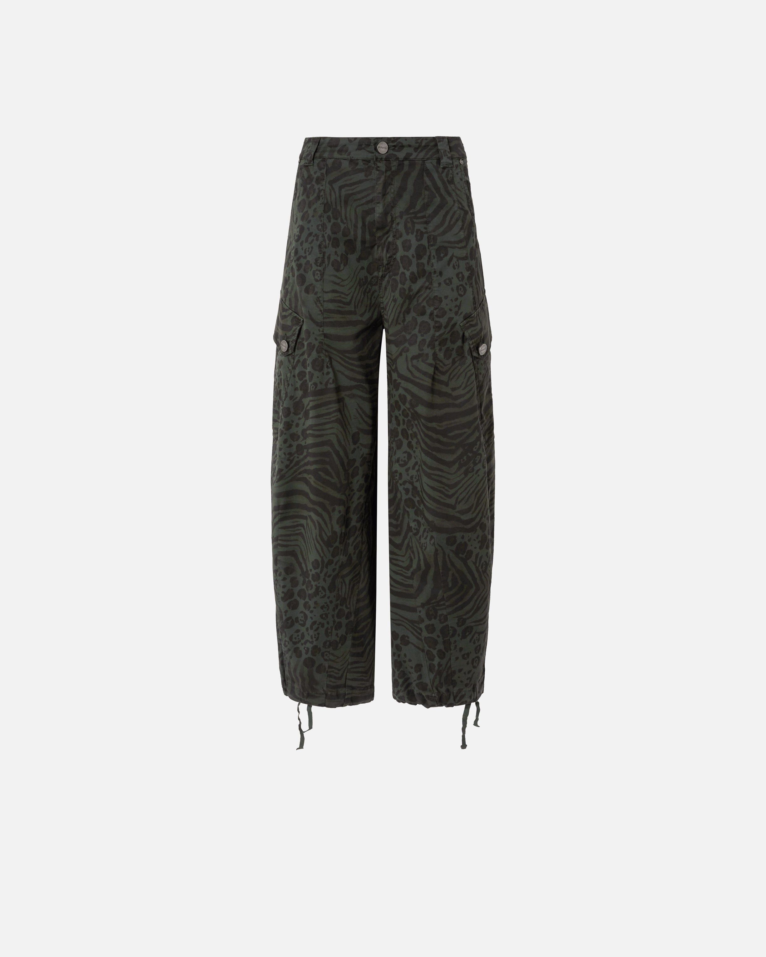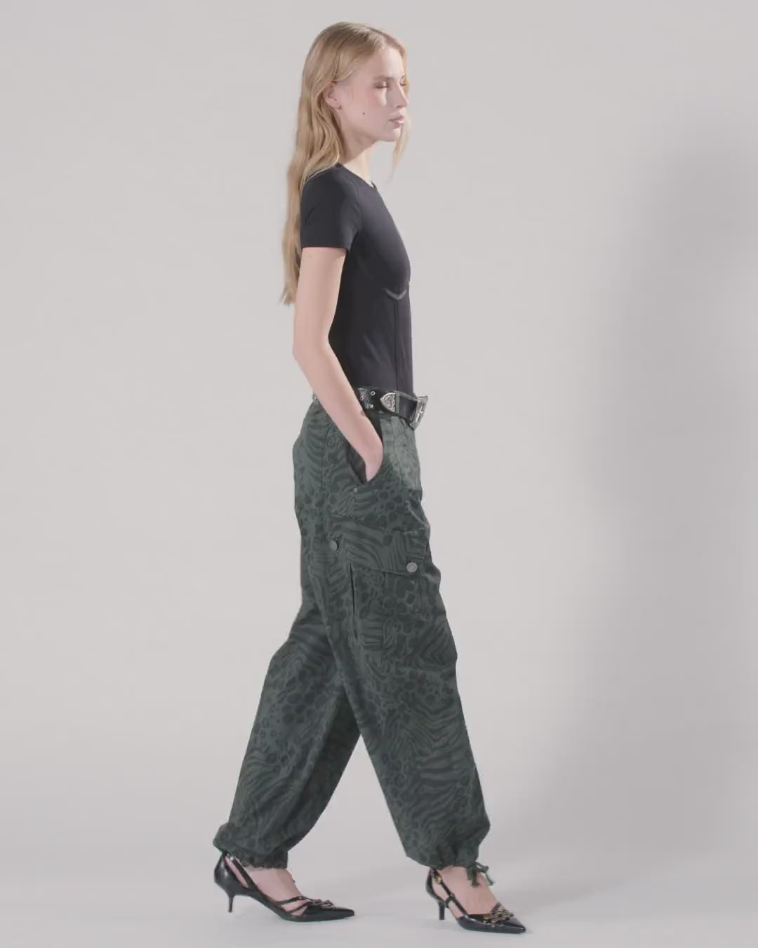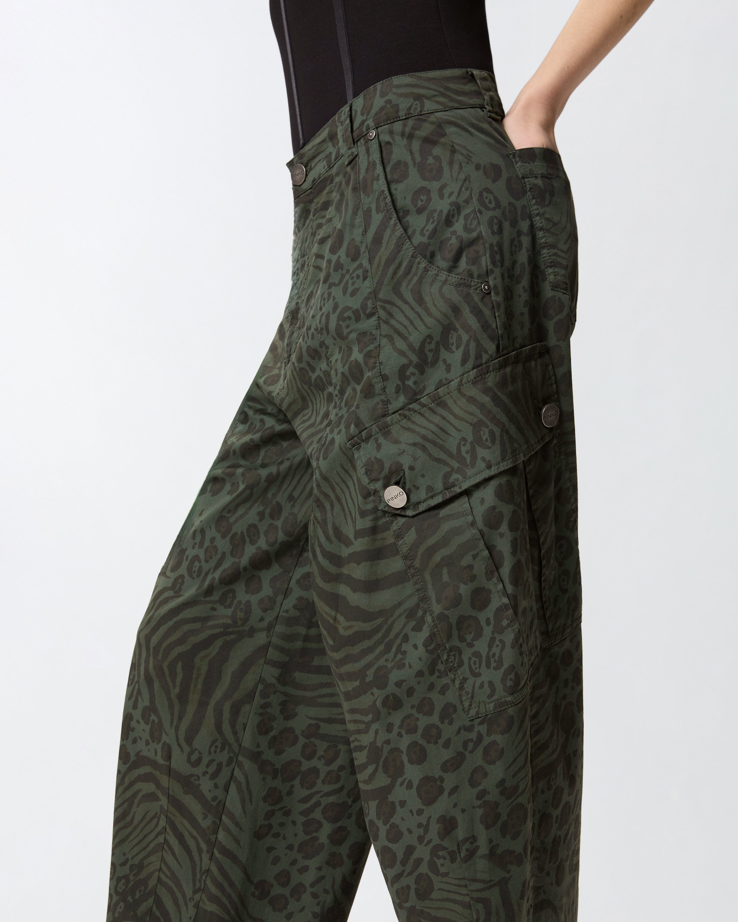 Spodnie balonowe z wygodnego i świeżego elastycznego płótna bawełnianego, z nadrukiem na całej powierzchni z różnymi motywami cętek, wykonanymi przy użyciu odpowiedzialnych środowiskowo technik cyfrowych, które nie wymagają użycia wody. Odzież ma na bokach wpuszczane skośne kieszenie, dwie naszywane kieszenie z tyłu i dwie kieszenie na nogawkach w stylu odzieży roboczej z klapką i guzikami, a także praktyczne troczki u dołu nogawki do regulacji i personalizacji. Podszewka z czystej bawełny zapewnia większą wygodę podczas zakładania. Te designerskie spodnie PINKO są gotowe, aby wzbogacić twoje codzienne letnie stylizacje odrobiną odważnej i drapieżnej elegancji.