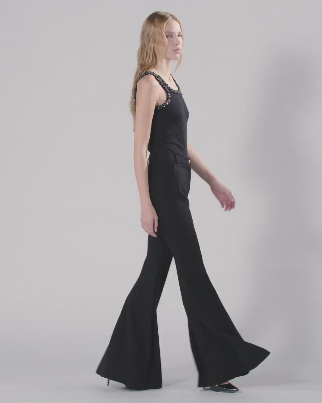Elastyczne spodnie o kroju flare wykonane z technicznej tkaniny wiskozowej o dzianinowym splocie. Model z wysokim stanem, z dopasowaną linią do połowy nogawki i rozszerzaną ku dołowi, dopełnieniem są szlufki, kieszenie z ramką z tyłu oraz zapięcie z przodu na metalowy guzik ozdobiony gwiazdką i zakryty zamek.
