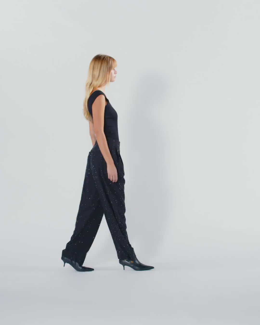 Spodnie damskie wykonane z lejącego materiału z elastycznej mieszanki wiskozy z barwionej nitki, ozdobione świecącymi aplikacjami z kryształków, zarówno z przodu, jak i z tyłu, na całej długości ubrania. Szeroka linia nogawek podkreślona jest sartorialnymi zaszewkami w talii, które dodają objętości. Spodnie z kryształkami o sartorialnym kroju będą stanowić biznesowy look z biżuteryjnym akcentem, nadającym elegancji i stylu Twojemu wyglądowi. Noś je z marynarką z zestawu, aby uzyskać oryginalny i kobiecy strój na co dzień. Spodnie z niskim stanem posiadają skośne wpuszczane kieszenie na biodrach, kieszenie z ramką z tyłu, a także zapięcie na zamek i dwie haftki w pasie.