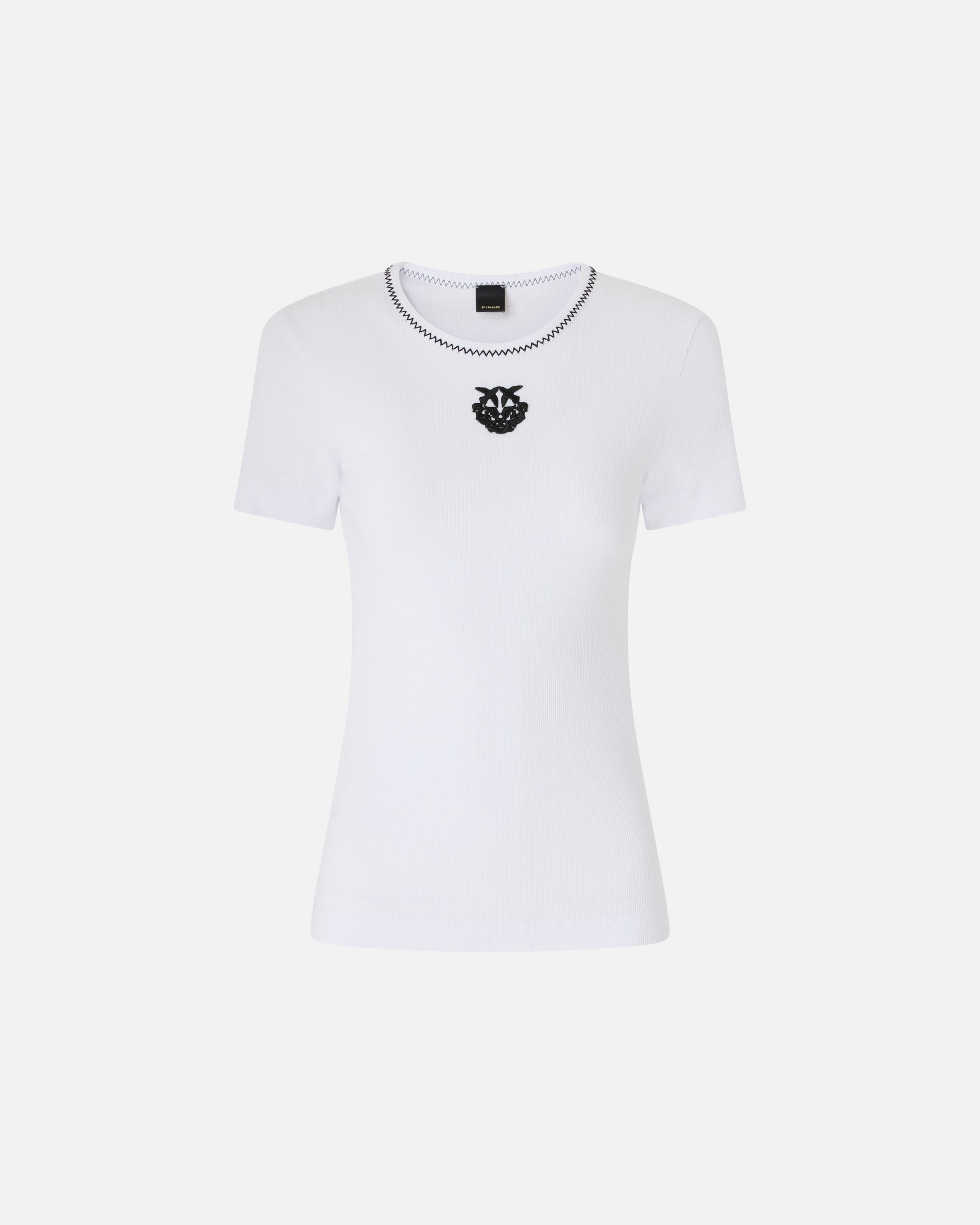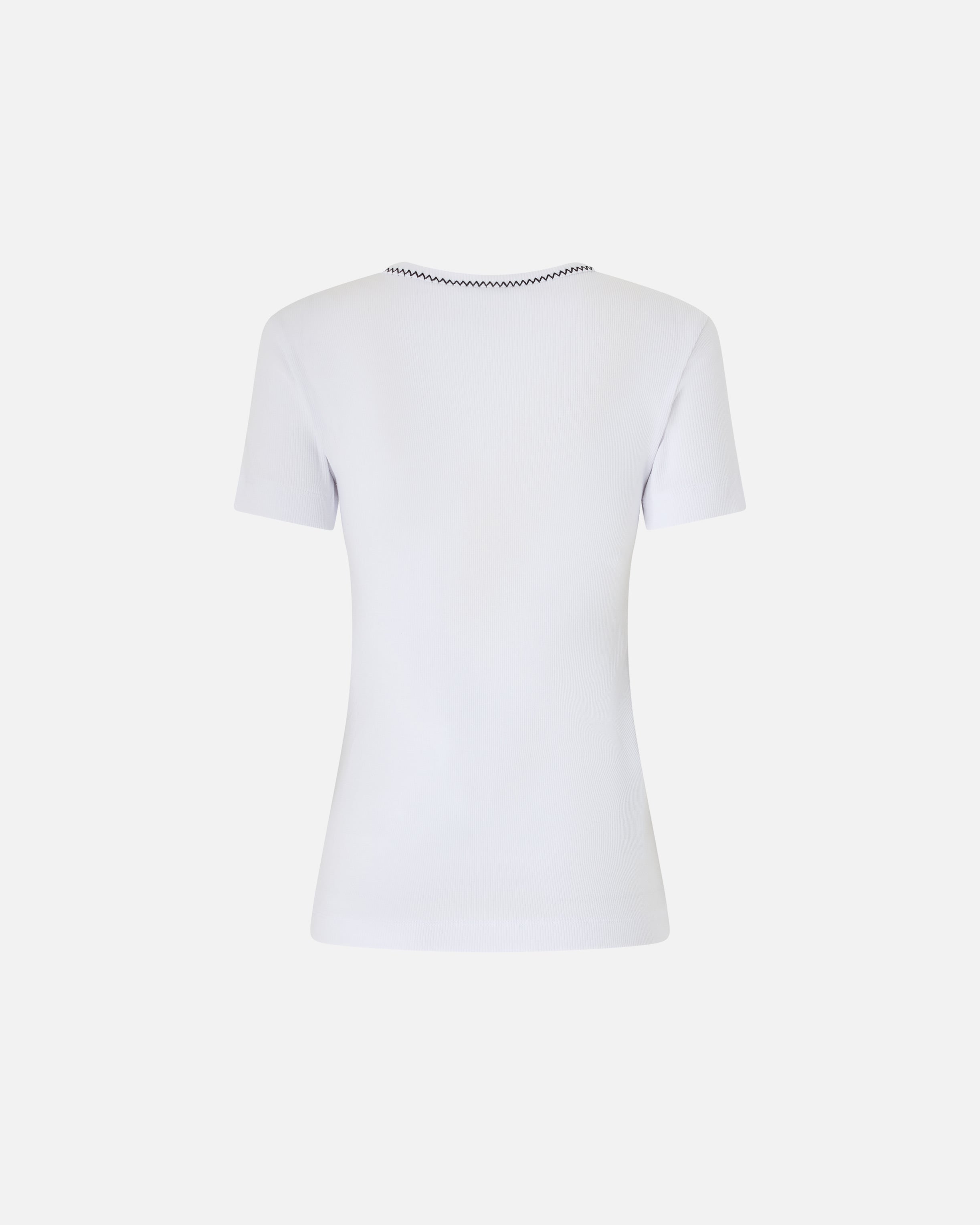 T-shirt z okrągłym dekoltem i krótkimi rękawami, uszyty z elastycznej bawełny o ściągaczowym splocie. Model charakteryzuje się kontrastowymi przeszyciami wzdłuż krawędzi dekoltu oraz haftem na piersi, również kontrastującym z logo Love Birds w kowbojskim stylu. Praktyczny, oryginalny i w niepowtarzalnym stylu, więc będzie towarzyszyć ci zawsze i wszędzie.