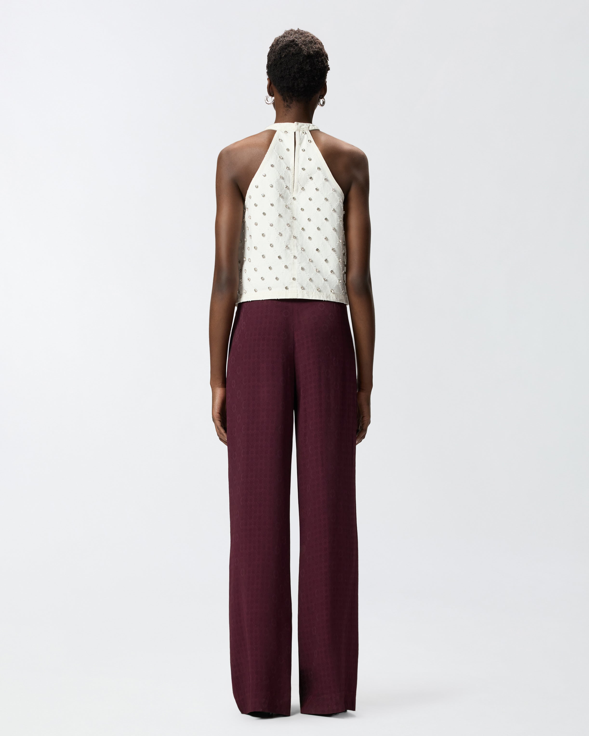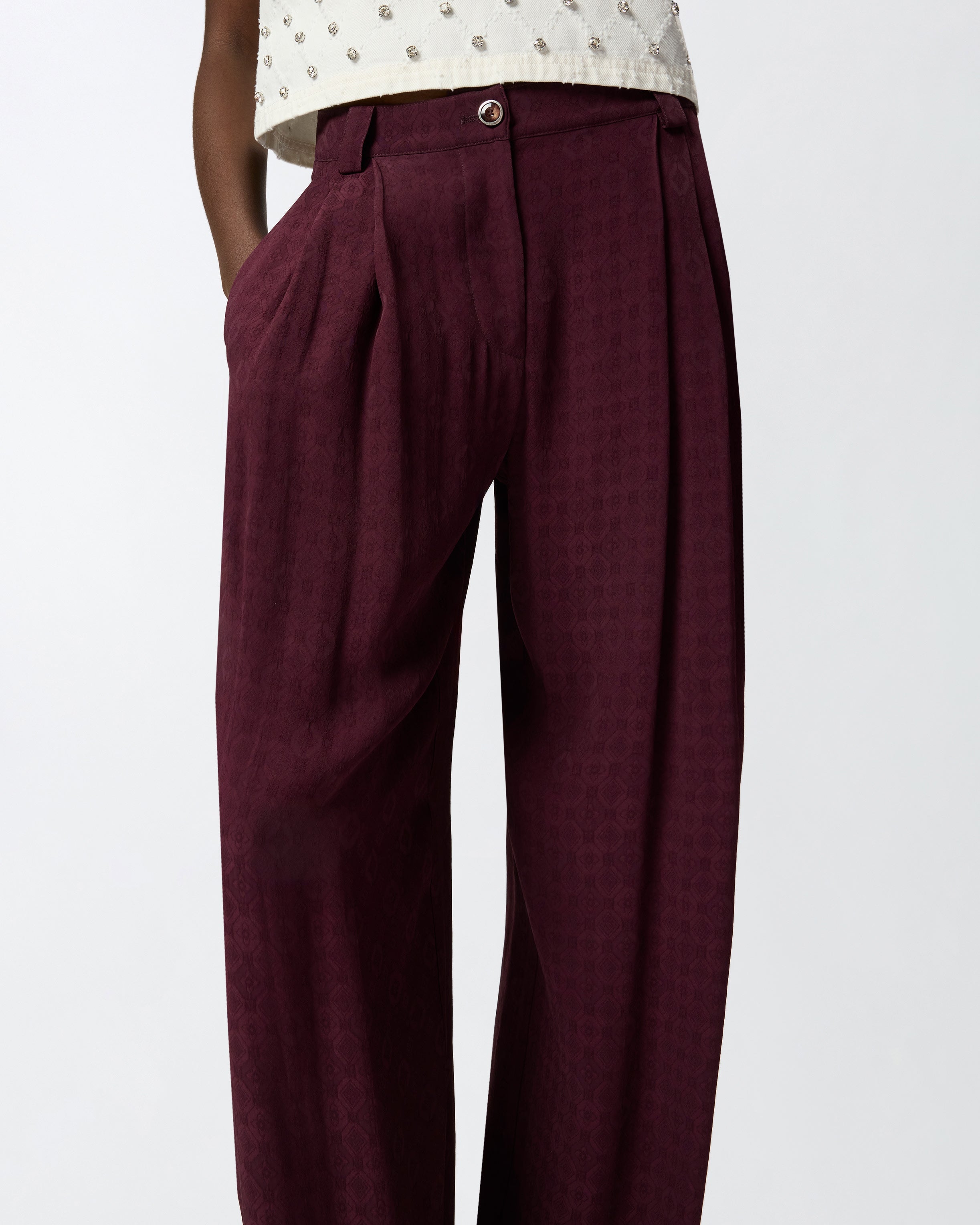 Spodnie uszyte z żakardowej tkaniny miękkiej i jedwabistej w dotyku, charakteryzują się wyrafinowanym wzorem krawata na całej powierzchni. Model o drapowanej, lejącej linii, wykończony szlufkami, bocznymi kieszeniami oraz zapięciem na zamek i guzik. Połącz te spodnie z żakietem od kompletu, aby stworzyć kobiecy total look idealny na formalne okazje, lub załóż je z bardziej swobodną bluzką, aby zróżnicować stylizację. - RUTH TROUSERS